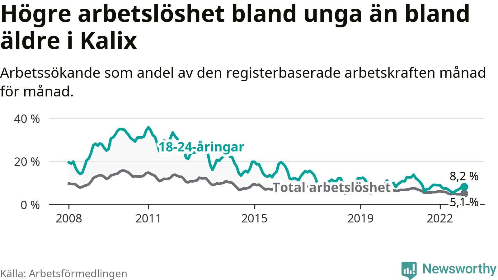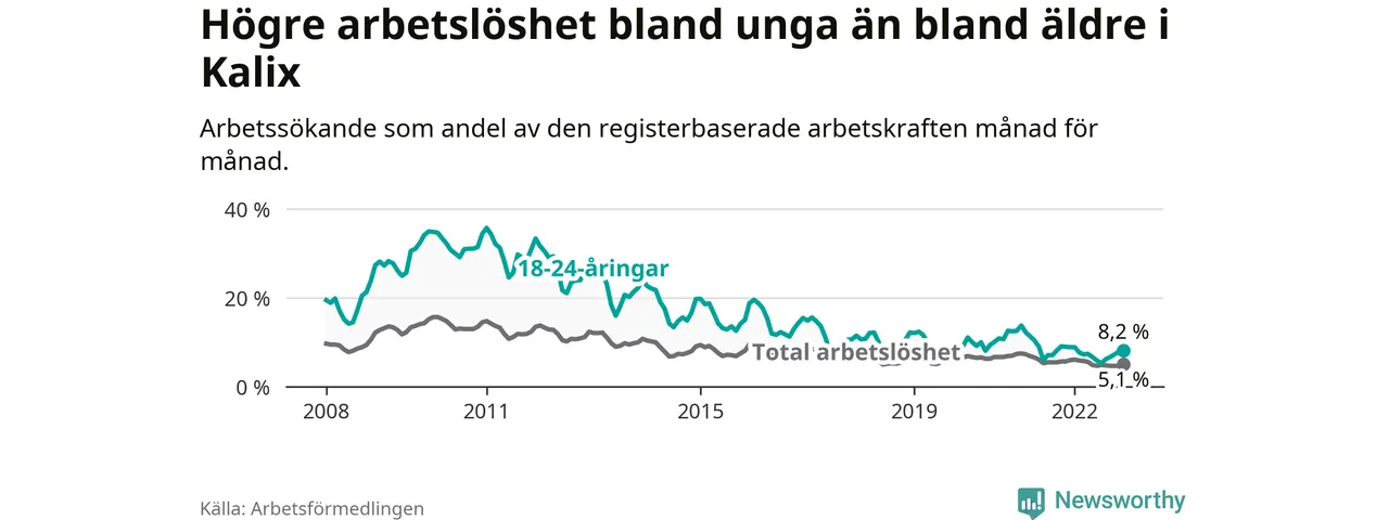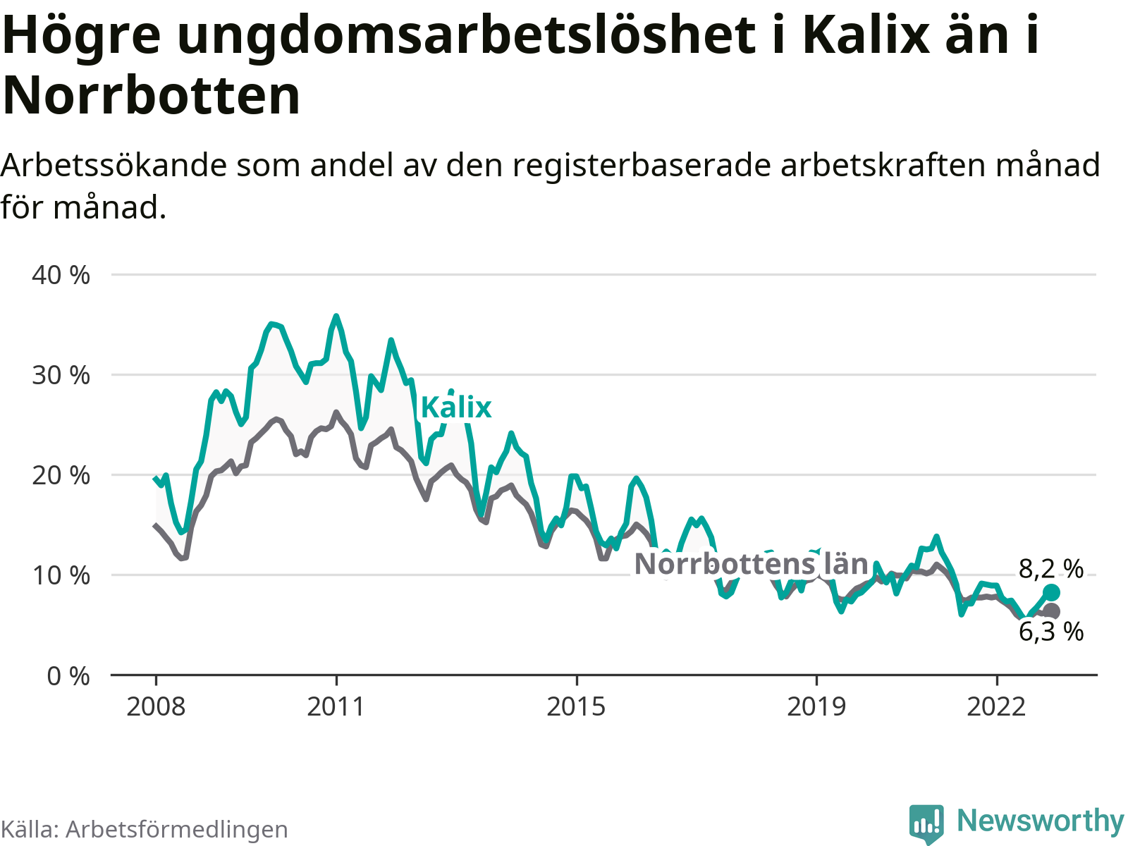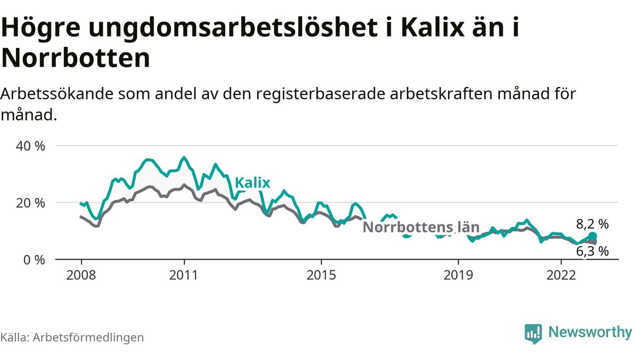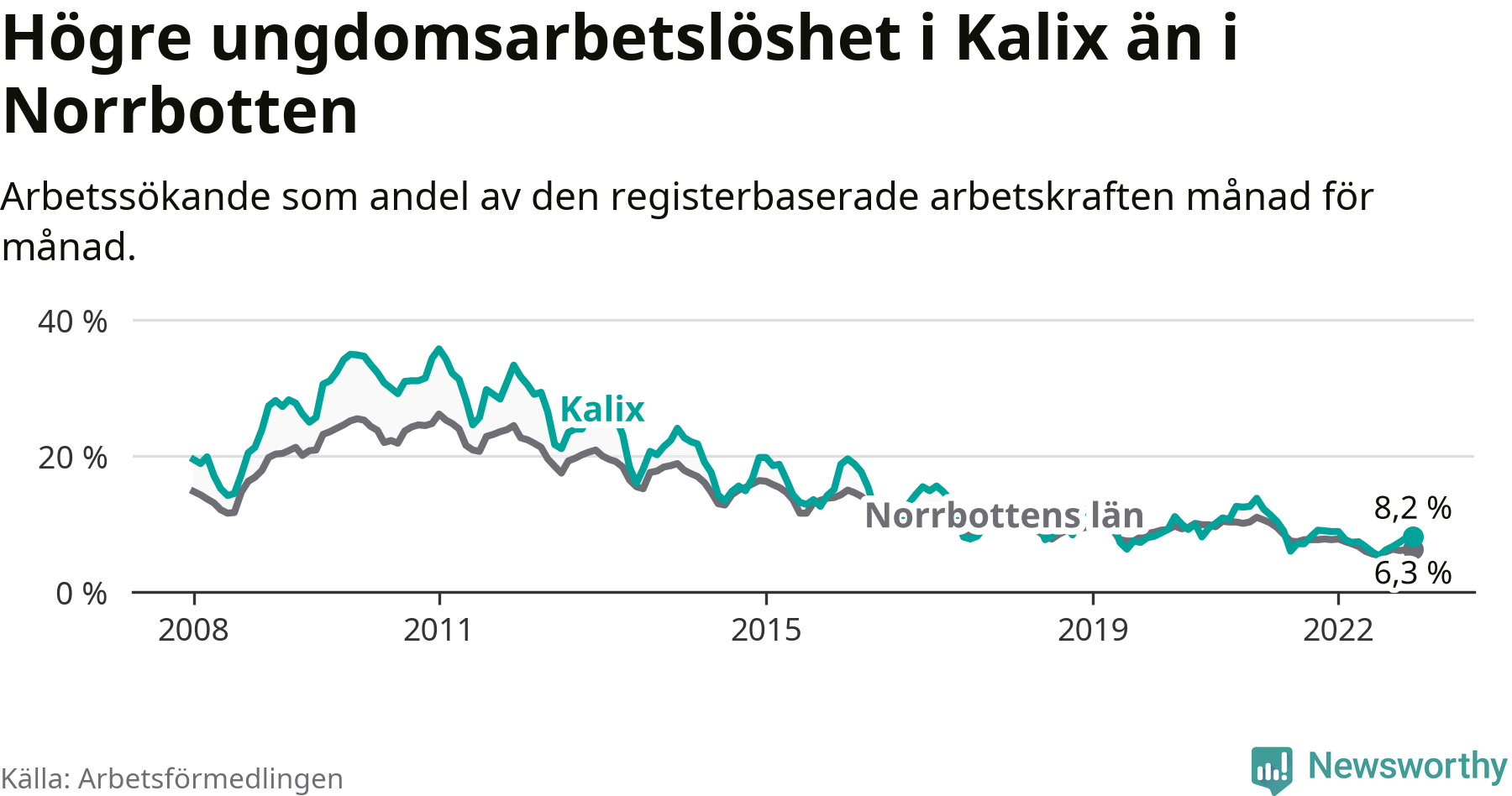 Precis som den totala arbetslösheten ligger ungdomsarbetslösheten i Kalix högre än i Norrbotten som helhet. Skillnaden mellan kommunen och länet är 1,9 procentenheter.