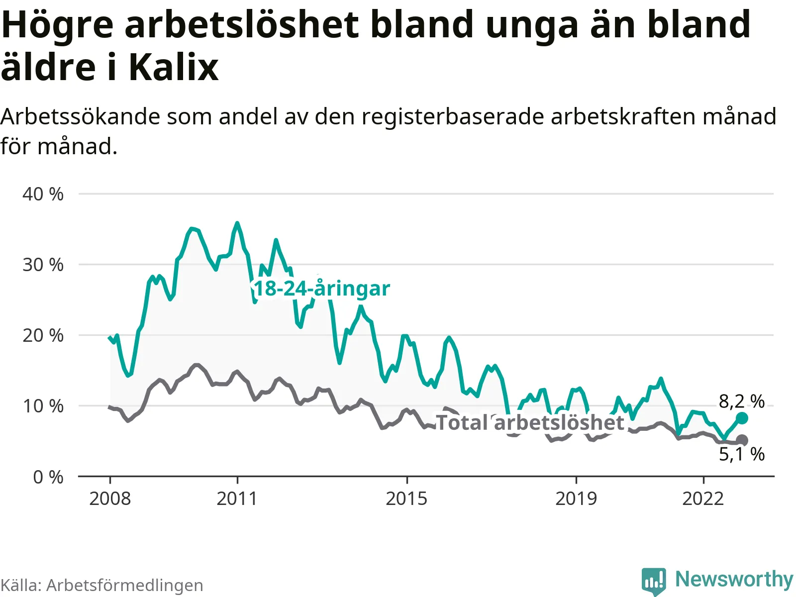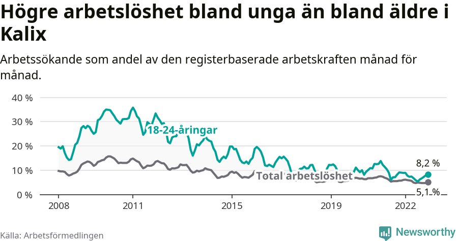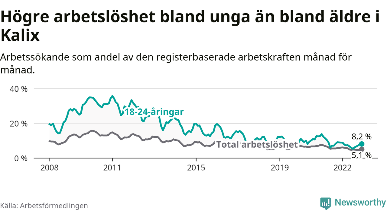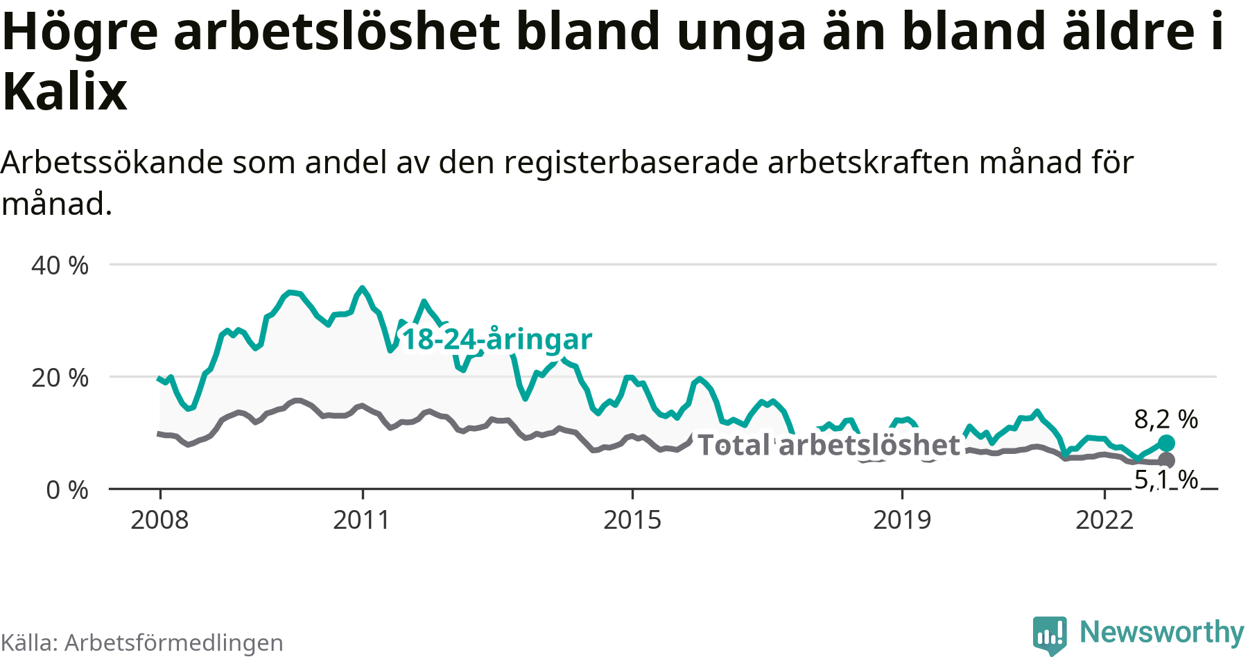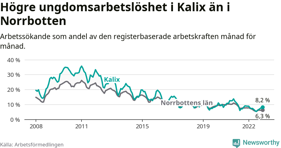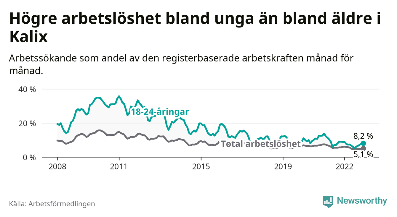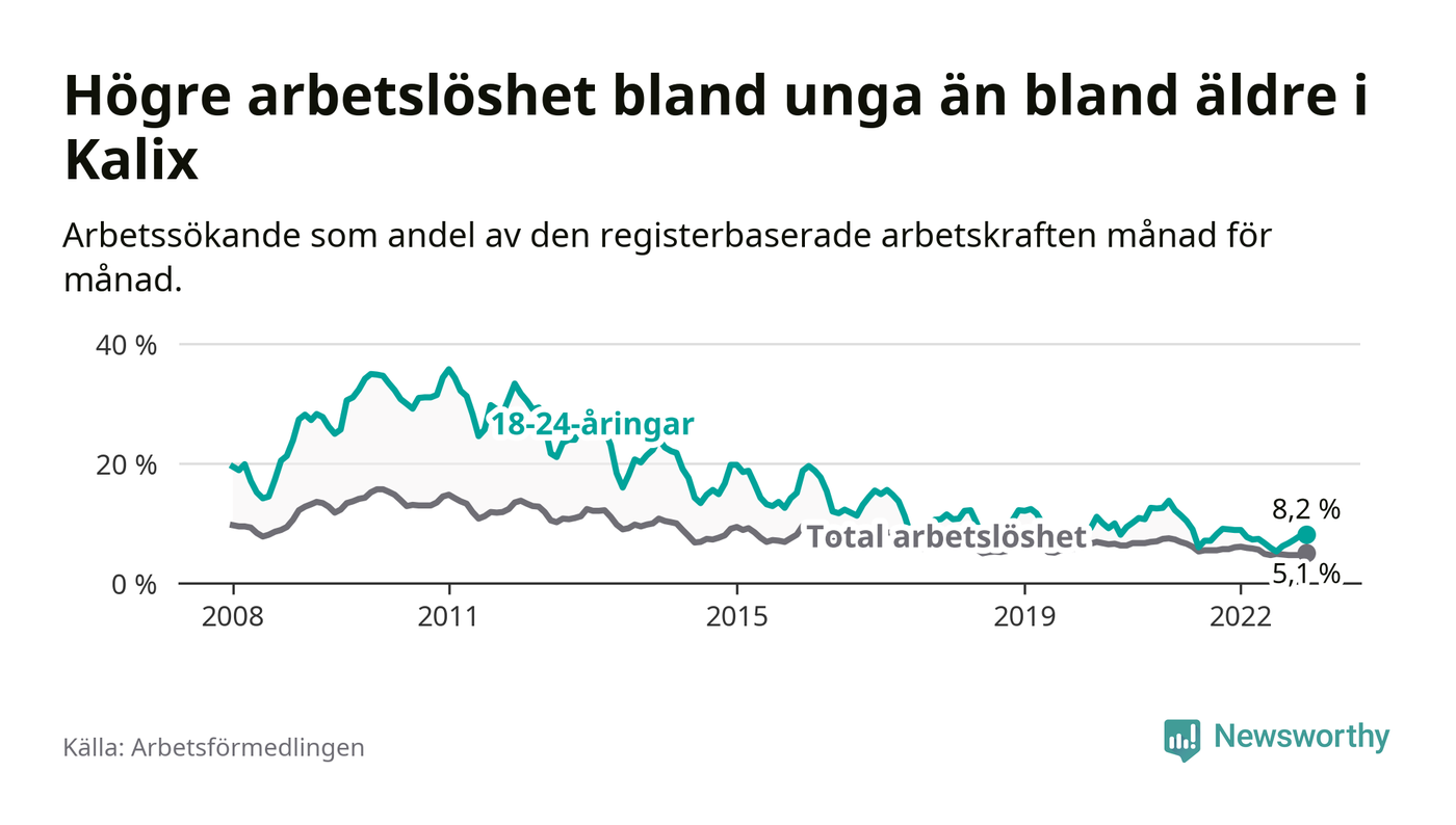 Precis som den totala arbetslösheten ligger ungdomsarbetslösheten i Kalix högre än i Norrbotten som helhet. Skillnaden mellan kommunen och länet är 1,9 procentenheter.
