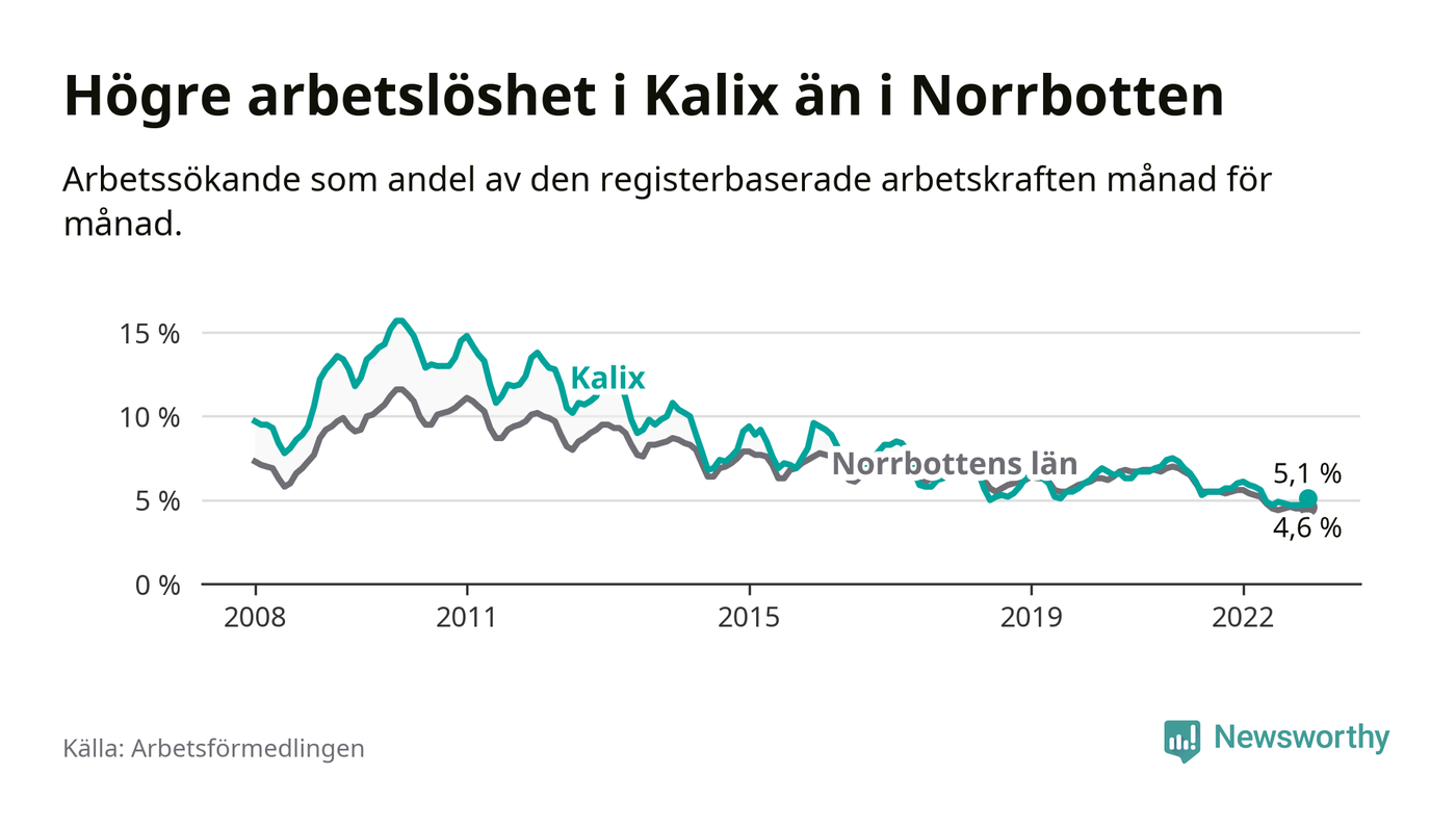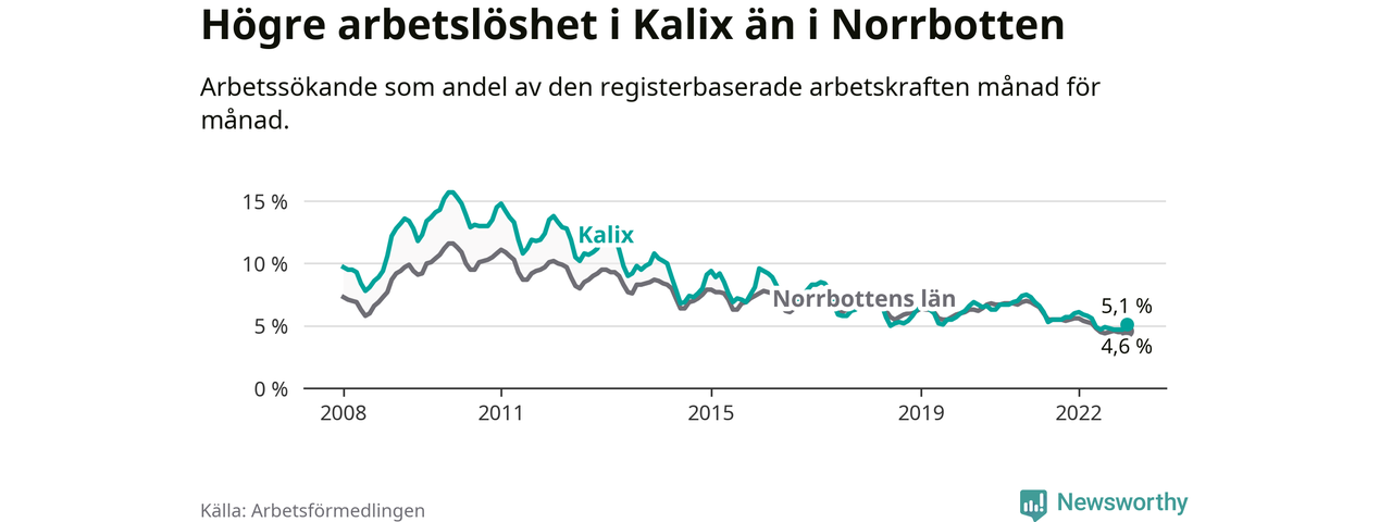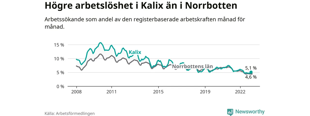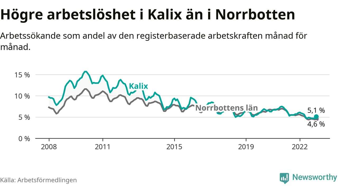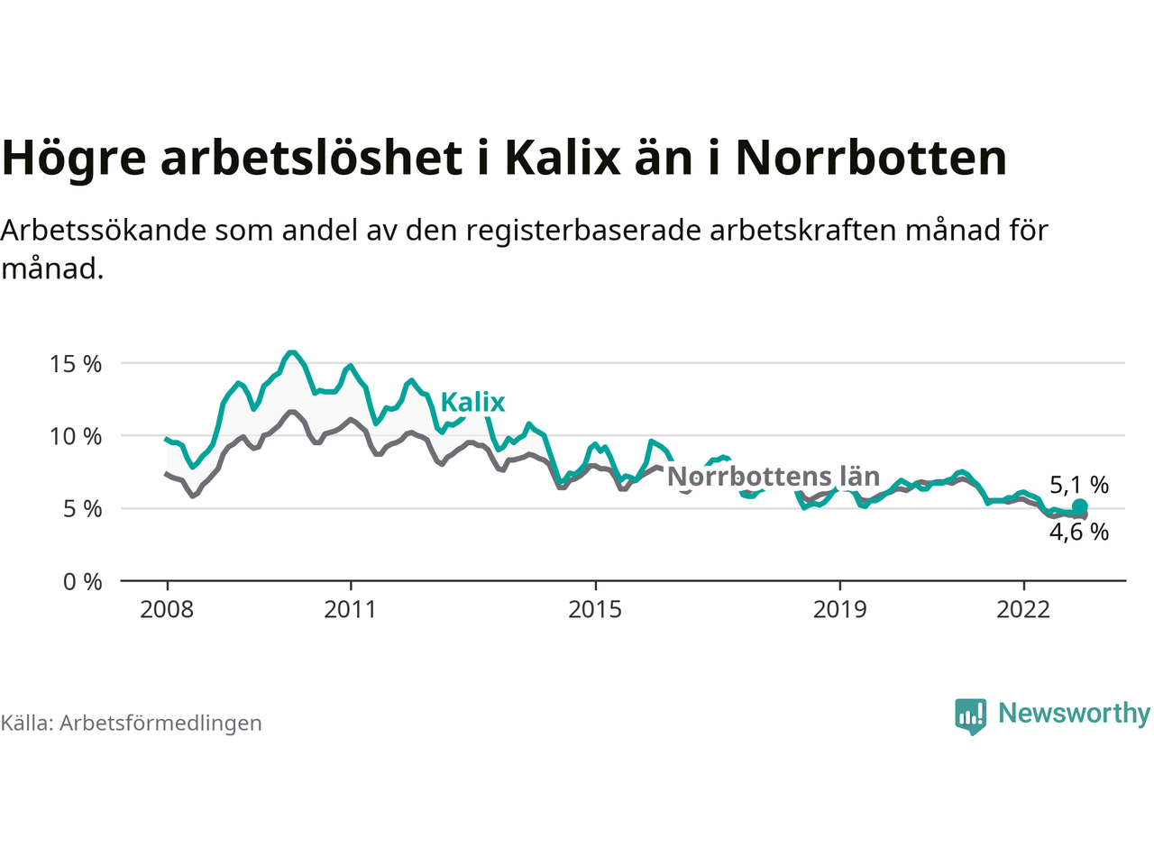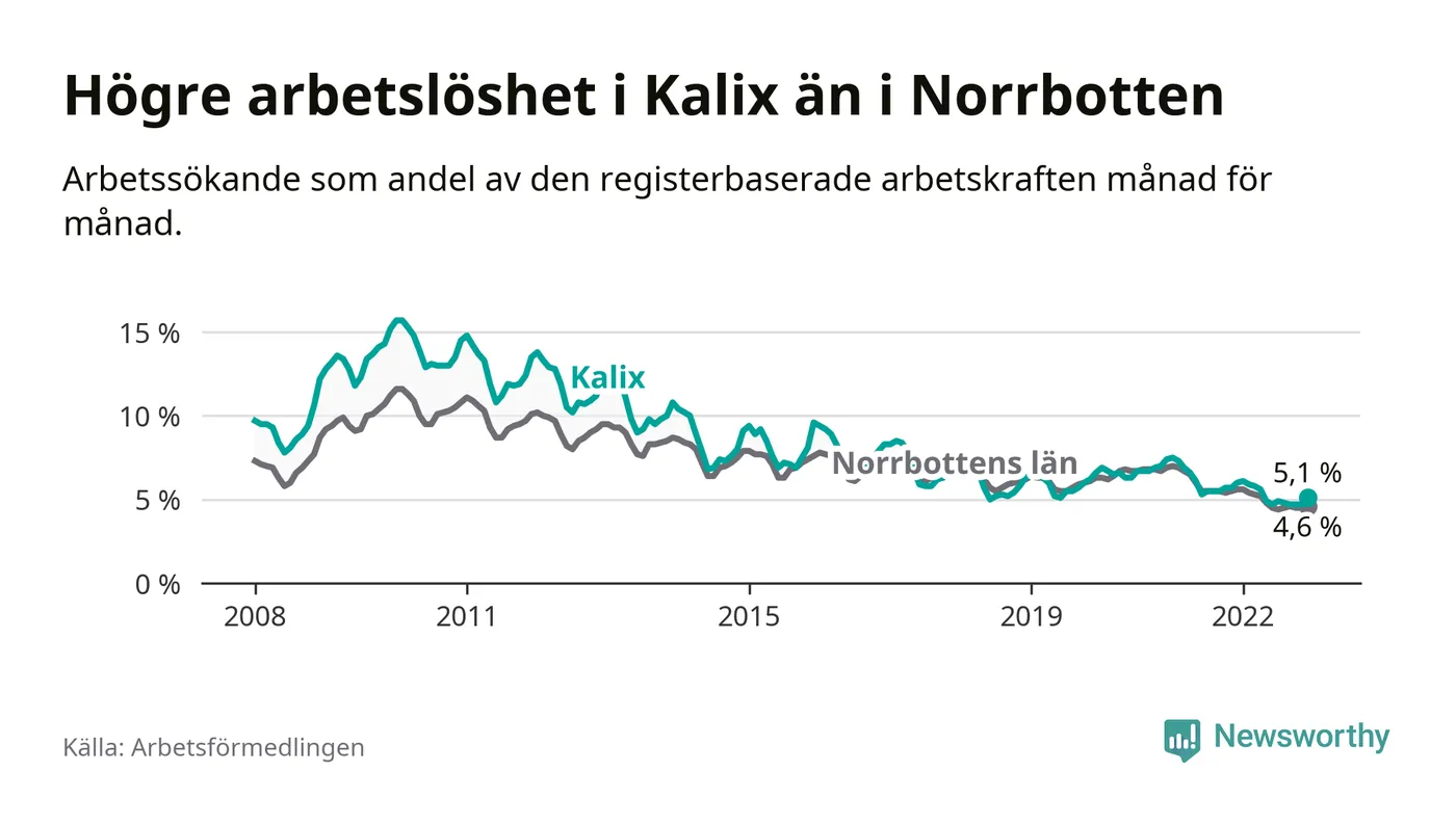 Det är 20:e månaden i följd som arbetslösheten i Kalix är lägre än den var under samma tidpunkt året innan. Sedan april 2021 har arbetslösheten gått ner från 6,6 till 5,1 procent.