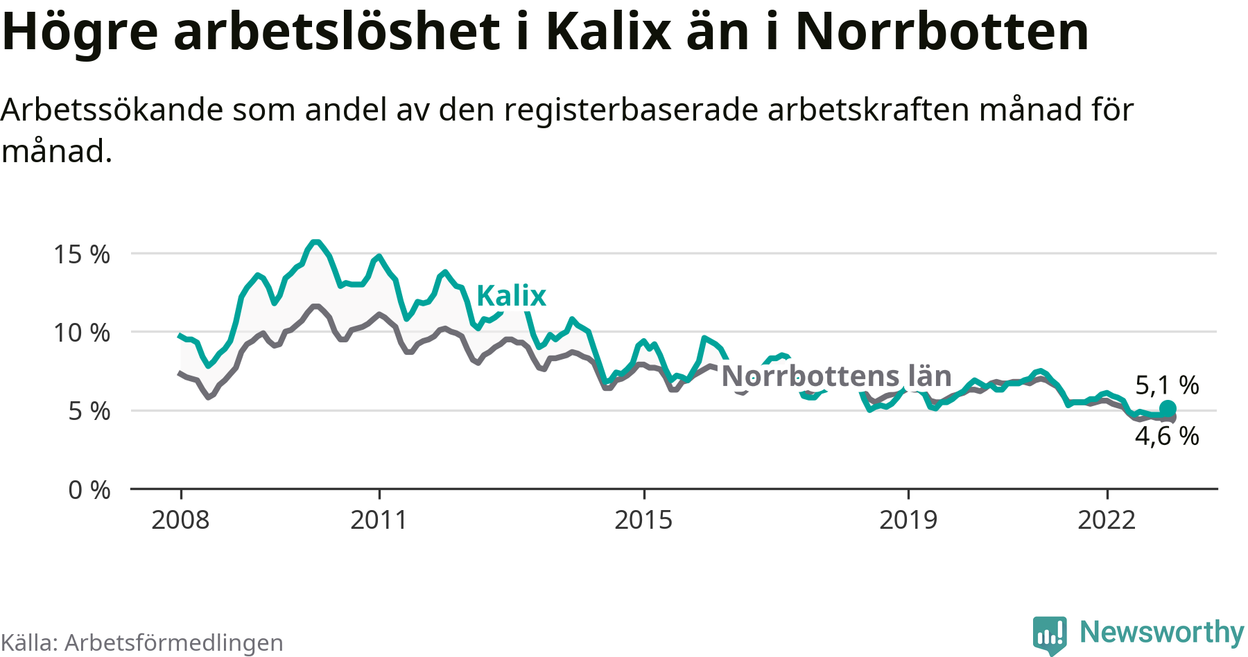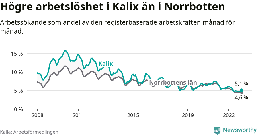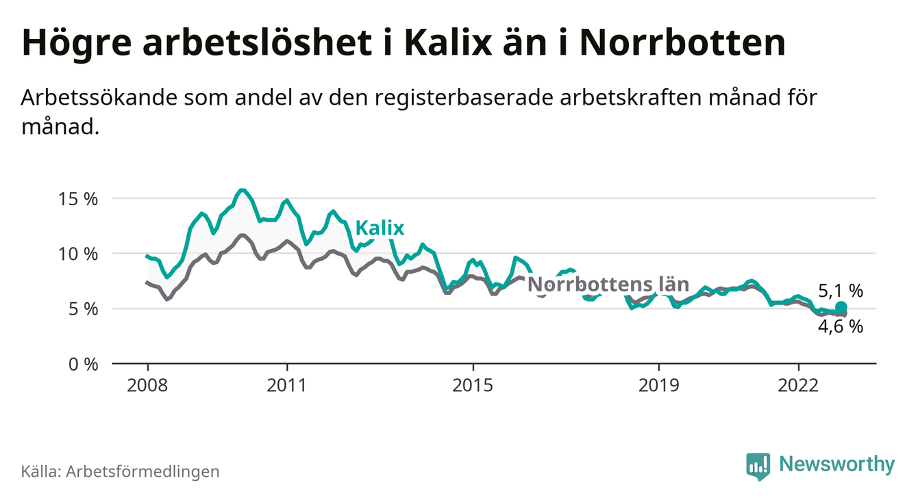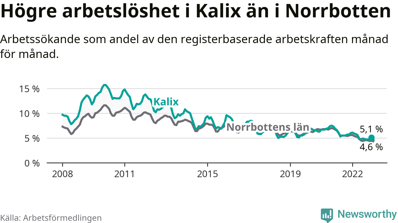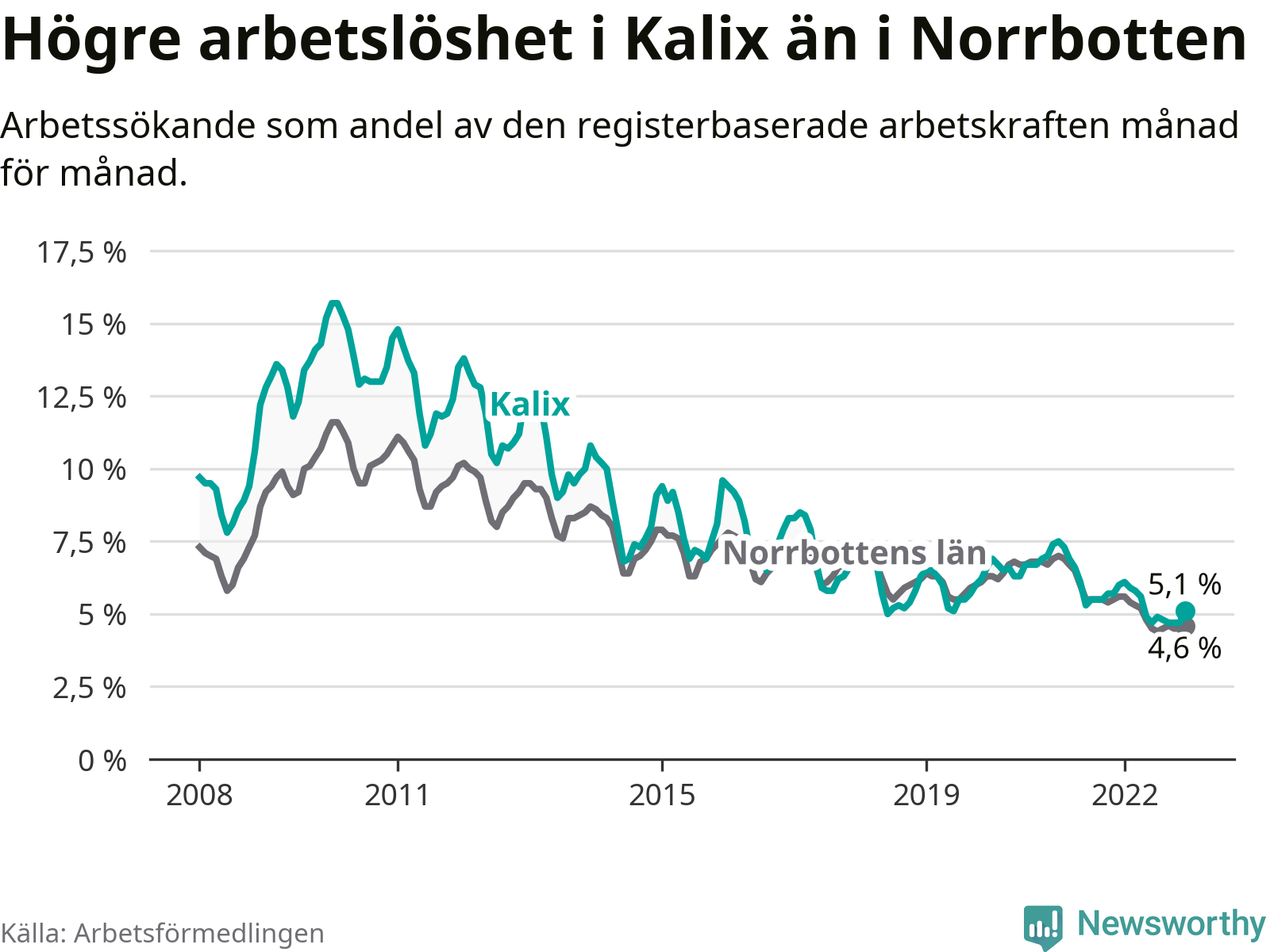 Det är 20:e månaden i följd som arbetslösheten i Kalix är lägre än den var under samma tidpunkt året innan. Sedan april 2021 har arbetslösheten gått ner från 6,6 till 5,1 procent.