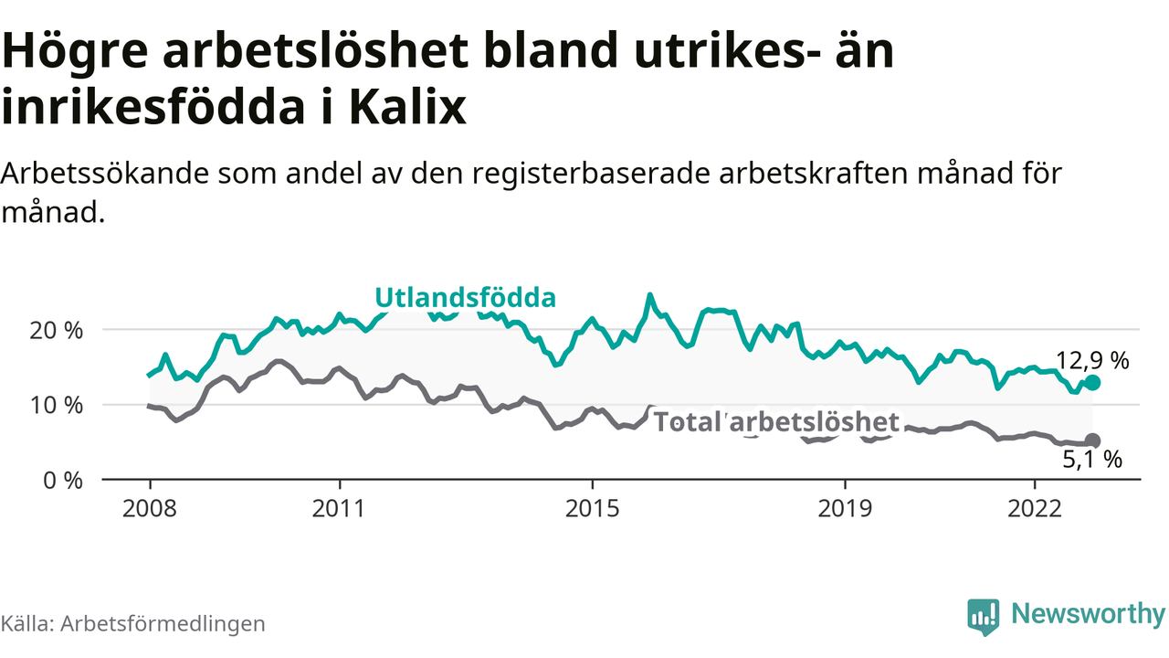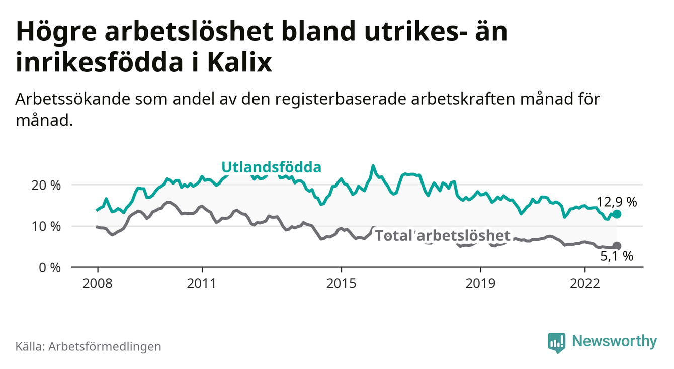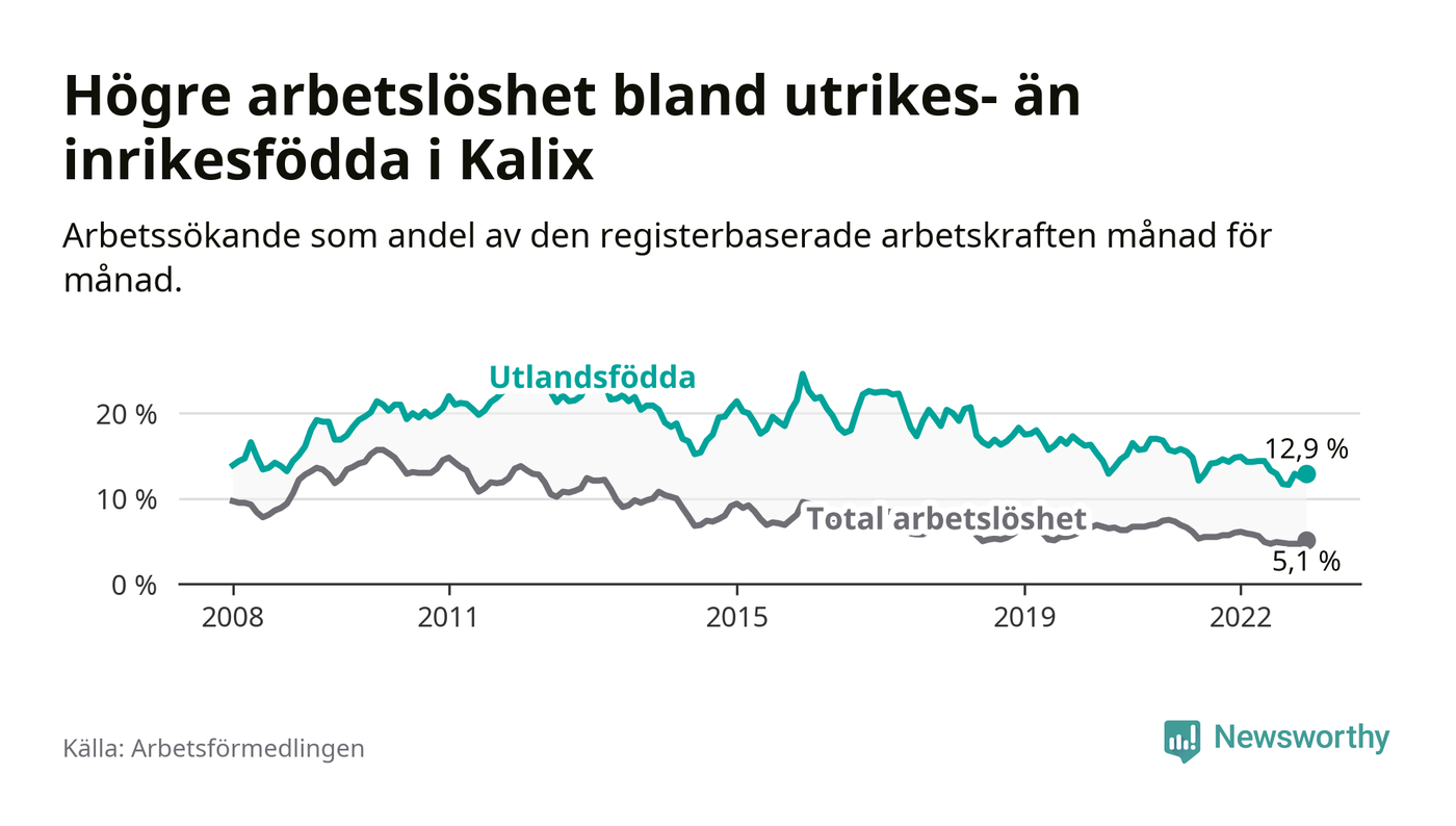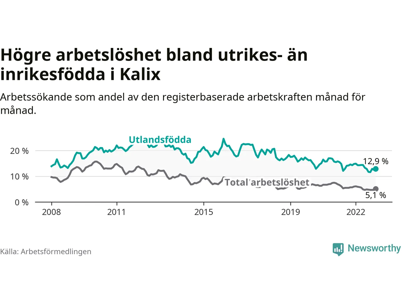 Arbetslösheten bland utlandsfödda var 12,9 procent i Kalix under december månad, motsvarande 106 av 822 personer. Det är 1,9 procentenheter färre än vid samma tidpunkt i fjol (−16 om man räknar personer).