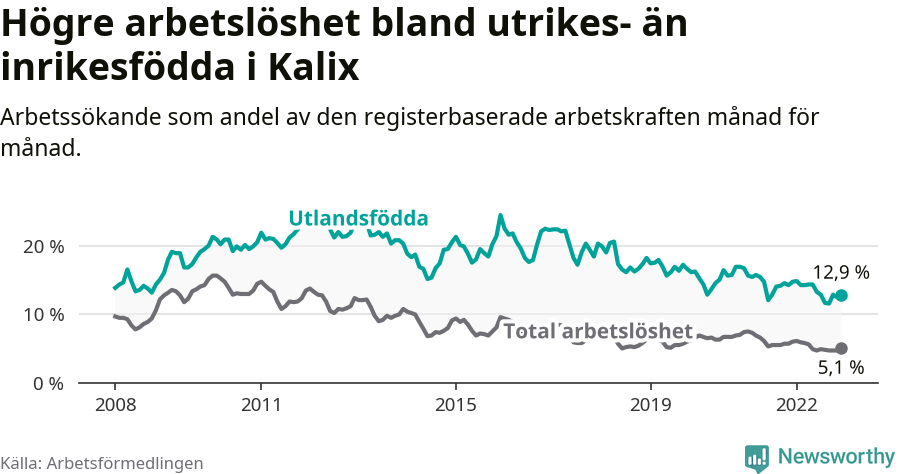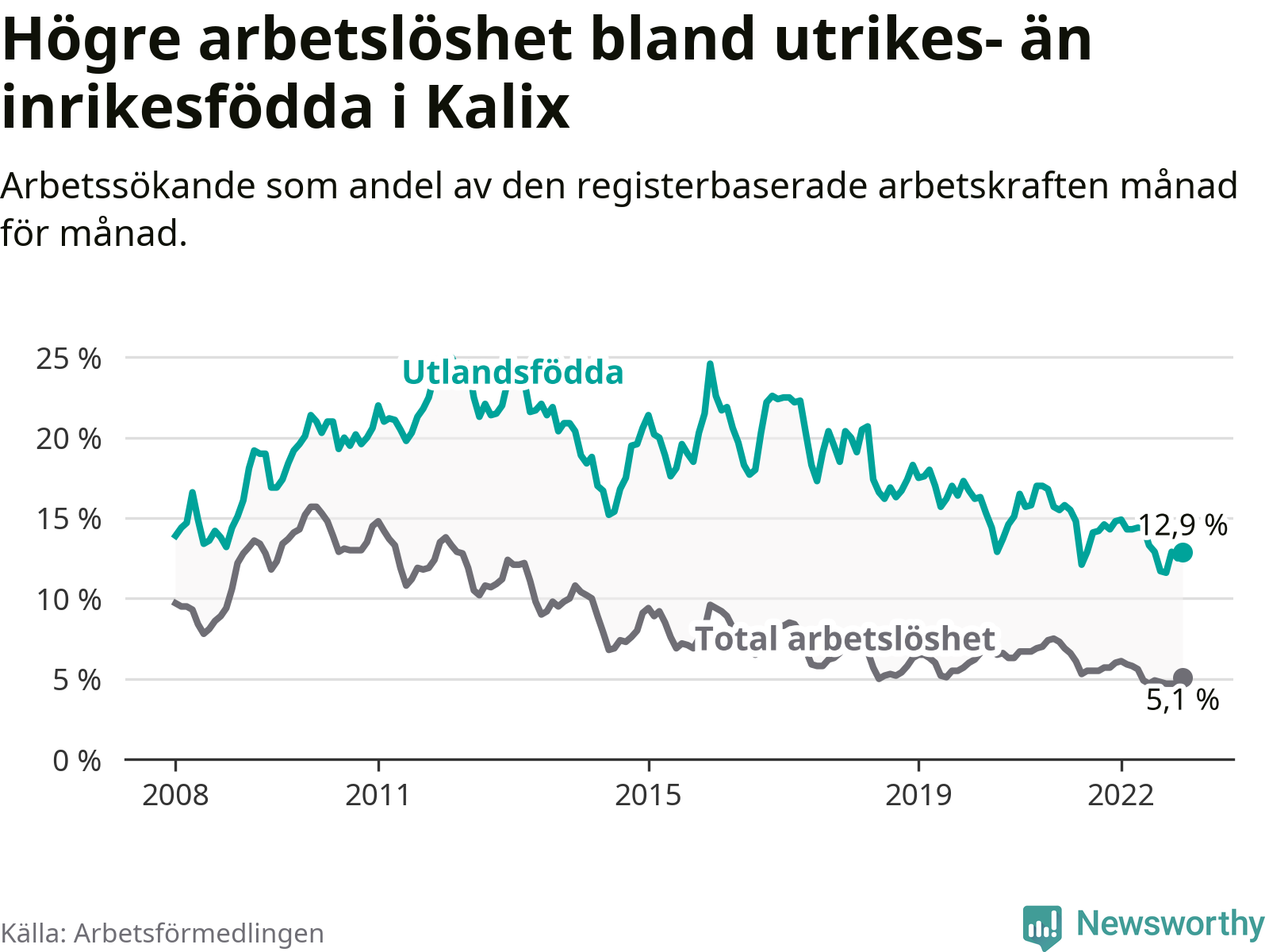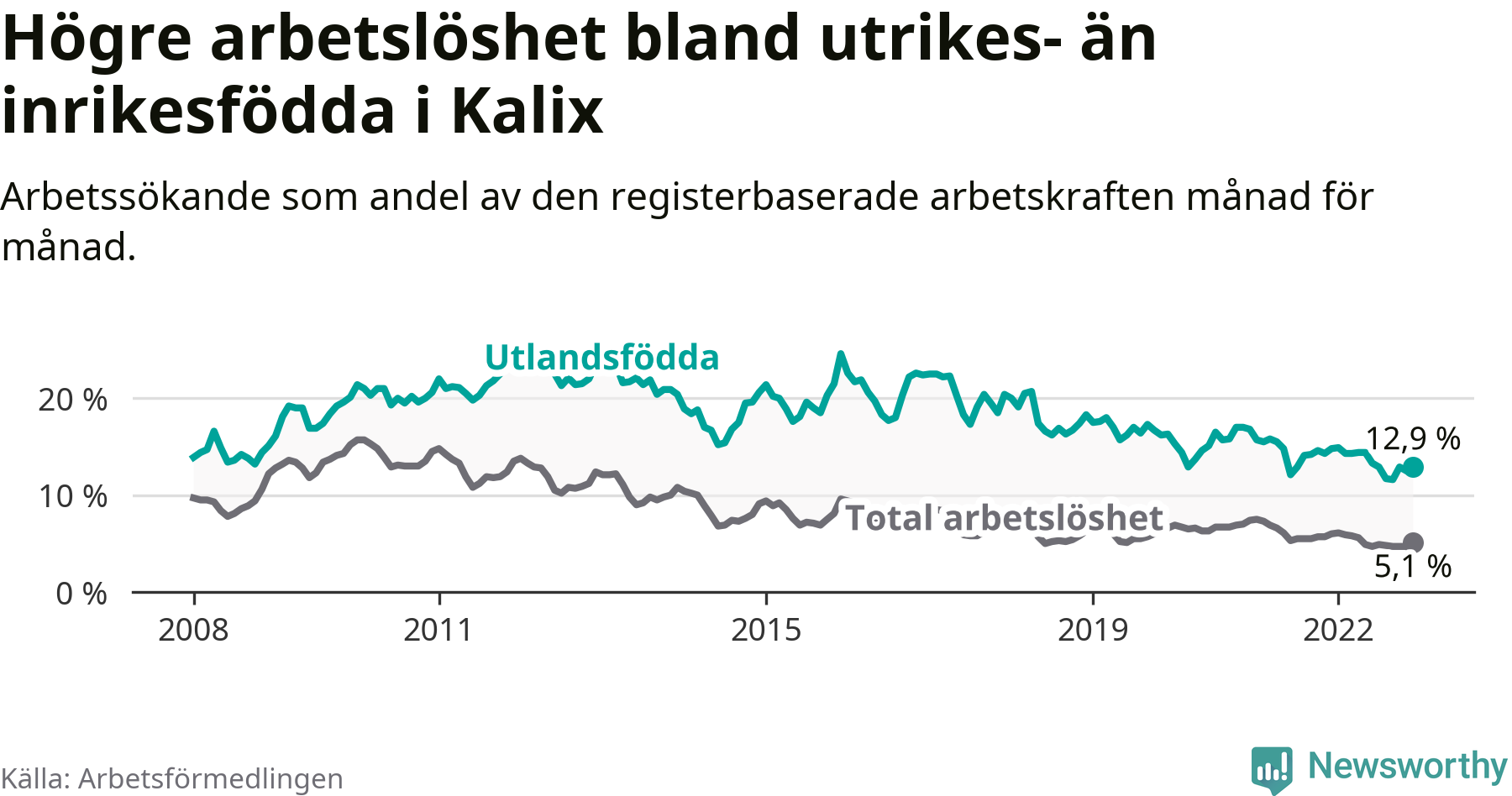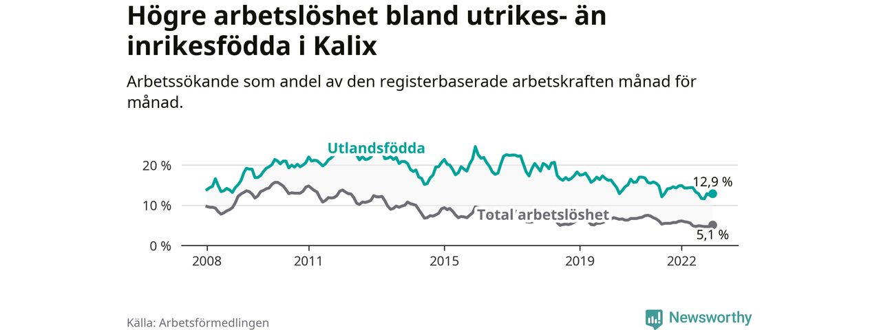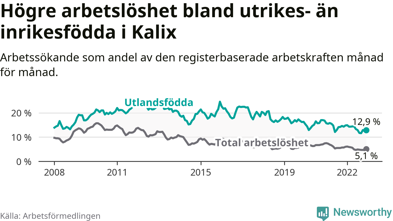 Arbetslösheten bland utlandsfödda var 12,9 procent i Kalix under december månad, motsvarande 106 av 822 personer. Det är 1,9 procentenheter färre än vid samma tidpunkt i fjol (−16 om man räknar personer).
