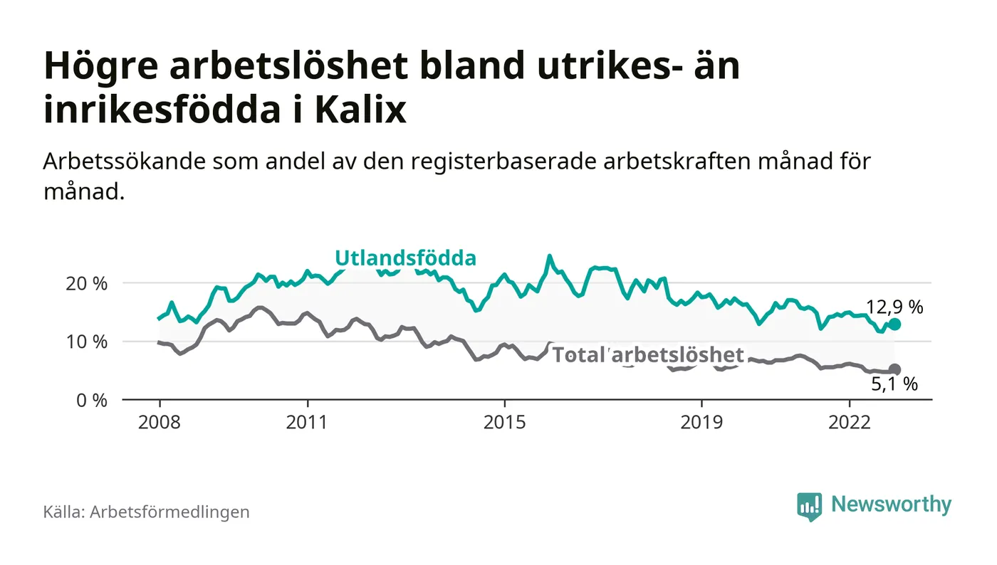 Skillnaden i arbetslöshet mellan utrikesfödda och hela befolkningen är 7,8 procentenheter i Kalix. Det är en mindre skillnad än för ett år sedan (−1,0 procentenheter).