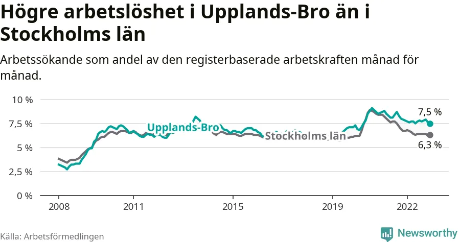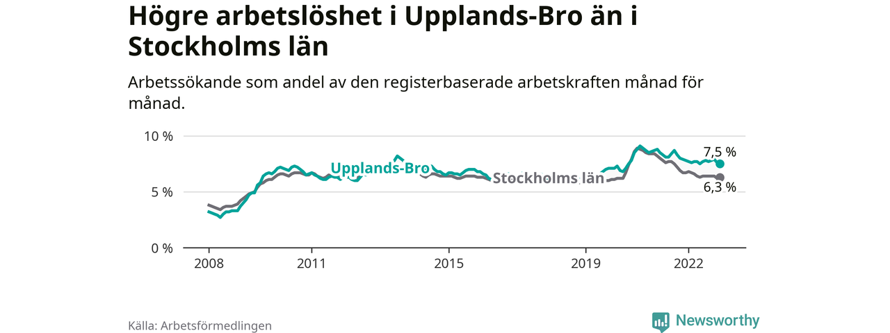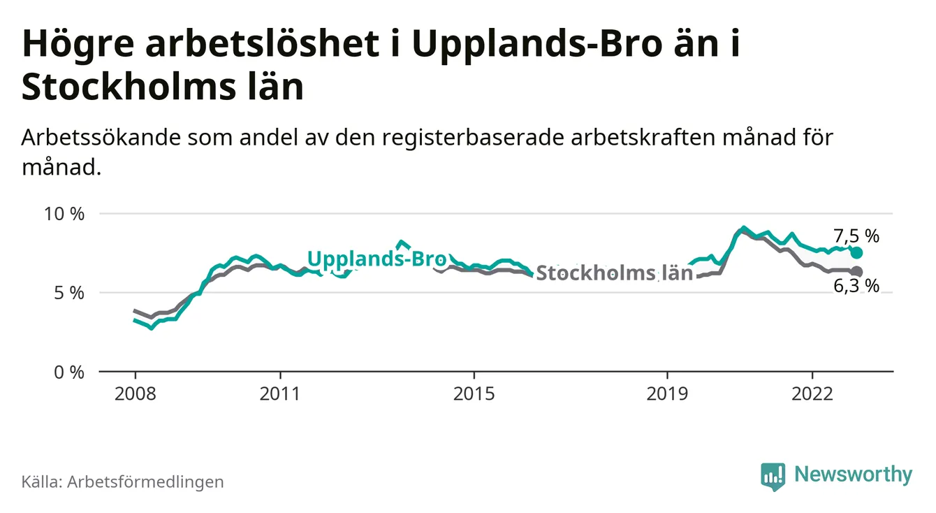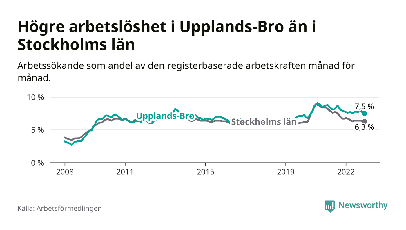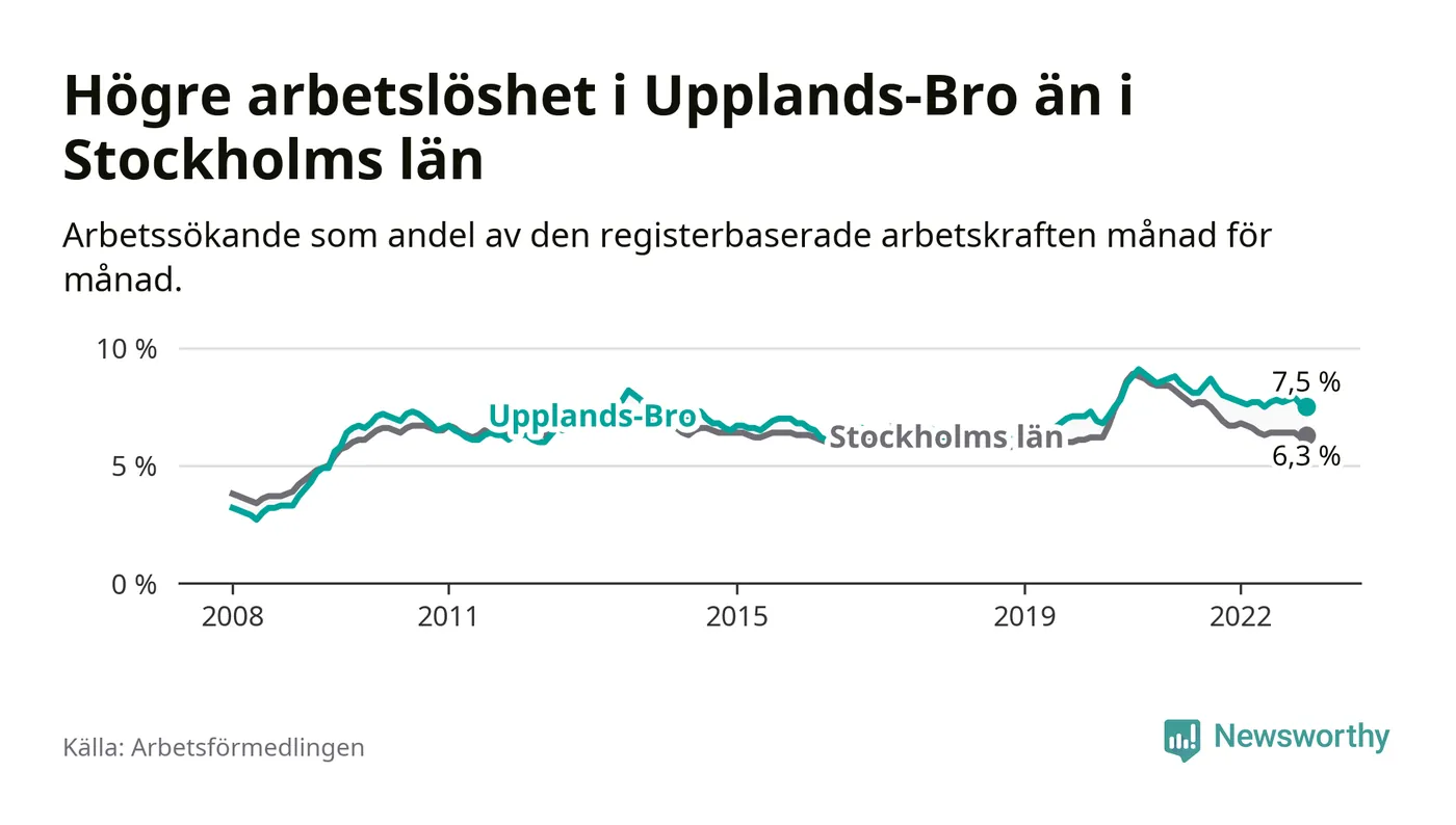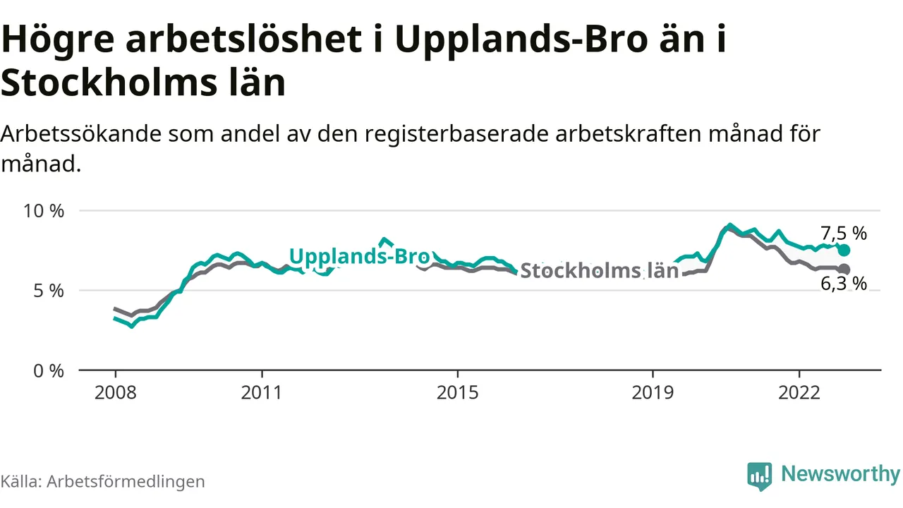 Graf: Arbetslöshet i Upplands-Bro kommun och Stockholms län