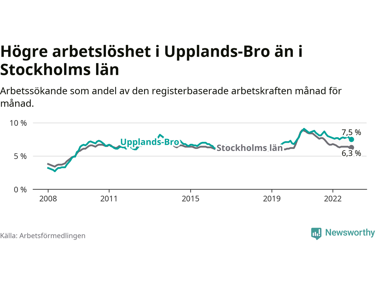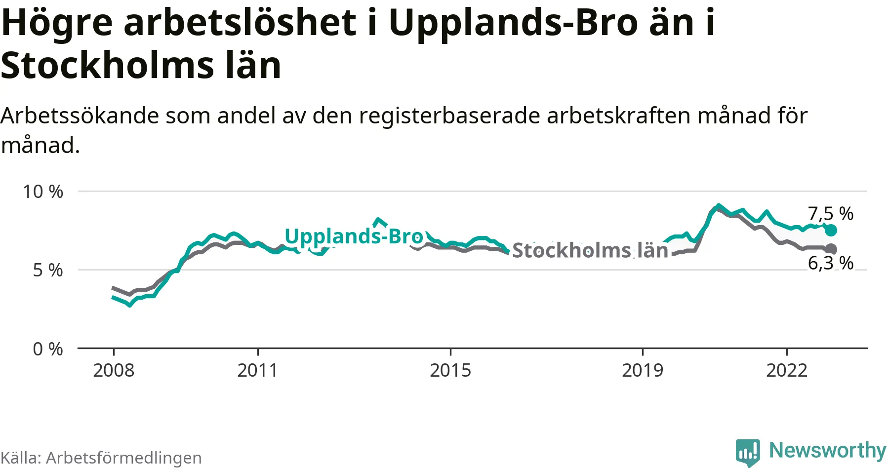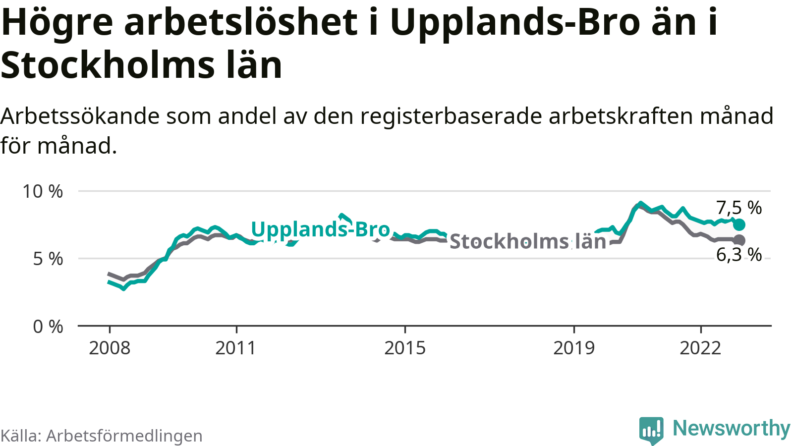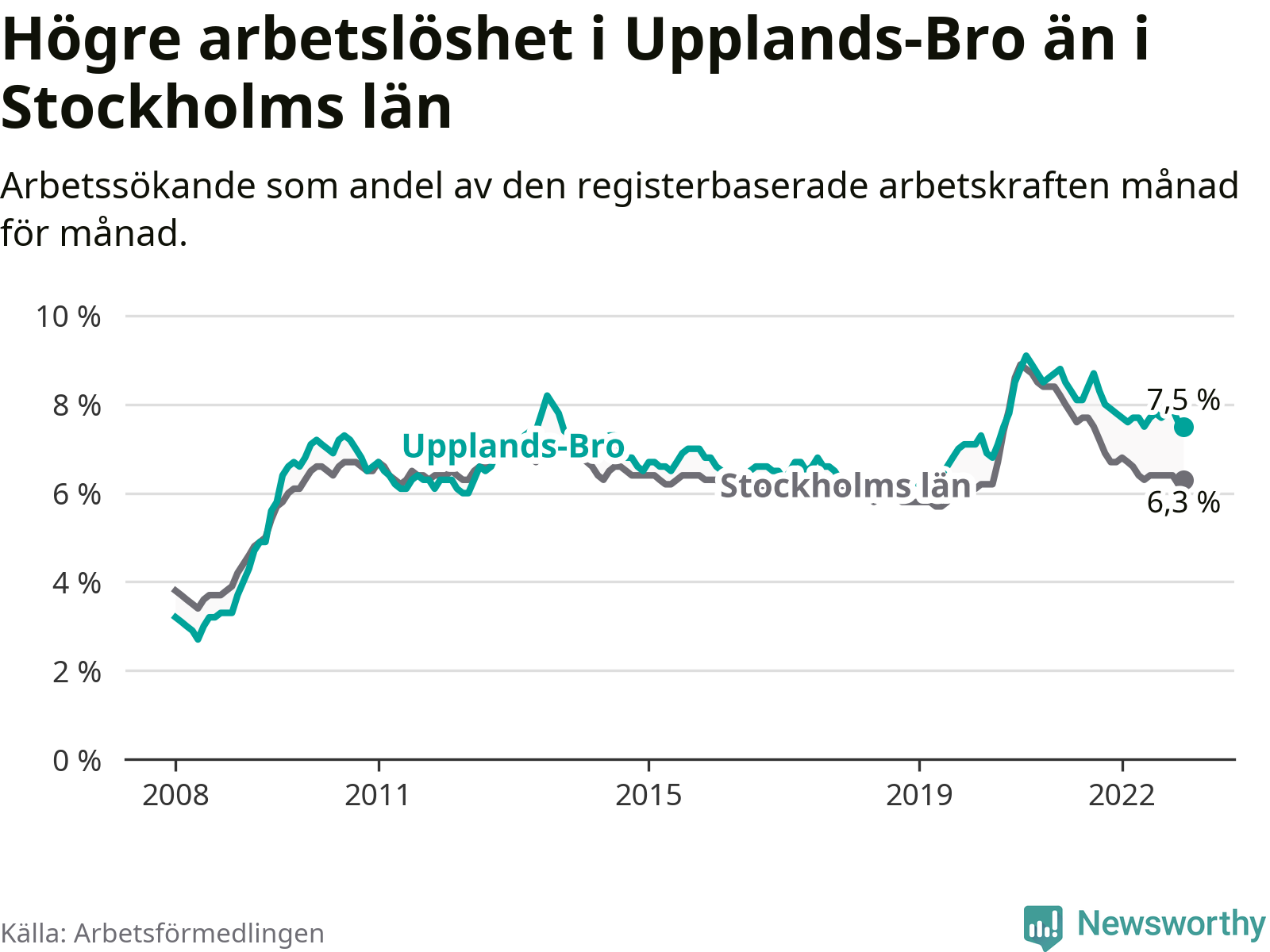 Graf: Arbetslöshet i Upplands-Bro kommun och Stockholms län