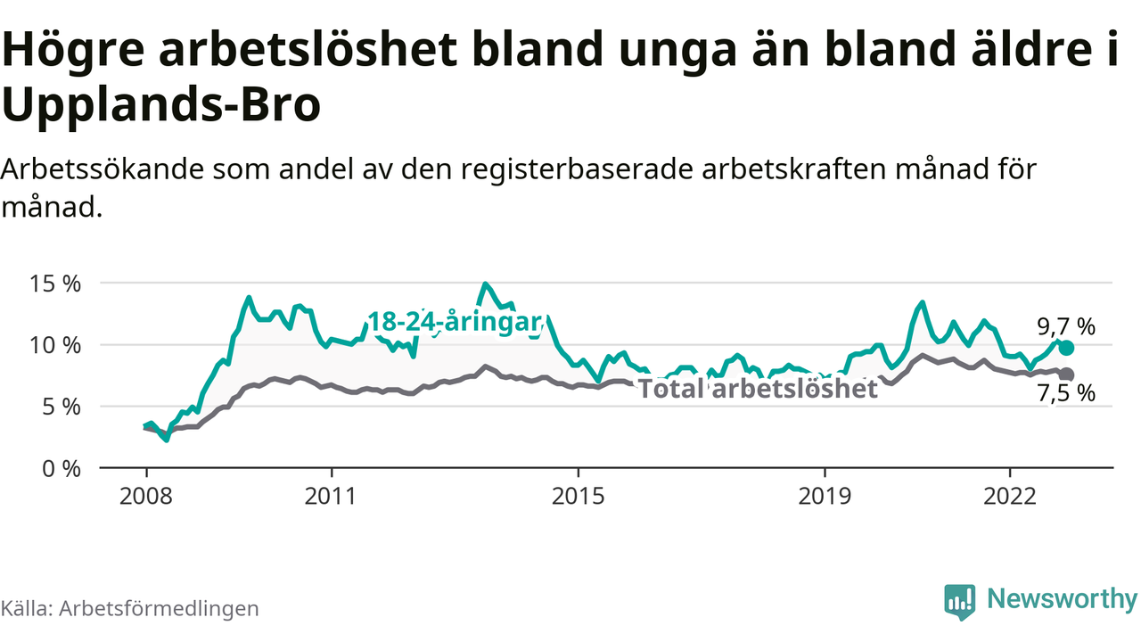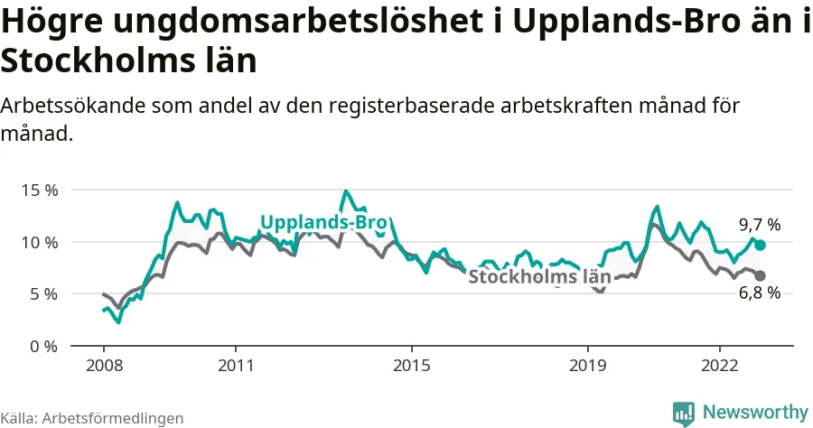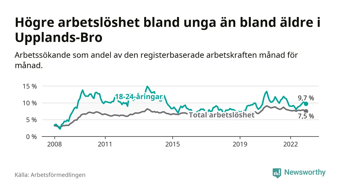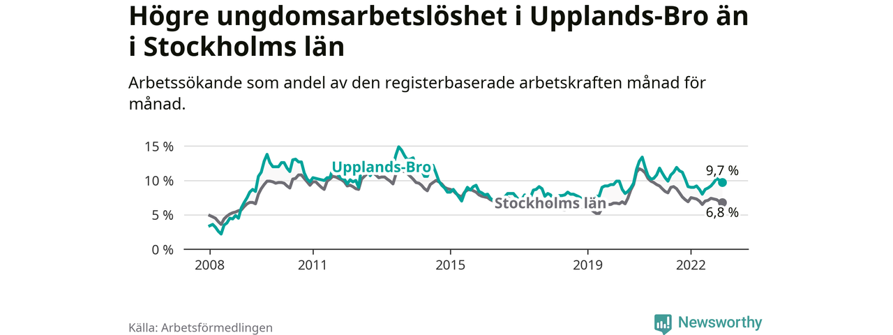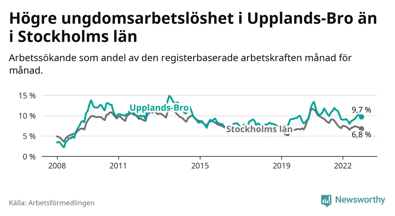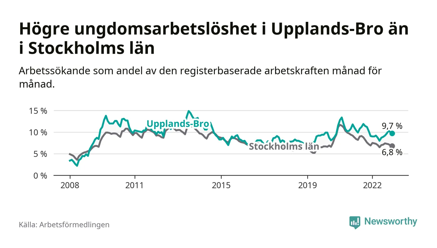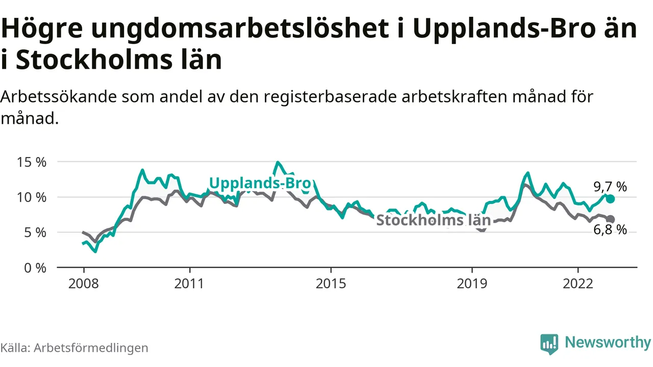 Precis som den totala arbetslösheten ligger ungdomsarbetslösheten i Upplands-Bro högre än i Stockholms län som helhet. Skillnaden mellan kommunen och länet är 2,9 procentenheter.