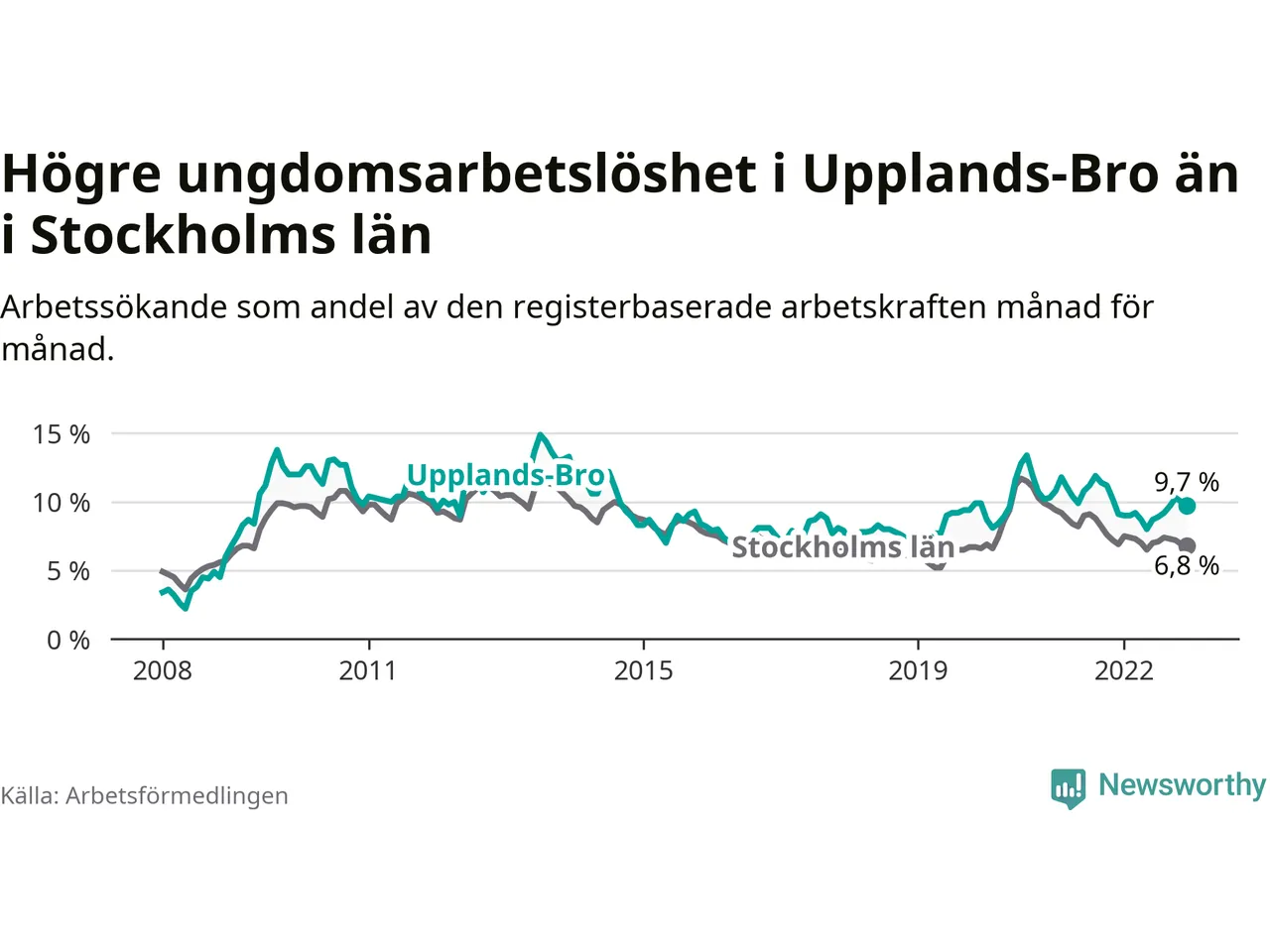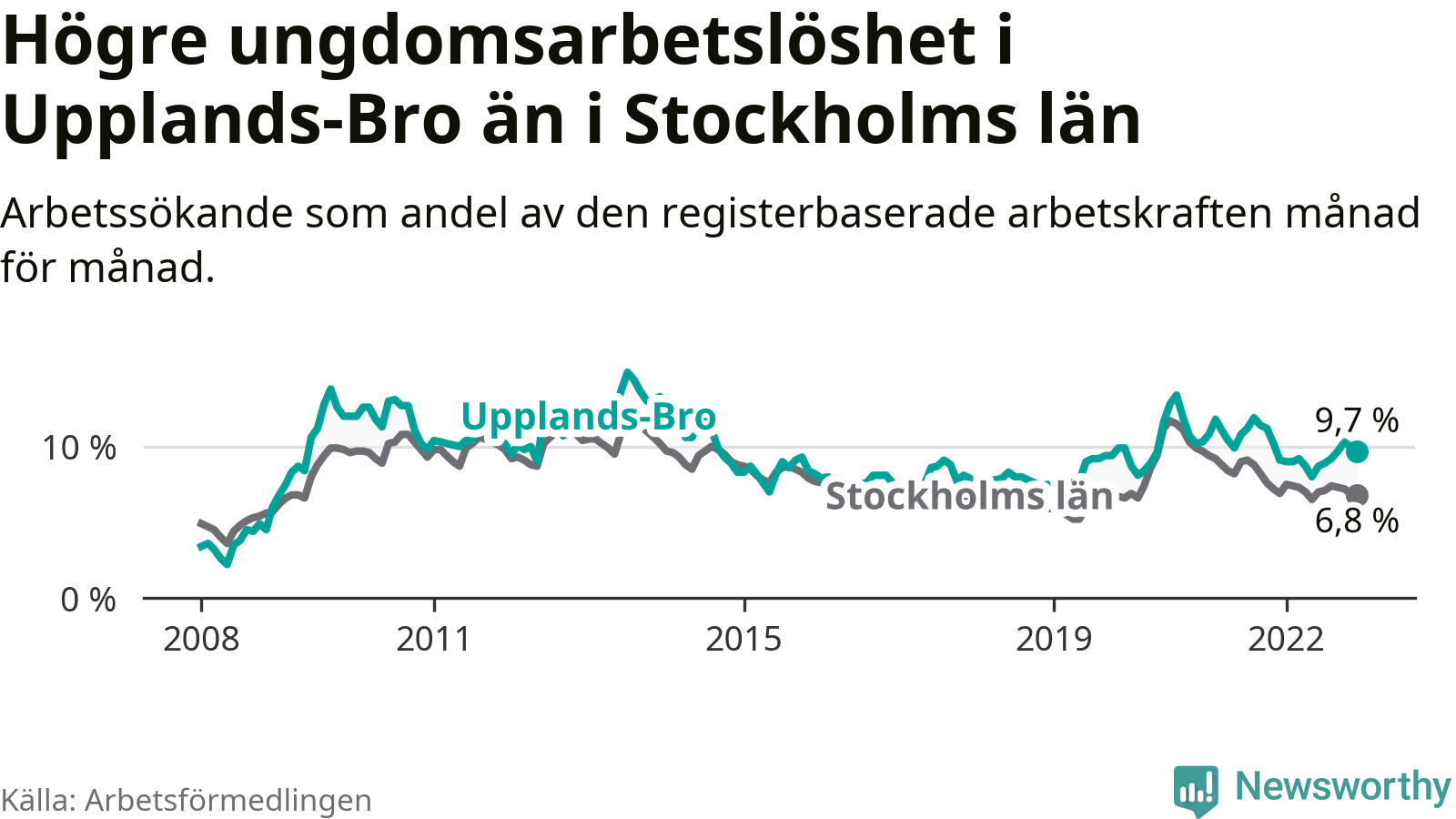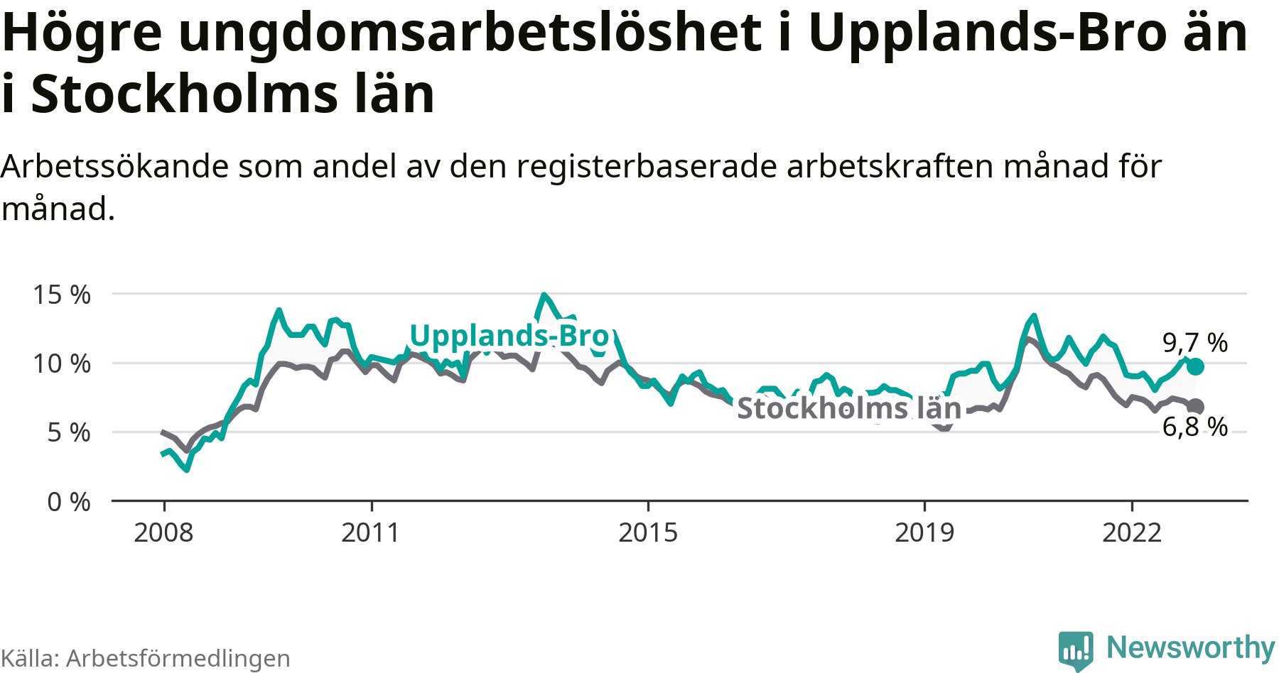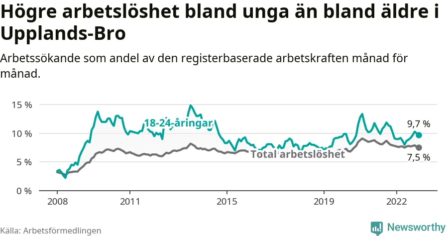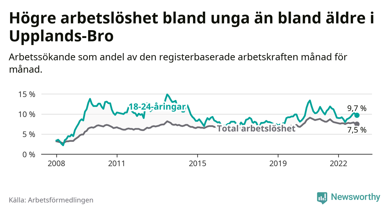 Precis som den totala arbetslösheten ligger ungdomsarbetslösheten i Upplands-Bro högre än i Stockholms län som helhet. Skillnaden mellan kommunen och länet är 2,9 procentenheter.