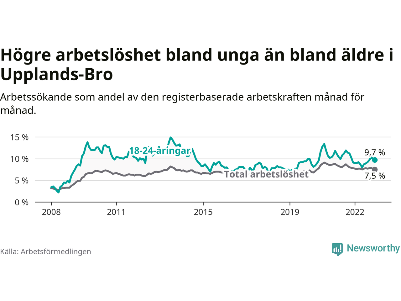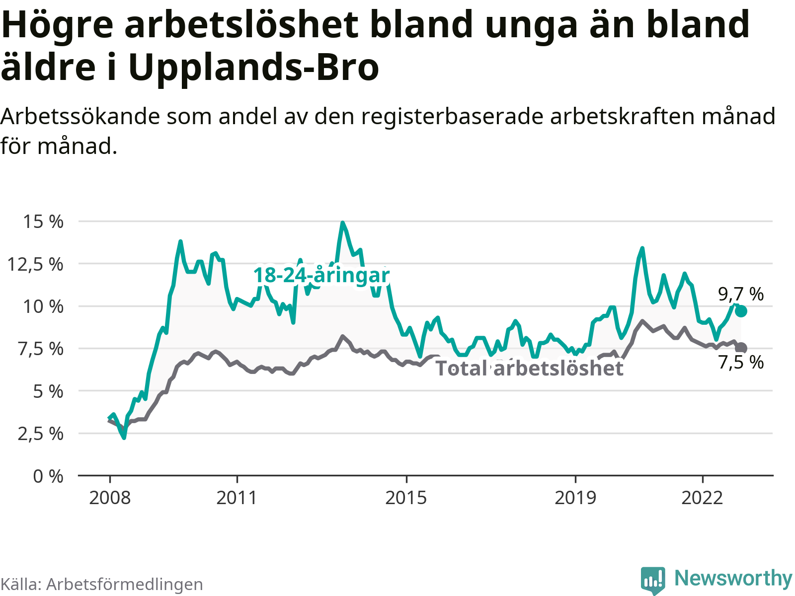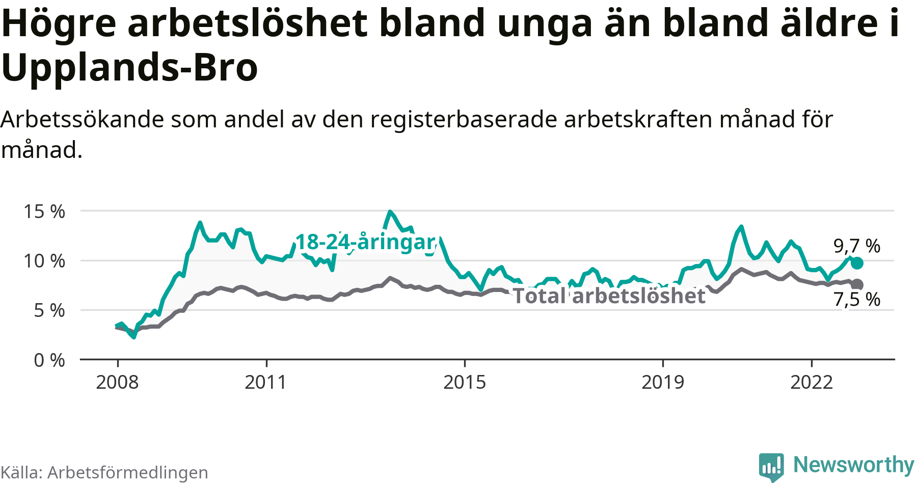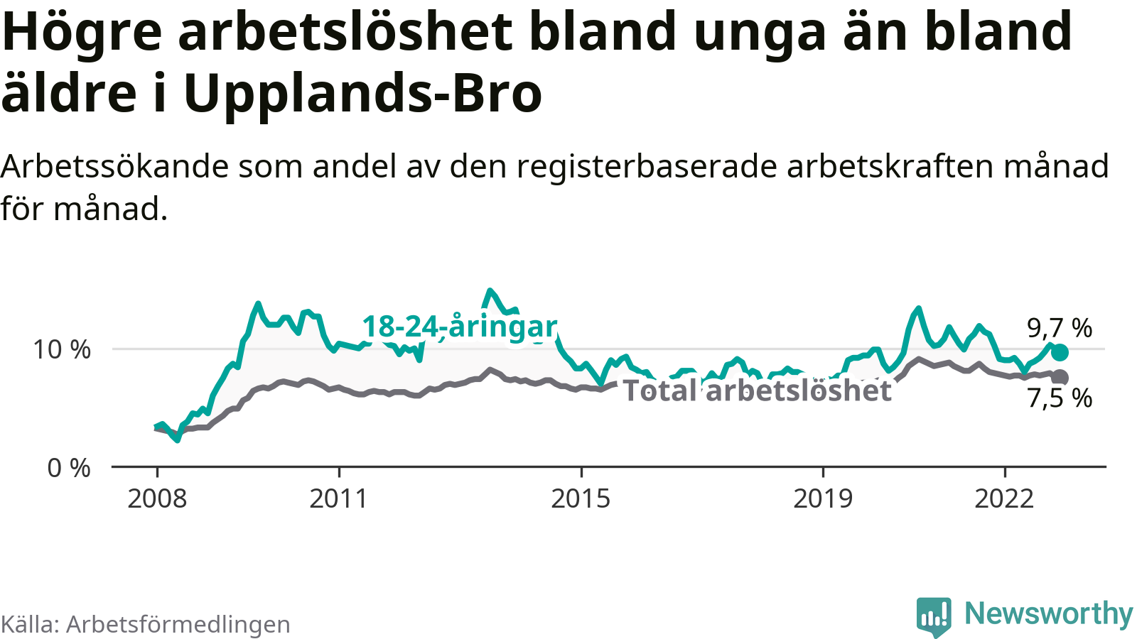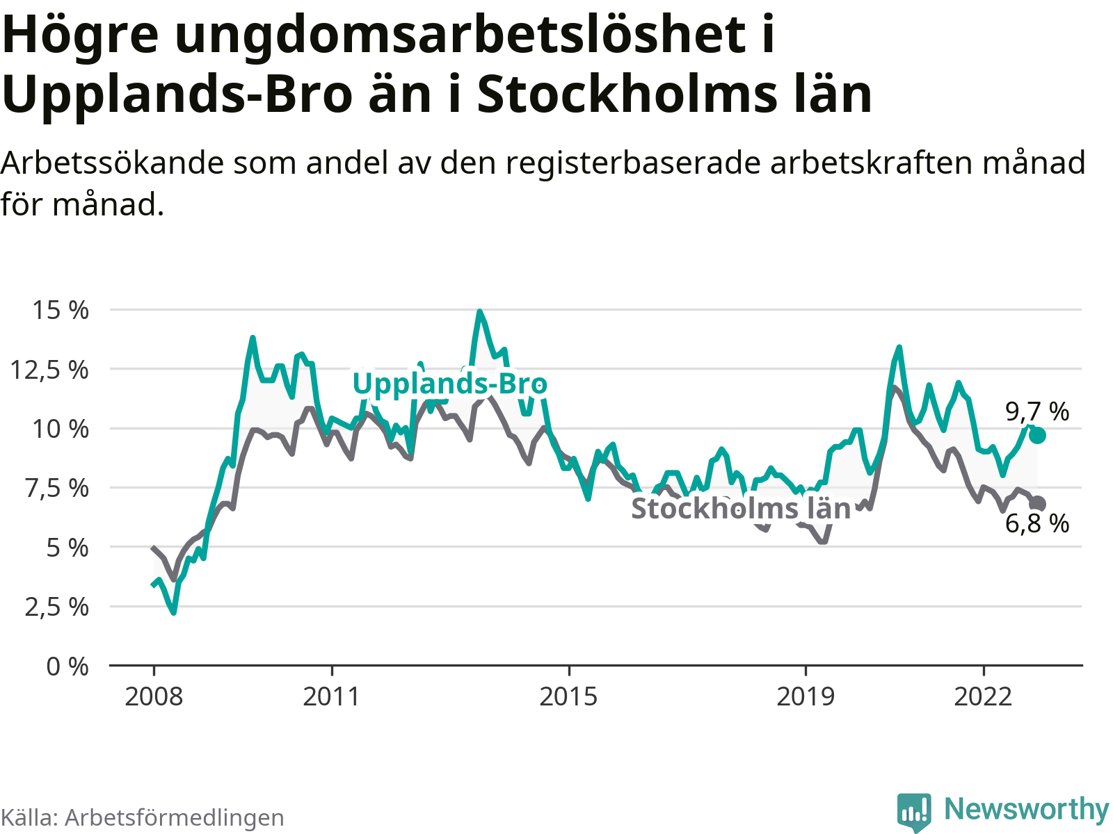Precis som den totala arbetslösheten ligger ungdomsarbetslösheten i Upplands-Bro högre än i Stockholms län som helhet. Skillnaden mellan kommunen och länet är 2,9 procentenheter.