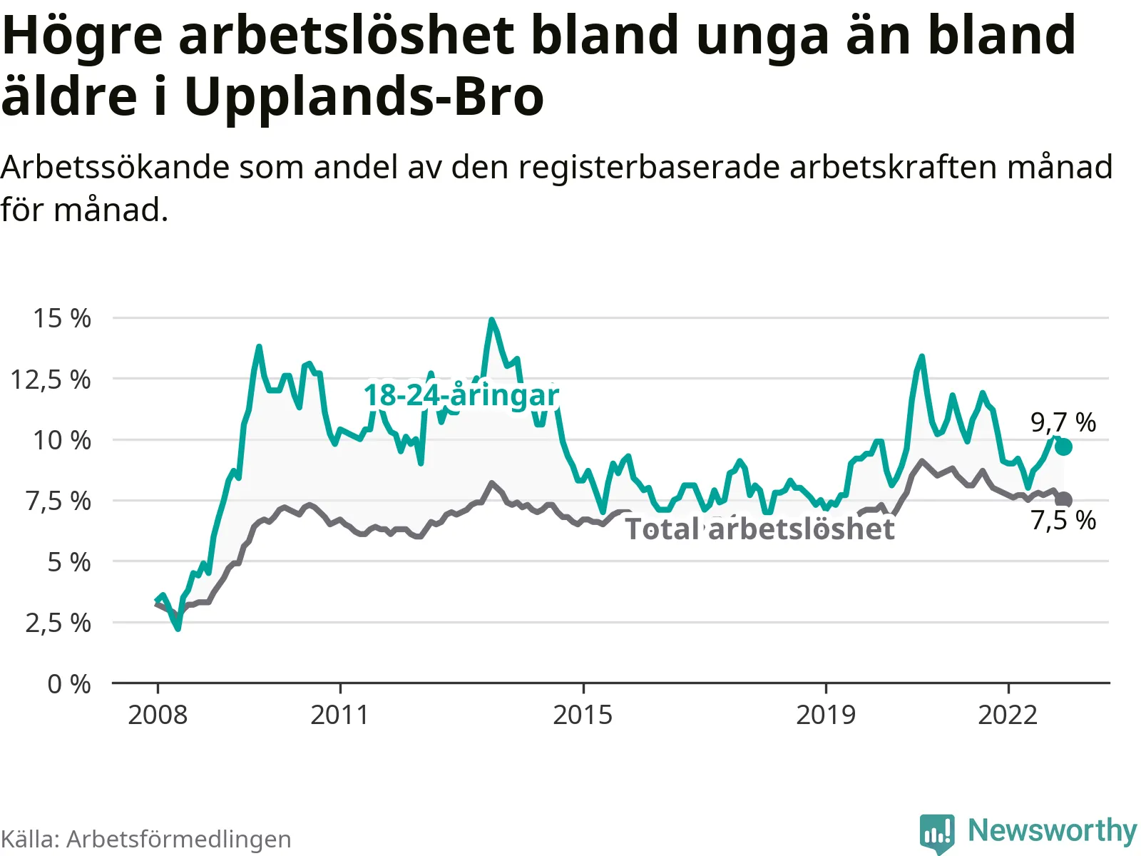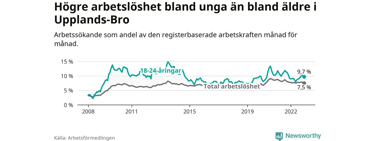 Graf: Arbetslöshet bland unga i Upplands-Bro kommun och Stockholms län