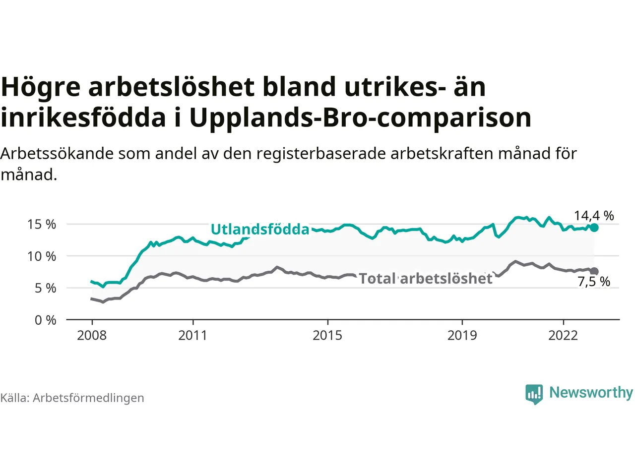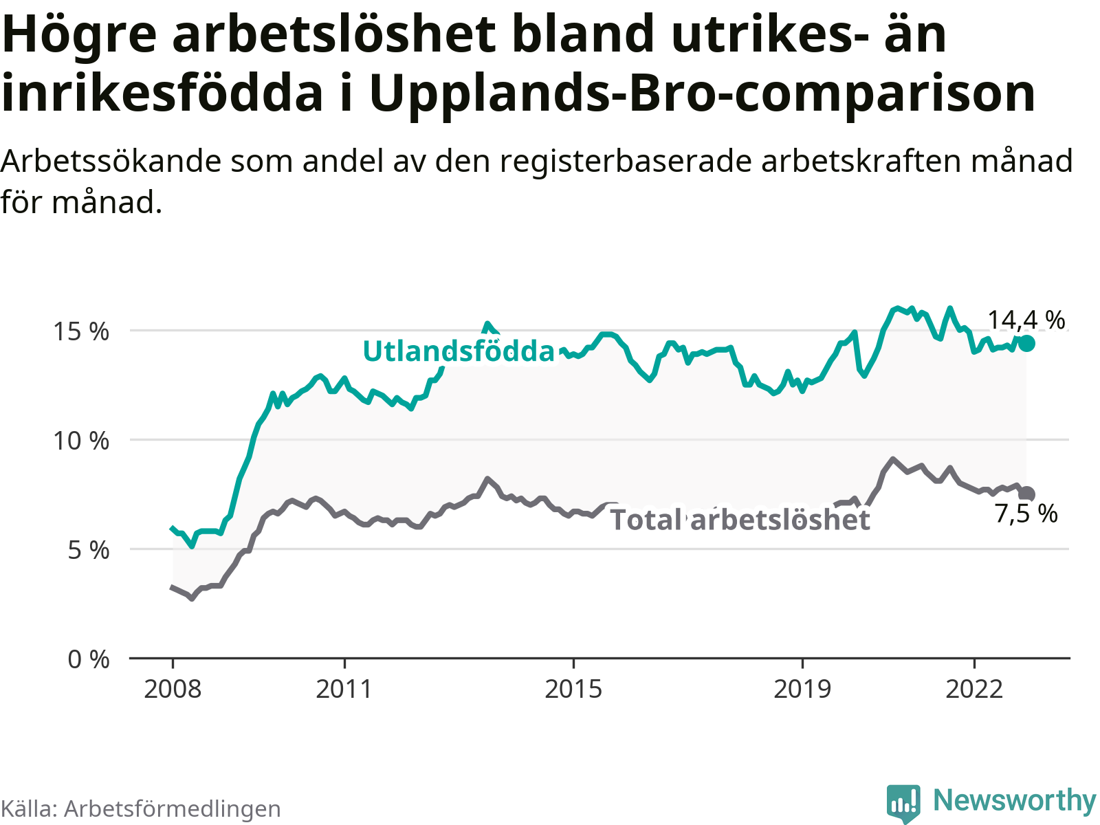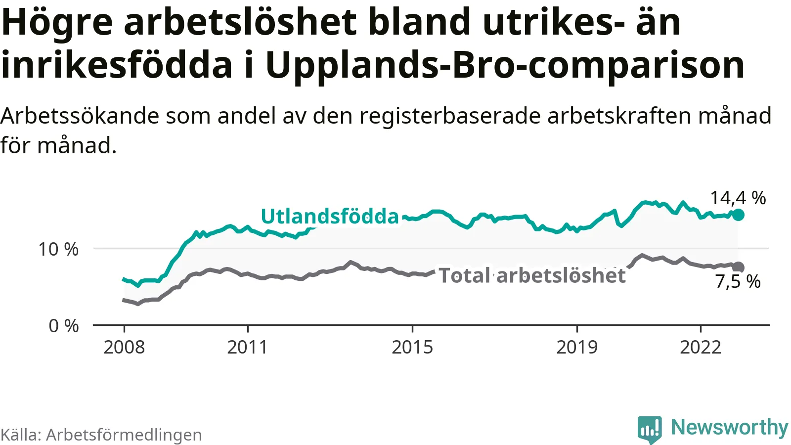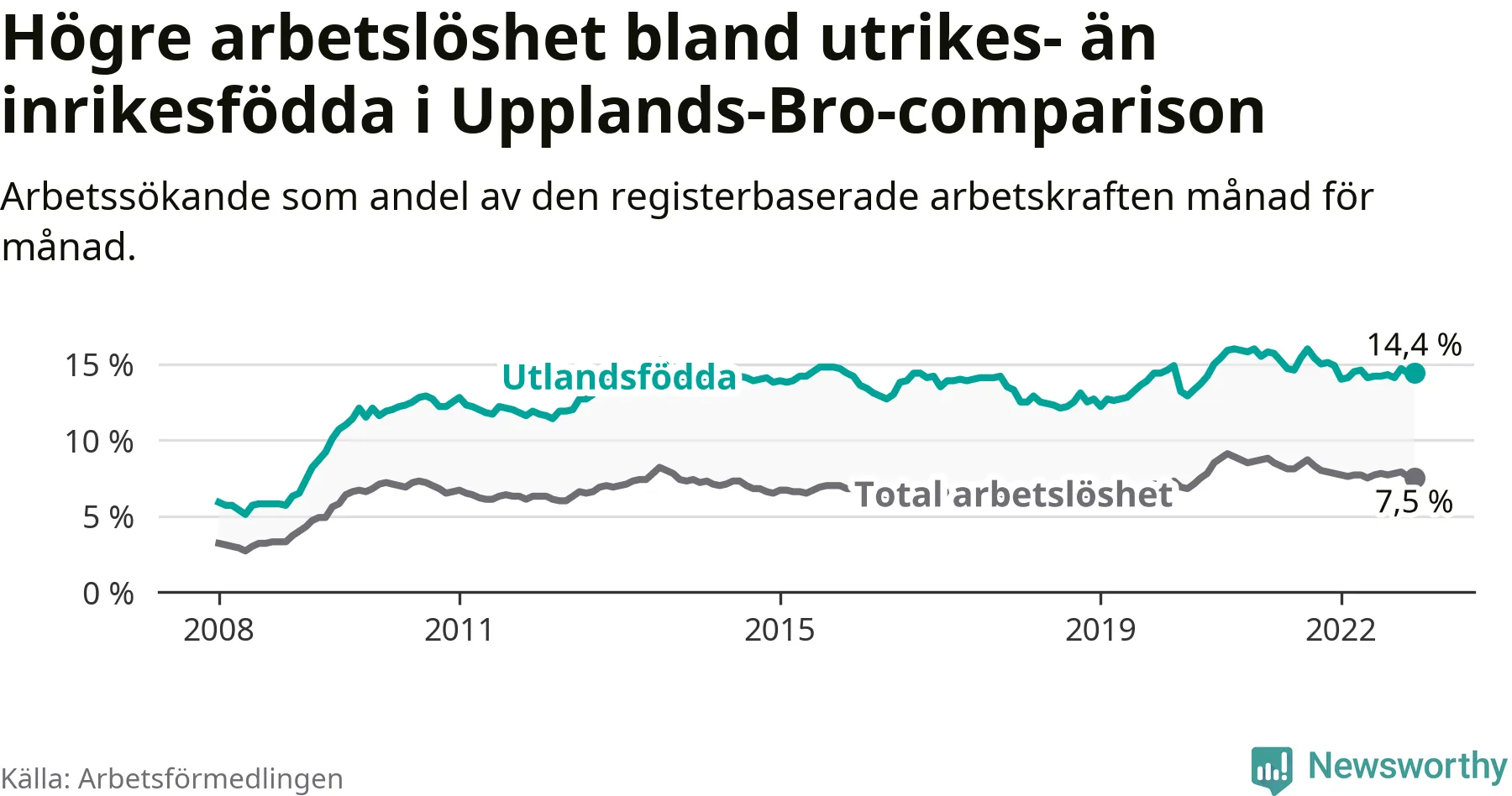 Graf: Skillnad i arbetslöshet mellan utrikesfödda och hela befolkningen i Upplands-Bro kommun