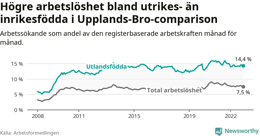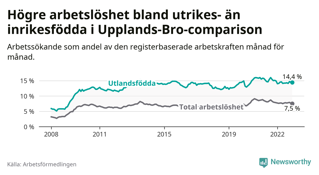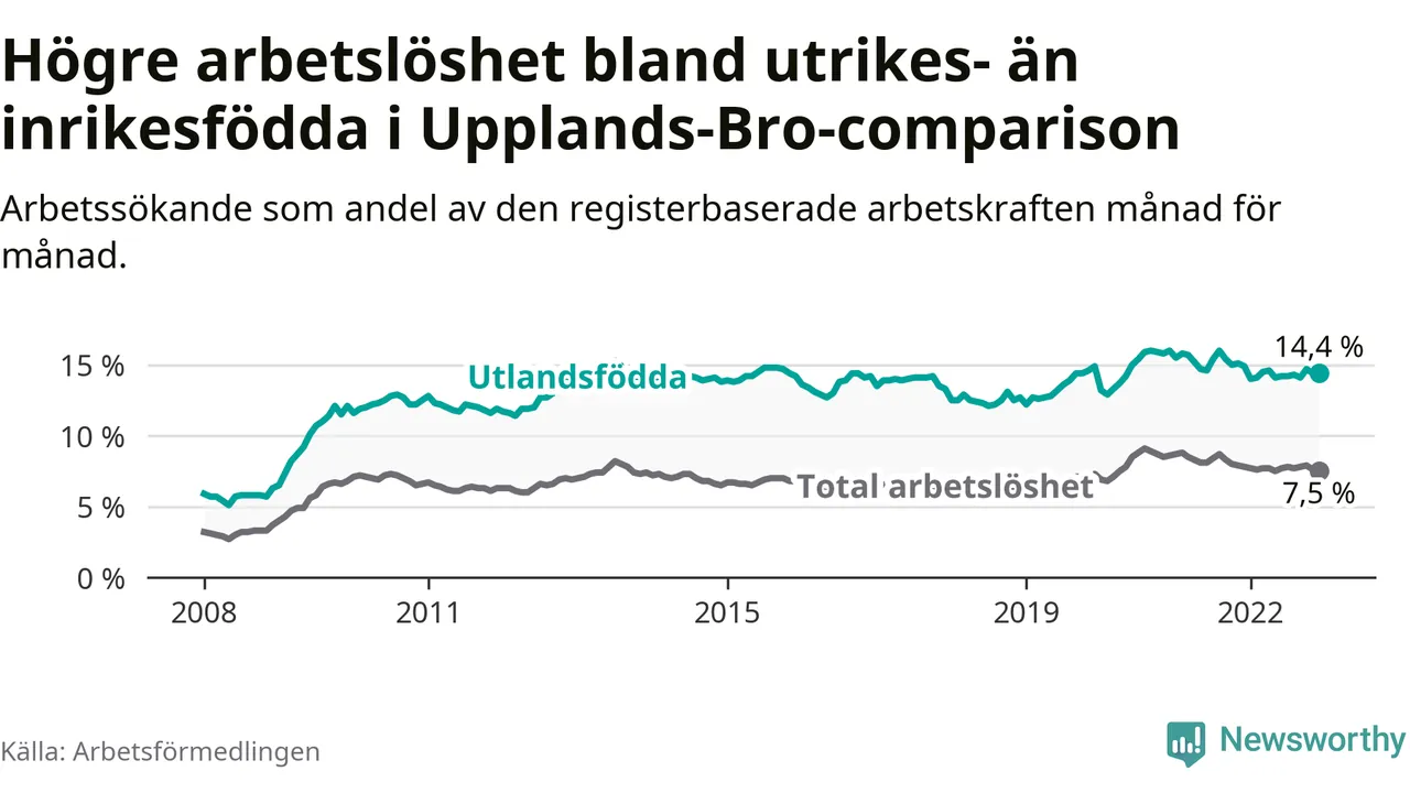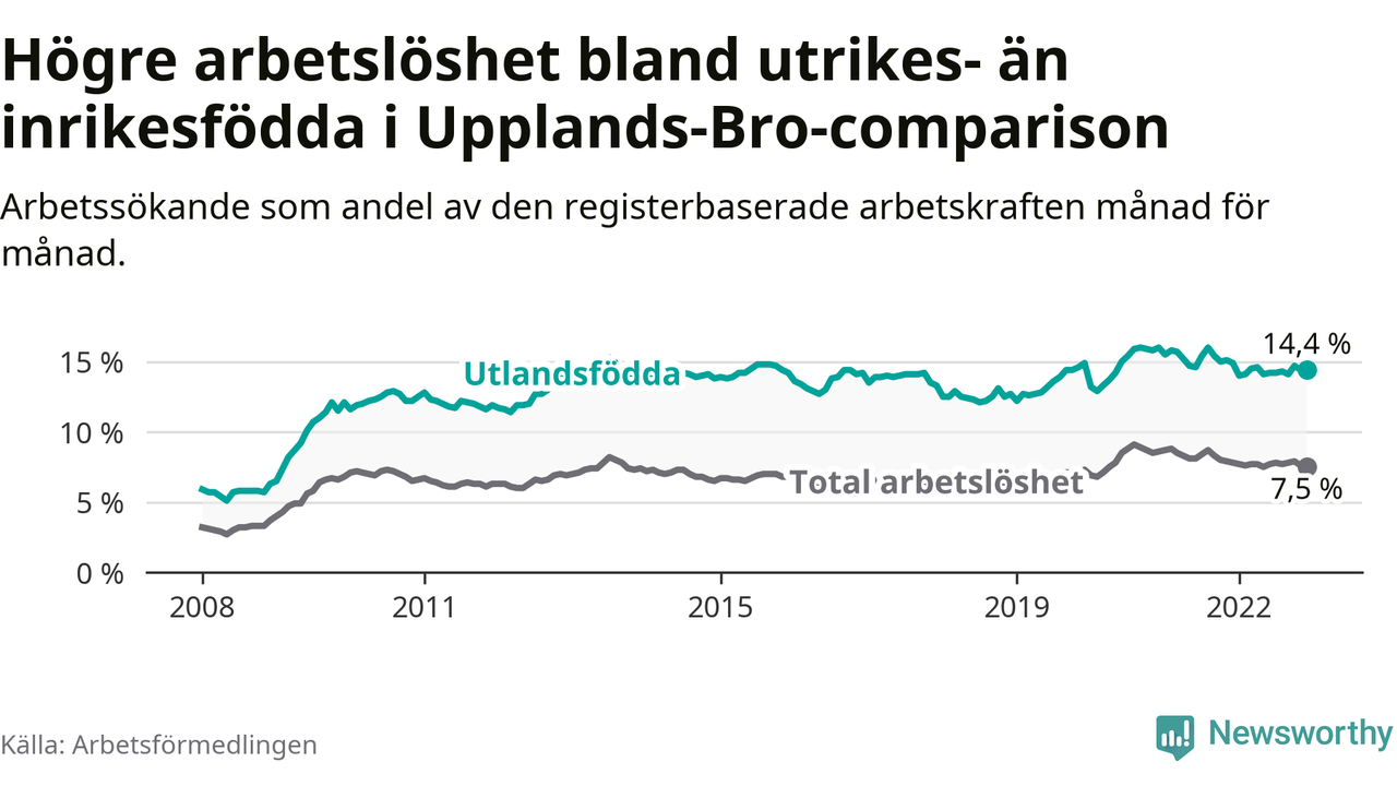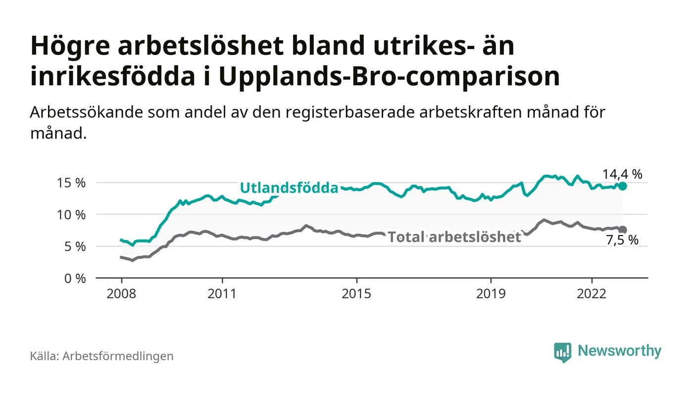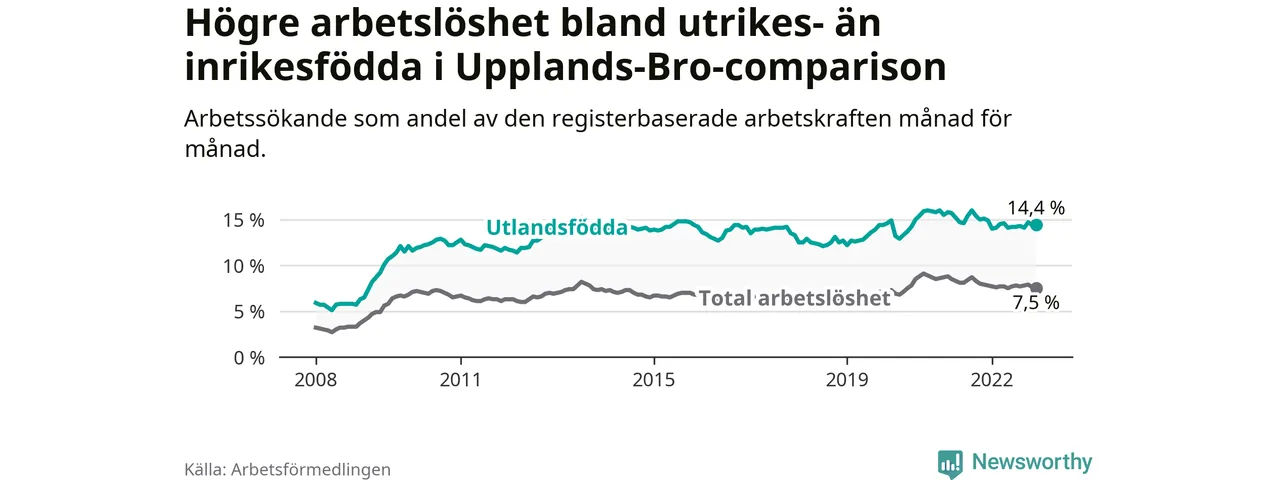 Arbetslösheten bland utlandsfödda var 14,4 procent i Upplands-Bro under december månad, motsvarande 837 av 5 813 personer. Det är 0,5 procentenheter färre än vid samma tidpunkt i fjol (+22 om man räknar personer). Därmed är de utlandsföddas arbetslöshet lägre än vid samma tidpunkt i fjol för 16:e månaden i följd. Sedan augusti 2021 har arbetslösheten bland utlandsfödda minskat från 16,0 till 14,4 procent.
