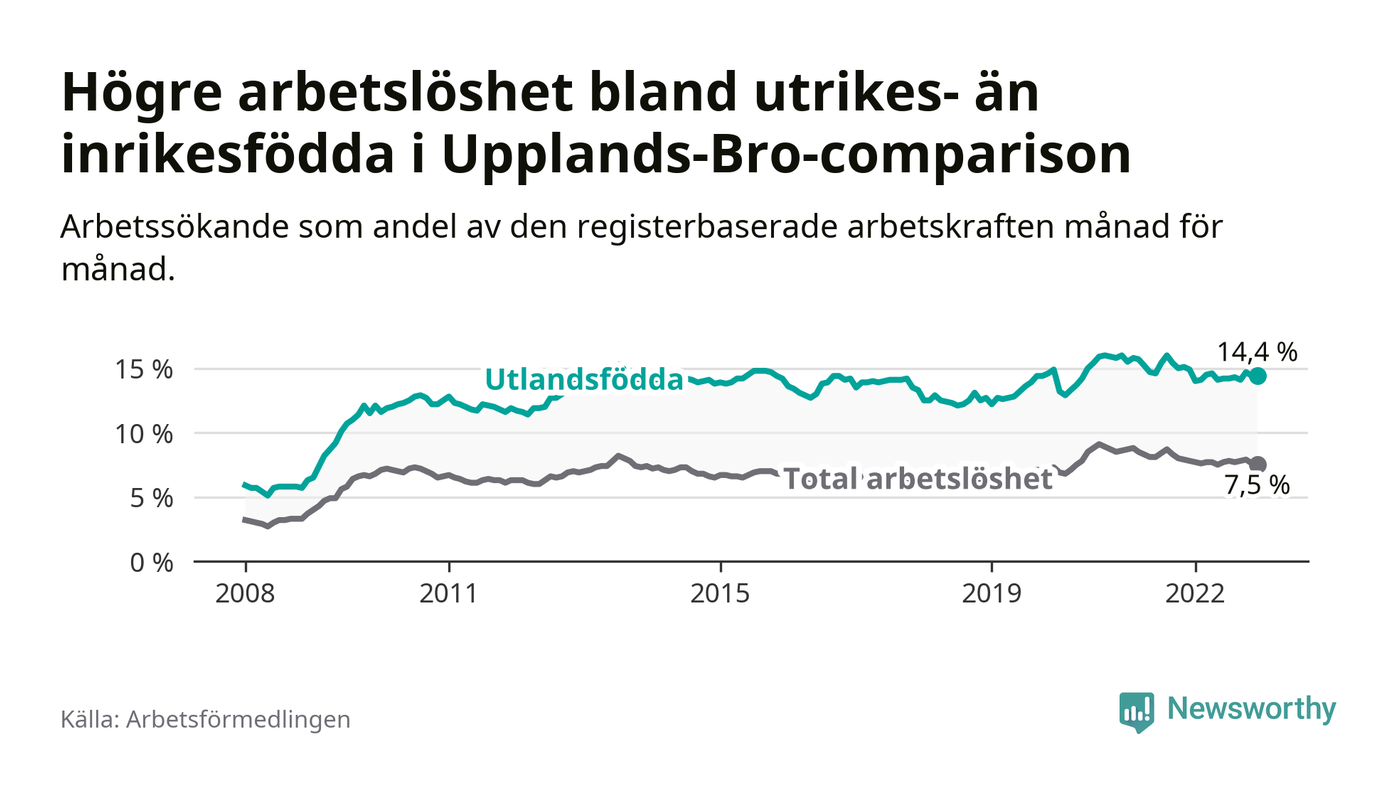Den här skillnaden i arbetslöshet mellan inrikes- och utrikesfödda är ändå förhållandevis liten i Upplands-Bro om man jämför med andra kommuner i Stockholms län. Botkyrka har, relativt sett, den minsta skillnaden i arbetslöshet mellan inrikes- och utrikes födda i länet. Nykvarn har den största.