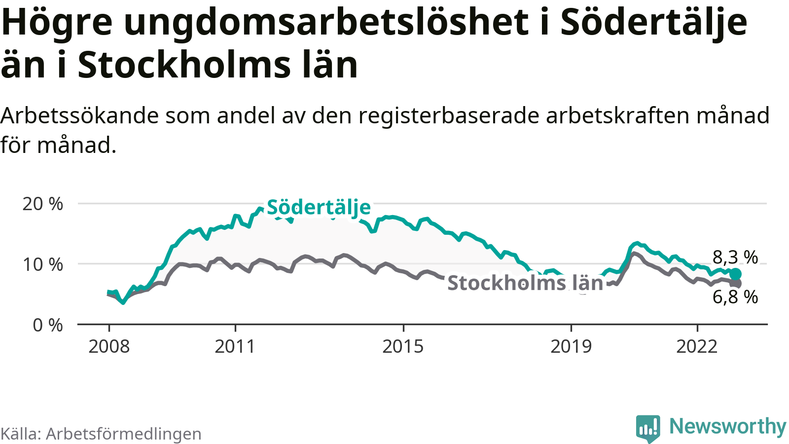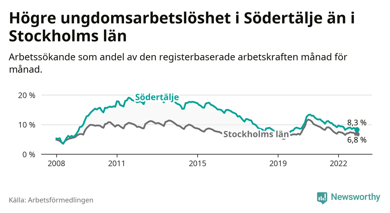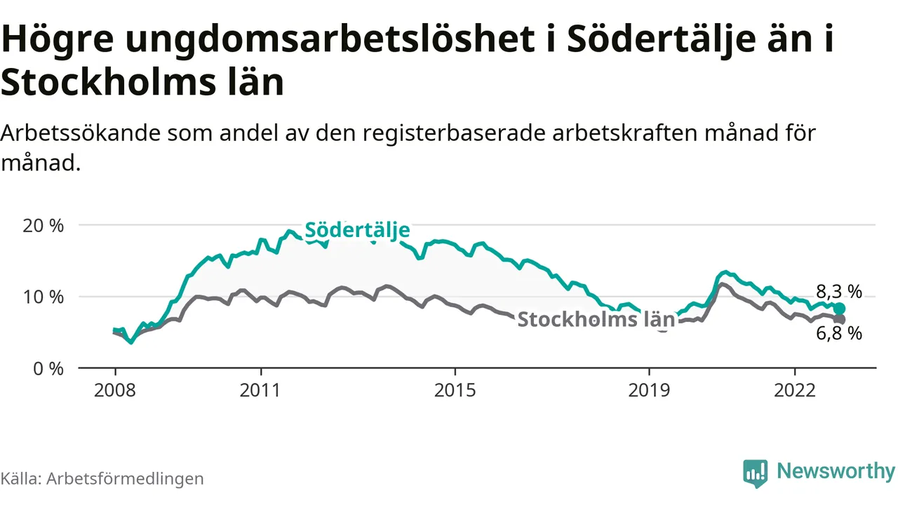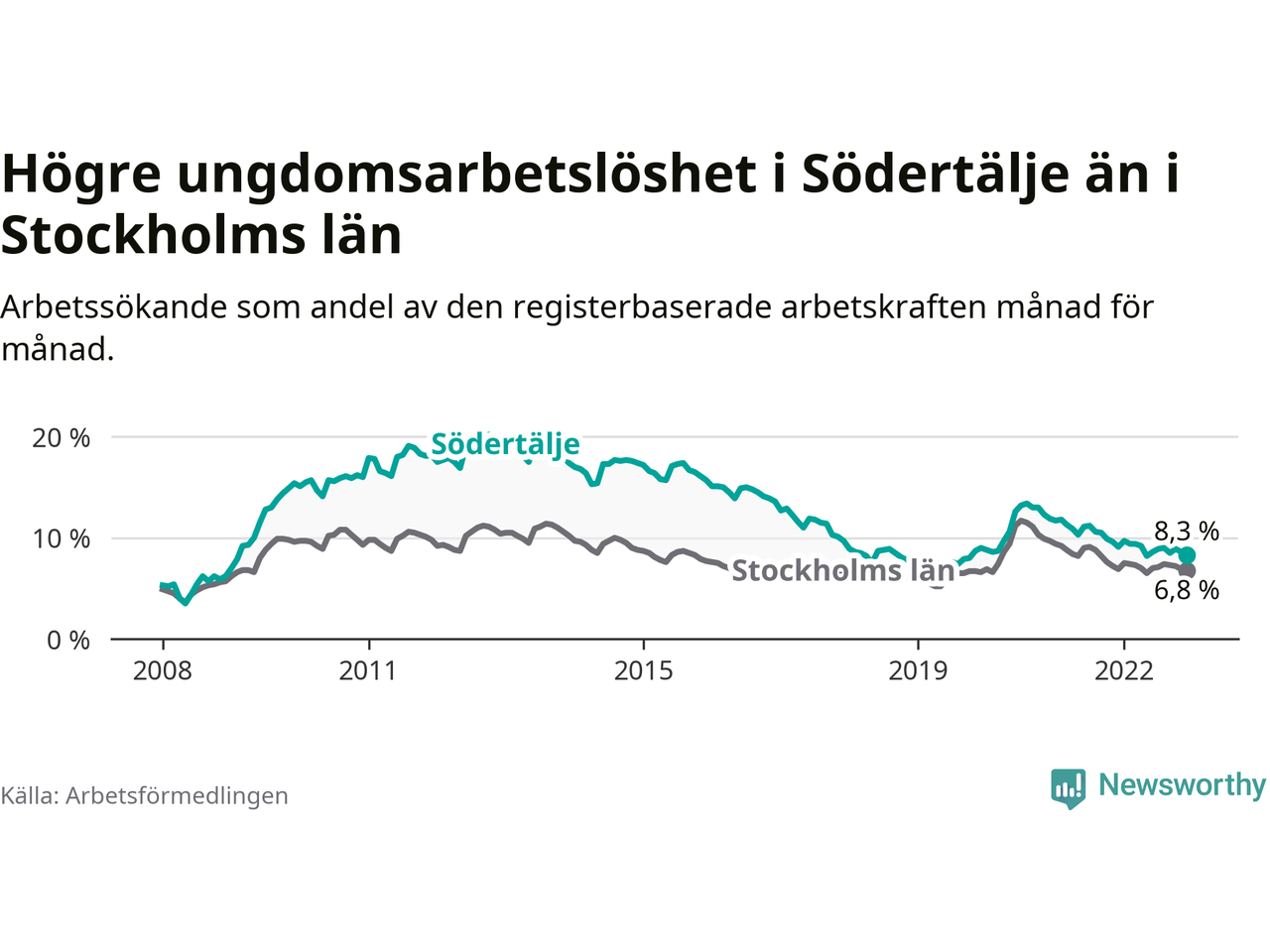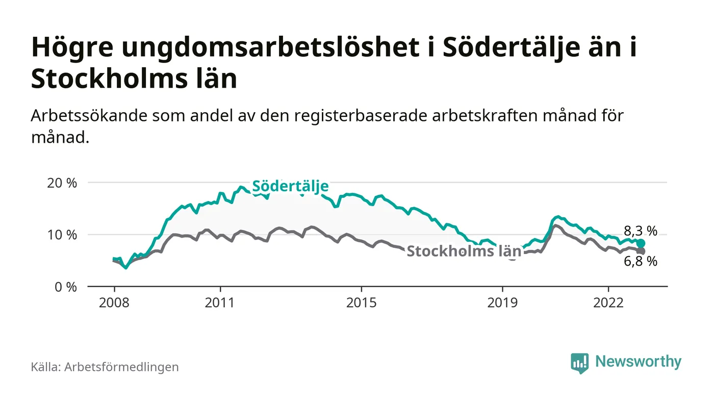 Precis som den totala arbetslösheten ligger ungdomsarbetslösheten i Södertälje högre än i Stockholms län som helhet. Skillnaden mellan kommunen och länet är 1,5 procentenheter.