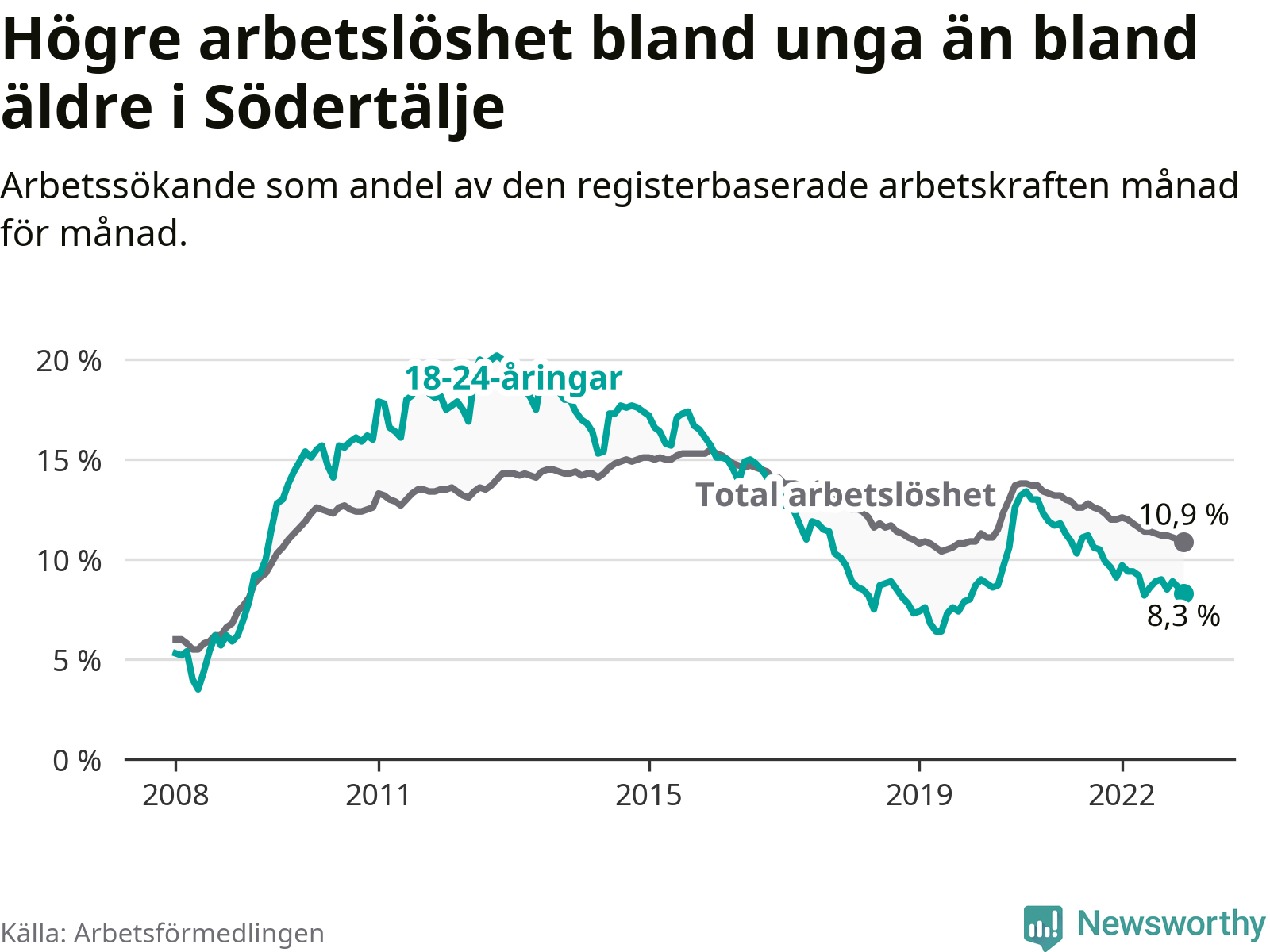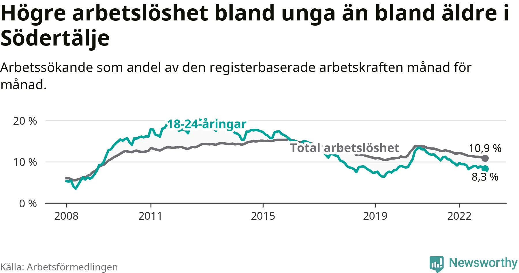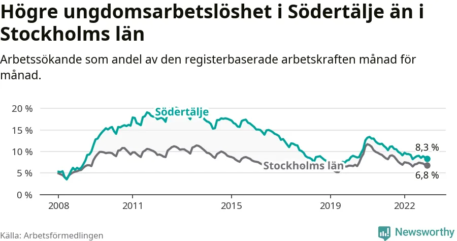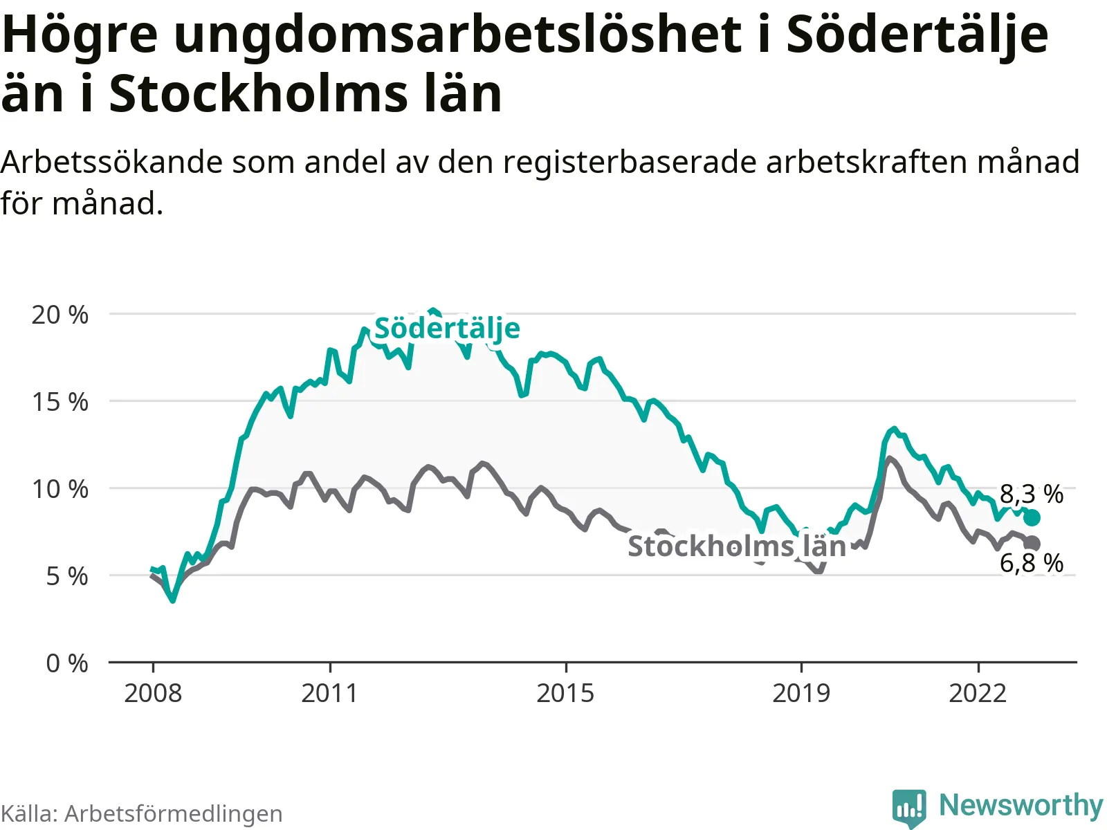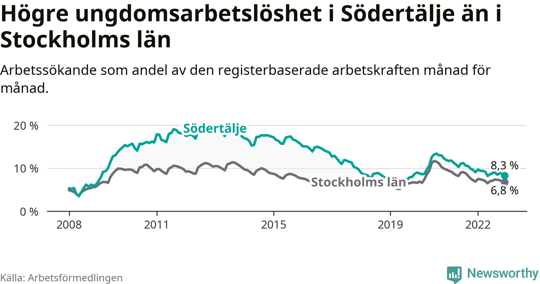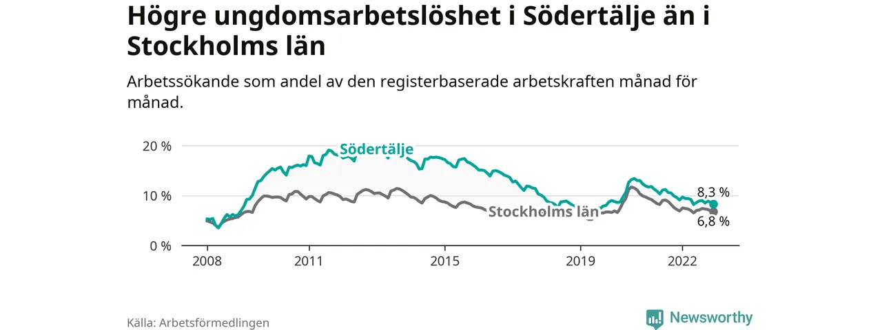 Precis som den totala arbetslösheten ligger ungdomsarbetslösheten i Södertälje högre än i Stockholms län som helhet. Skillnaden mellan kommunen och länet är 1,5 procentenheter.