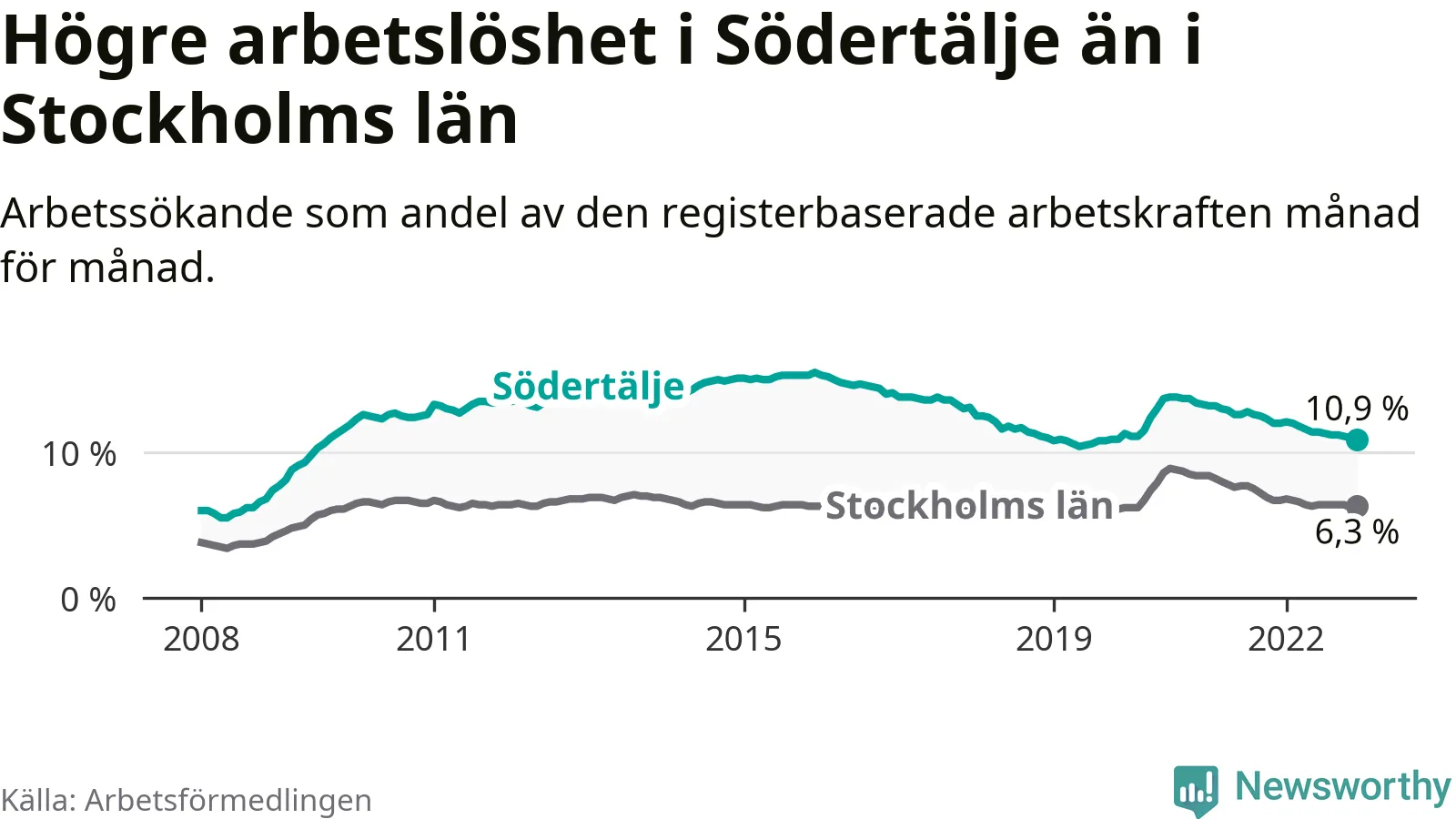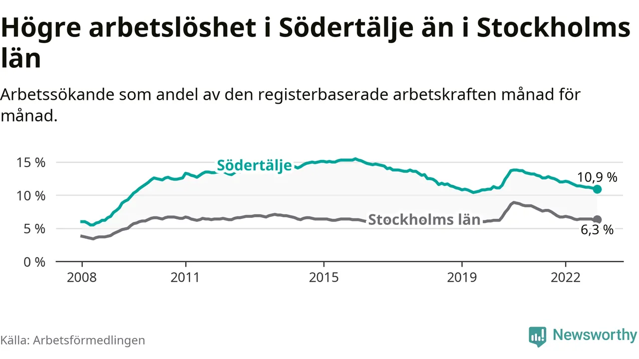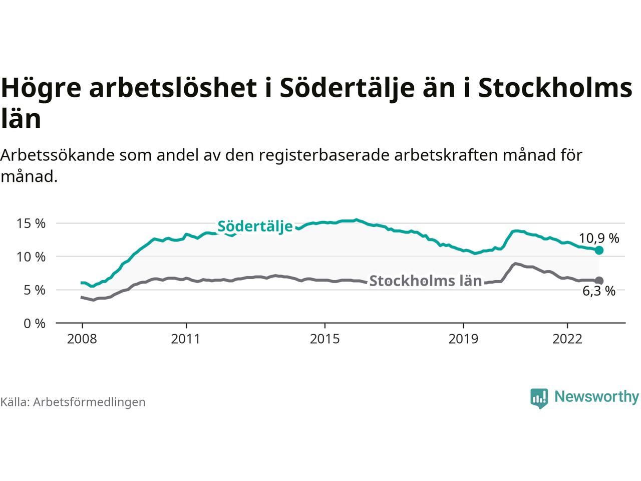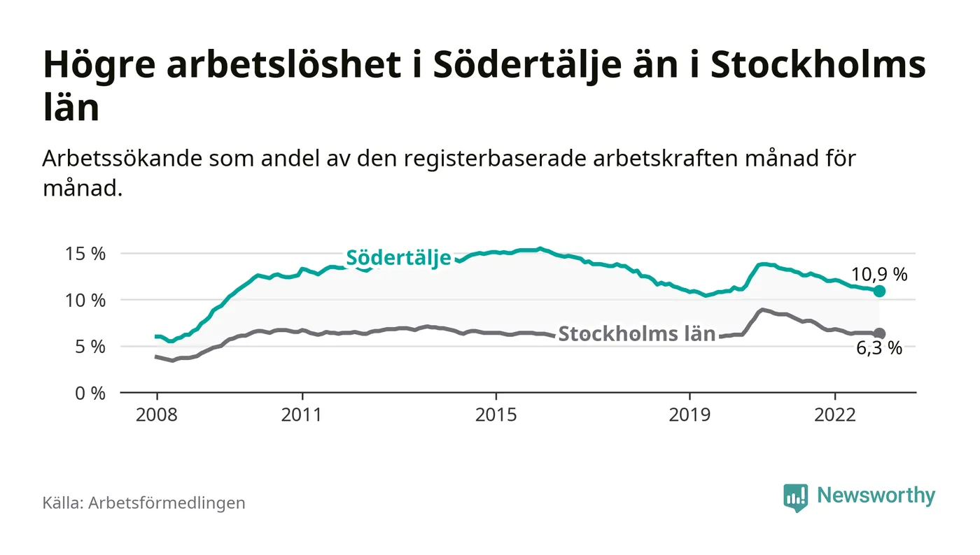 Perstorp är den kommun som har högst arbetslöshet just nu (13,2 procent) i landet som helhet, medan Kiruna, Kungsbacka, Tjörn och Öckerö har den lägsta (2,6 procent). Södertäljes arbetslöshet sticker ut som den sjunde högsta i hela landet.