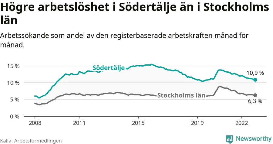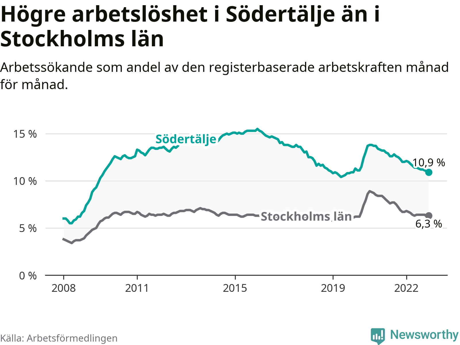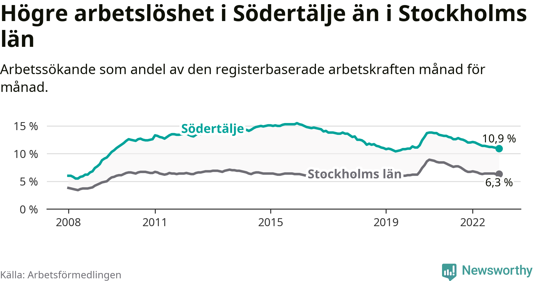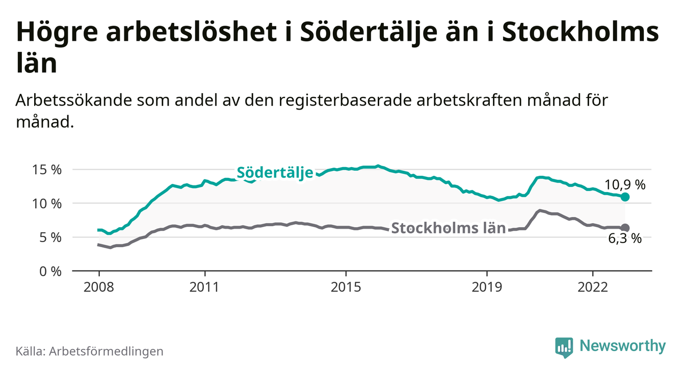 Perstorp är den kommun som har högst arbetslöshet just nu (13,2 procent) i landet som helhet, medan Kiruna, Kungsbacka, Tjörn och Öckerö har den lägsta (2,6 procent). Södertäljes arbetslöshet sticker ut som den sjunde högsta i hela landet.