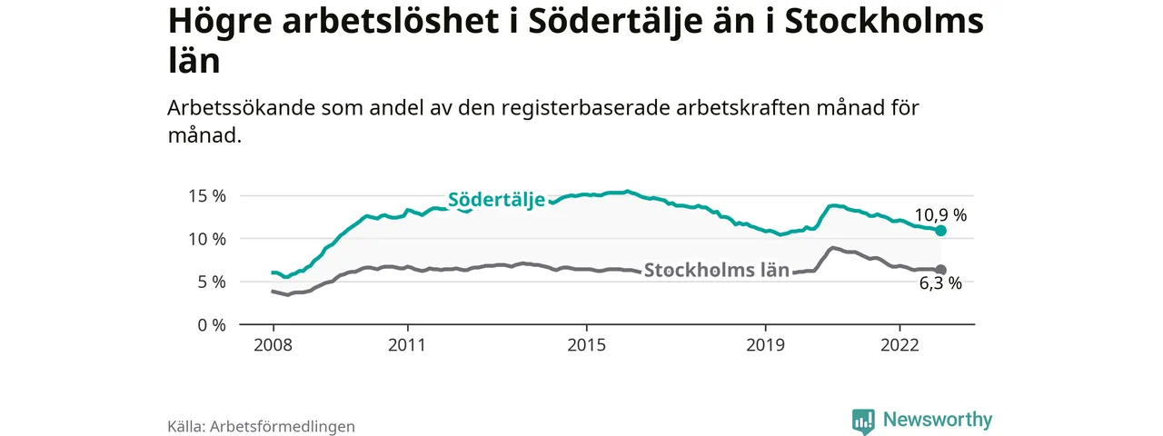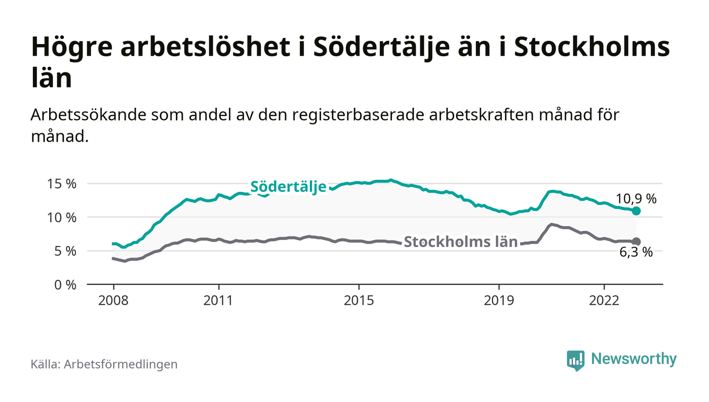 Även om arbetslösheten i Södertälje alltså minskar, så ligger den fortfarande över snittet i hela Stockholms län (10,9 procent i kommunen, jämfört med 6,3 procent i hela länet). Ekerö och Vaxholm har den lägsta arbetslösheten i länet (3,2 procent), medan Botkyrka har den högsta (11,1 procent). För att Södertälje skulle komma ner i samma arbetslöshetsnivå som Ekerö och Vaxholm skulle 3 883 personer behöva sysselsättas.
