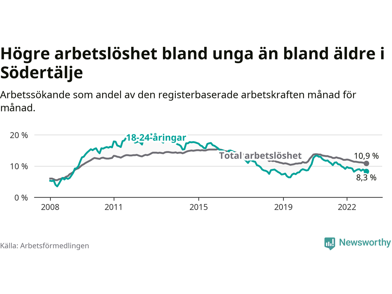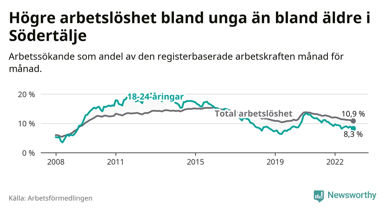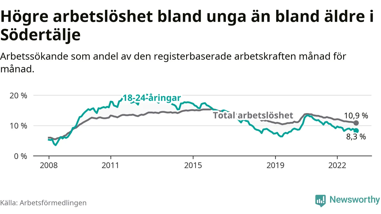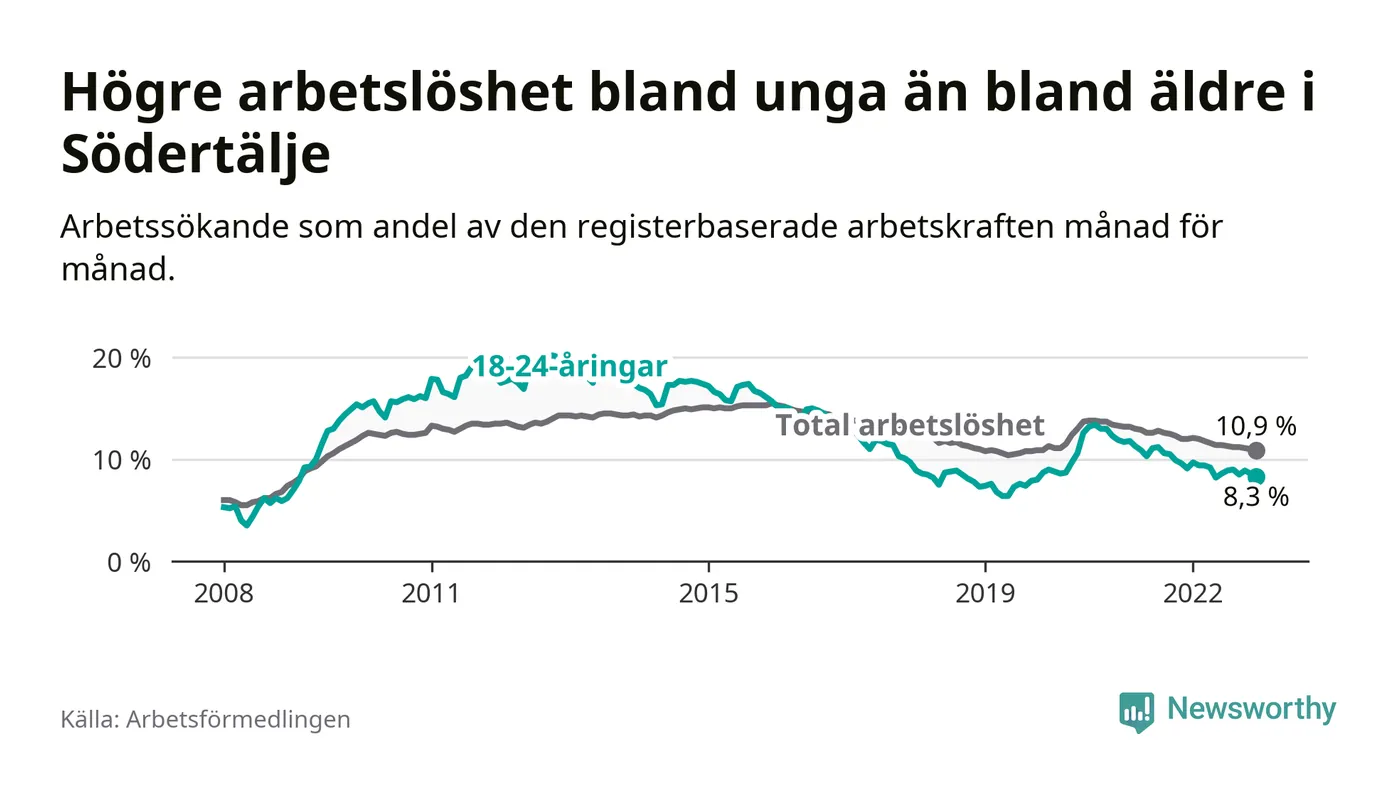 I och med den senaste månadens nedgång har de ungas arbetslöshet i Södertälje sjunkit 20 månader i följd (ner från 10,9 procent i april 2021 till 8,3 procent nu).