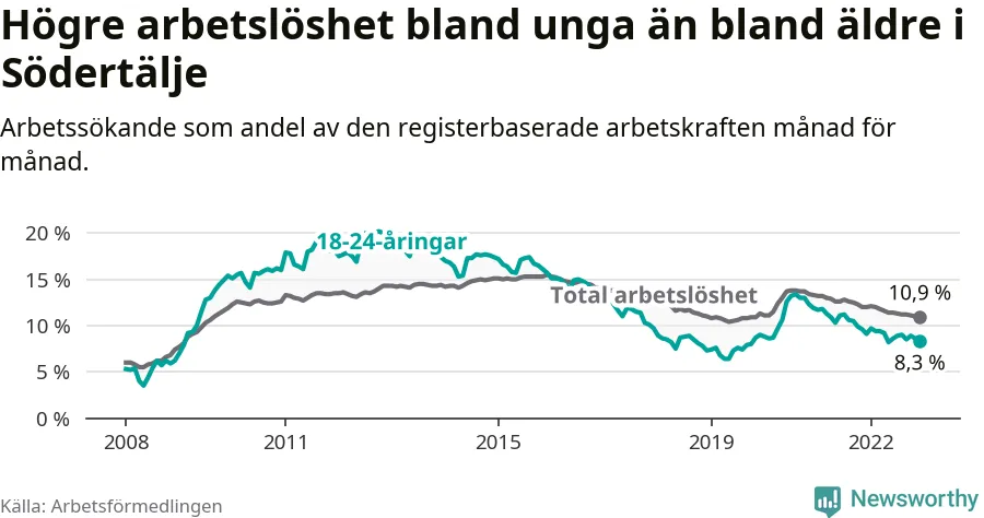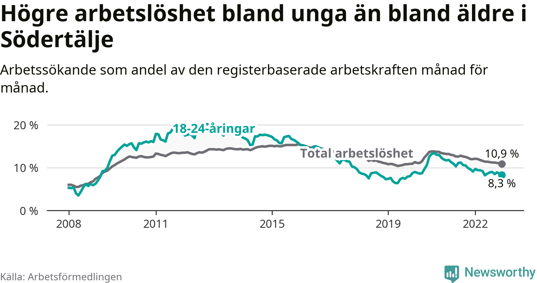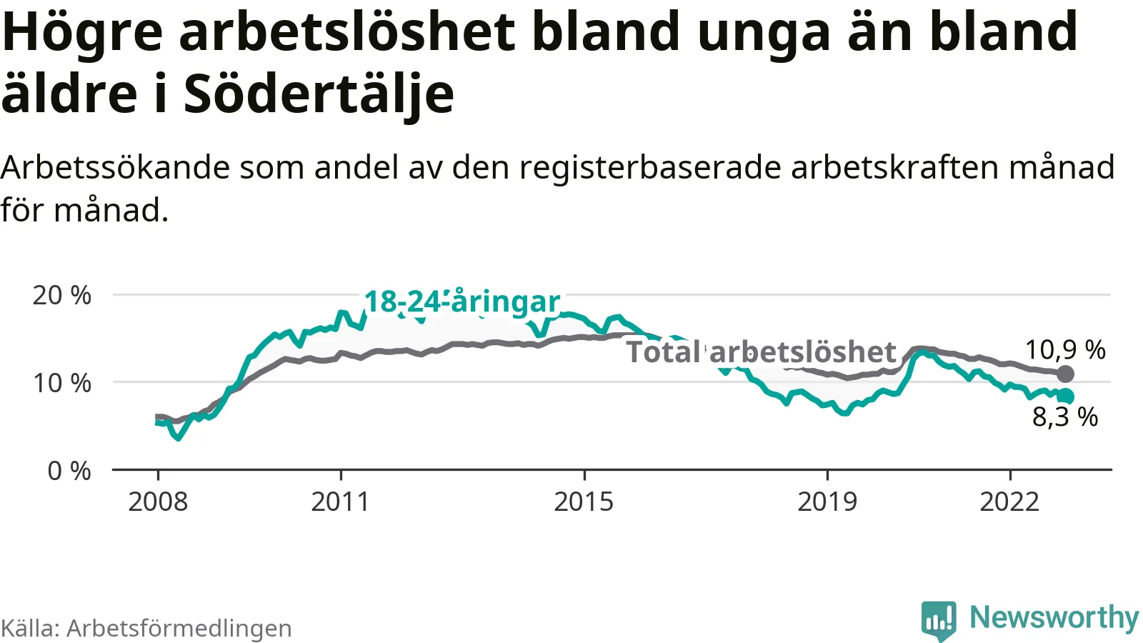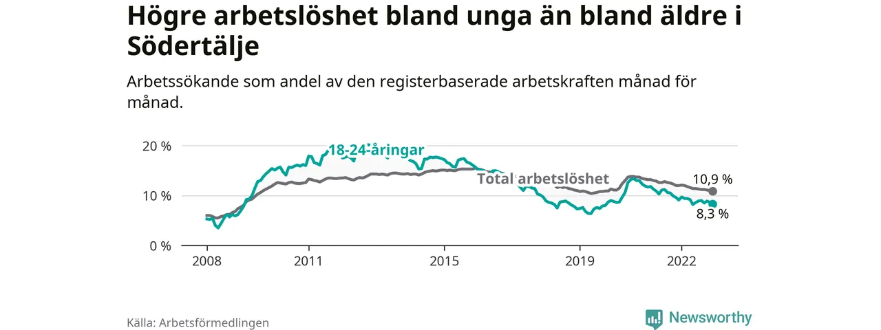 I och med den senaste månadens nedgång har de ungas arbetslöshet i Södertälje sjunkit 20 månader i följd (ner från 10,9 procent i april 2021 till 8,3 procent nu).