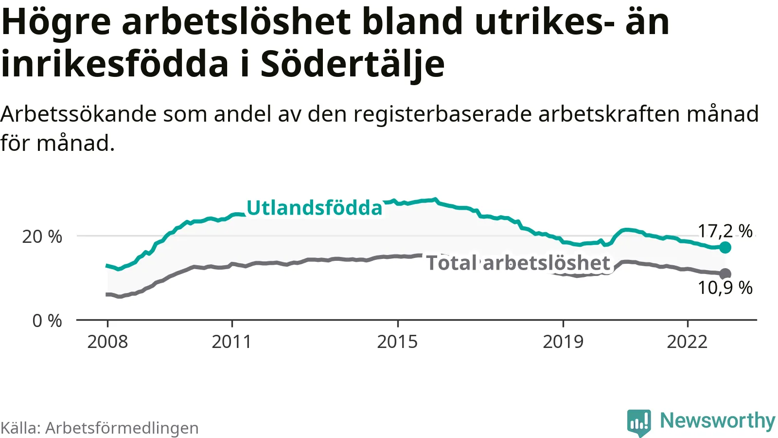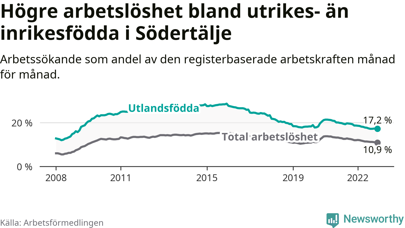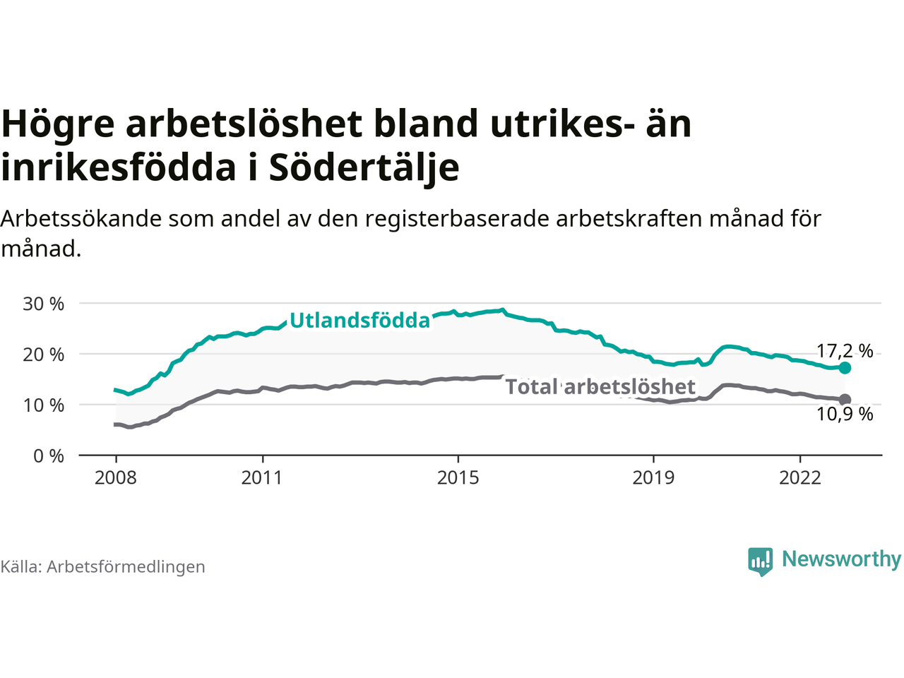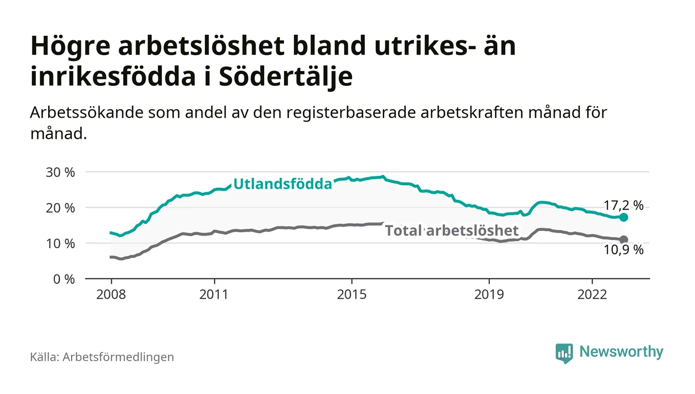 Arbetslösheten bland utlandsfödda var 17,2 procent i Södertälje under december månad, motsvarande 4 375 av 25 436 personer. Det är 1,5 procentenheter färre än vid samma tidpunkt i fjol (−493 om man räknar personer). Därmed är de utlandsföddas arbetslöshet lägre än vid samma tidpunkt i fjol för 20:e månaden i följd. Sedan april 2021 har arbetslösheten bland utlandsfödda minskat från 19,8 till 17,2 procent.