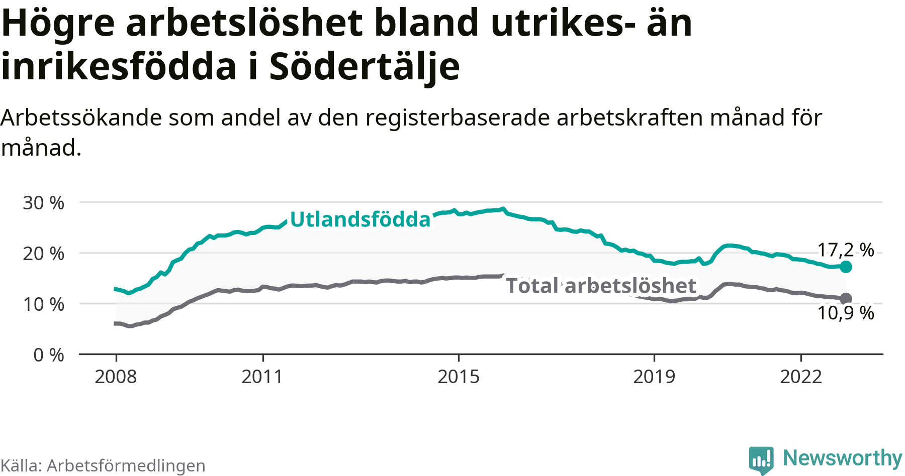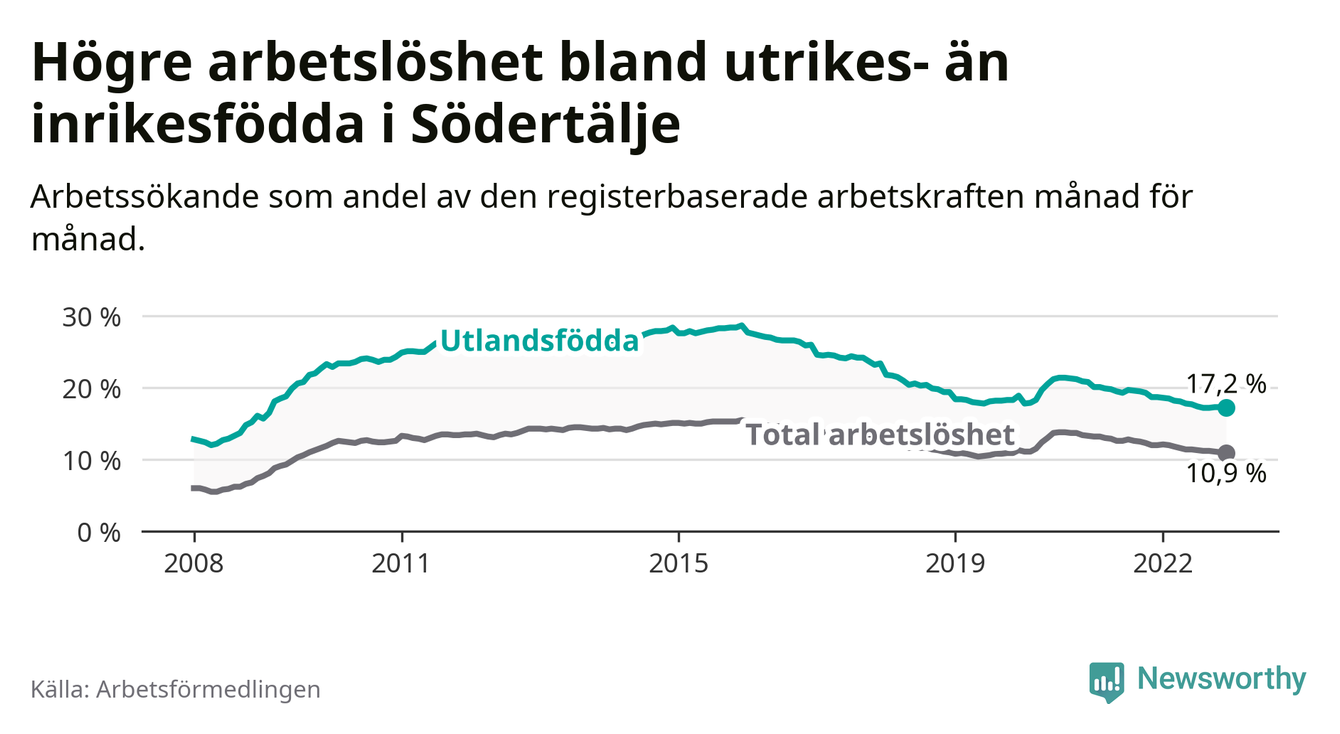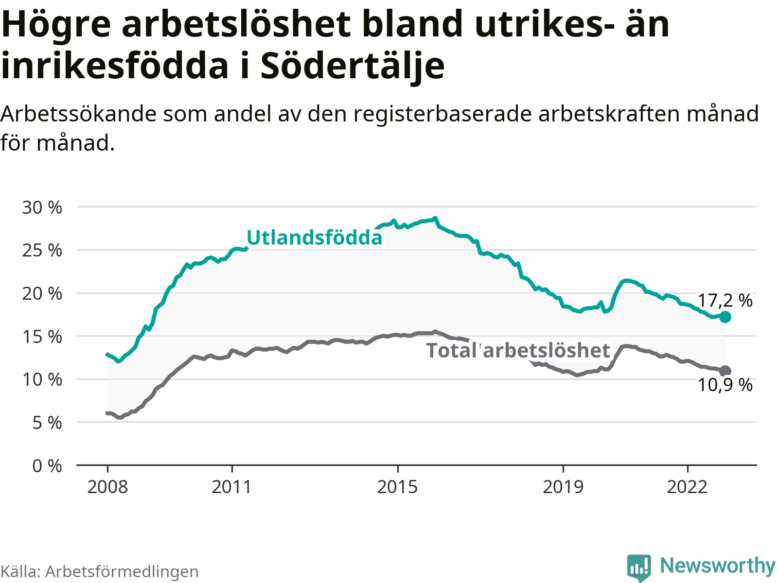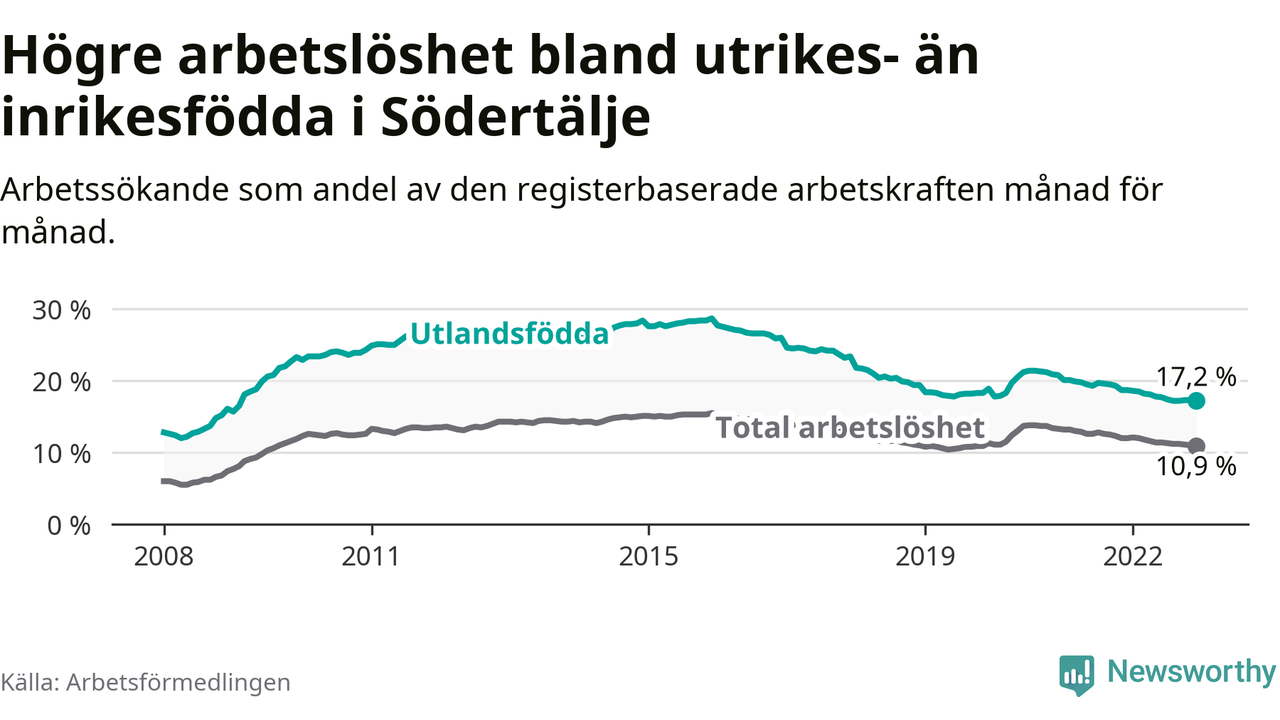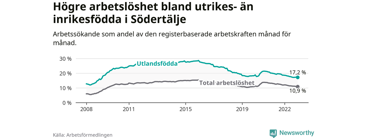 Arbetslösheten bland utlandsfödda var 17,2 procent i Södertälje under december månad, motsvarande 4 375 av 25 436 personer. Det är 1,5 procentenheter färre än vid samma tidpunkt i fjol (−493 om man räknar personer). Därmed är de utlandsföddas arbetslöshet lägre än vid samma tidpunkt i fjol för 20:e månaden i följd. Sedan april 2021 har arbetslösheten bland utlandsfödda minskat från 19,8 till 17,2 procent.