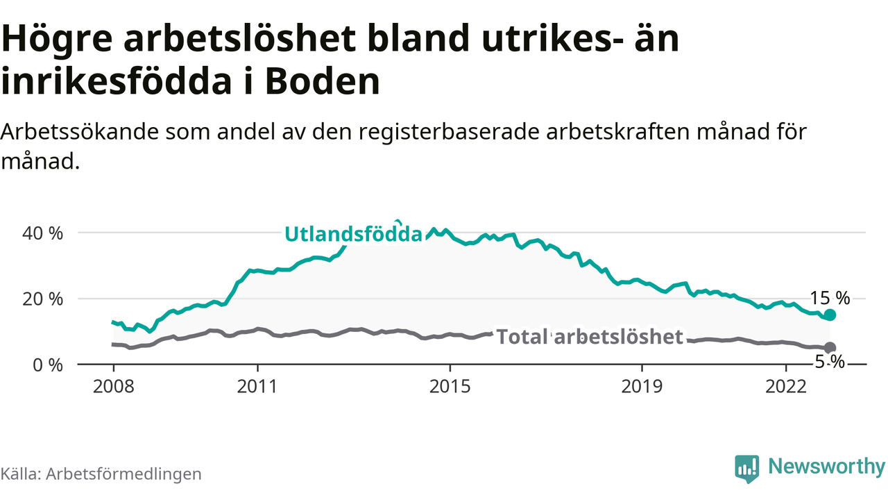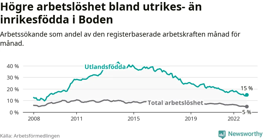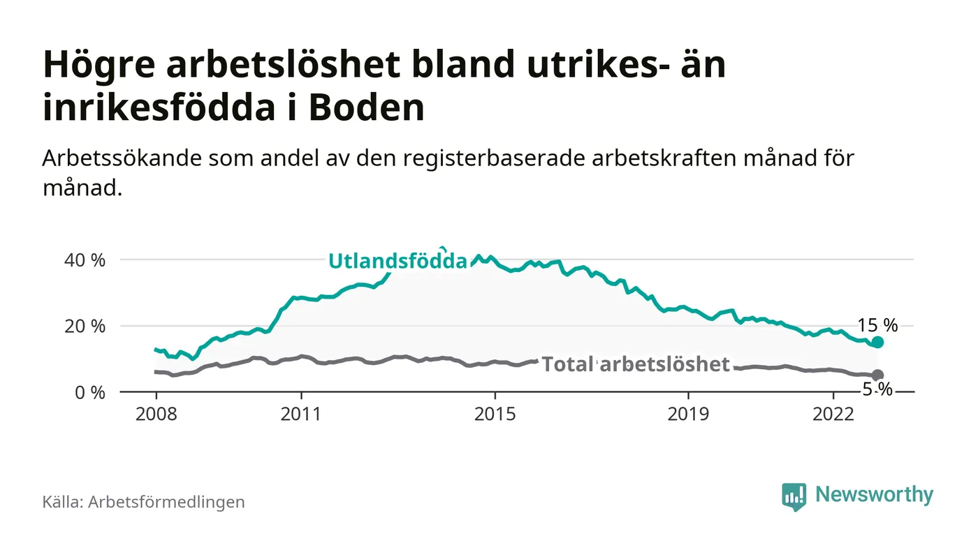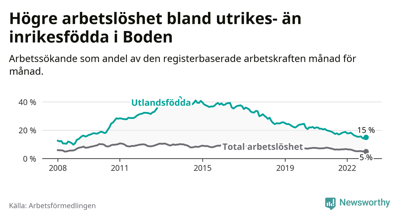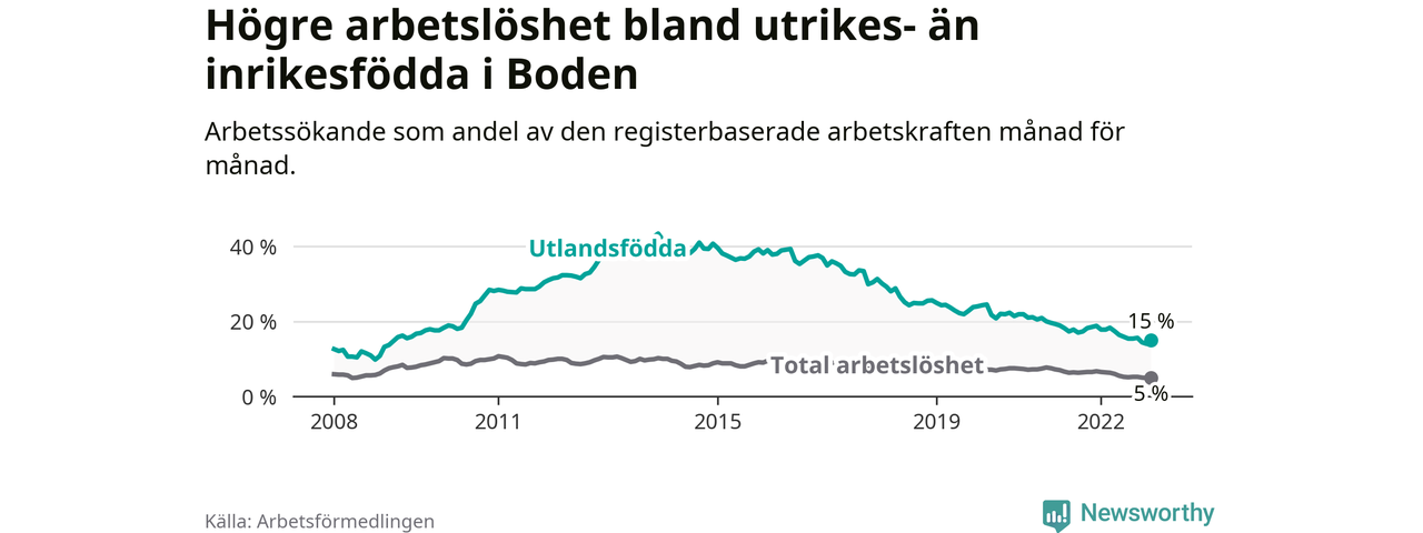 Arbetslösheten bland utlandsfödda var 15,0 procent i Boden under december månad, motsvarande 262 av 1 747 personer. Det är 3,8 procentenheter färre än vid samma tidpunkt i fjol (−66 om man räknar personer). Därmed har de utlandsföddas arbetslöshet varit lägre än vid samma tidpunkt i fjol i över två år i sträck. Sedan juli 2020 har arbetslösheten bland utlandsfödda minskat från 21,9 till 15,0 procent.