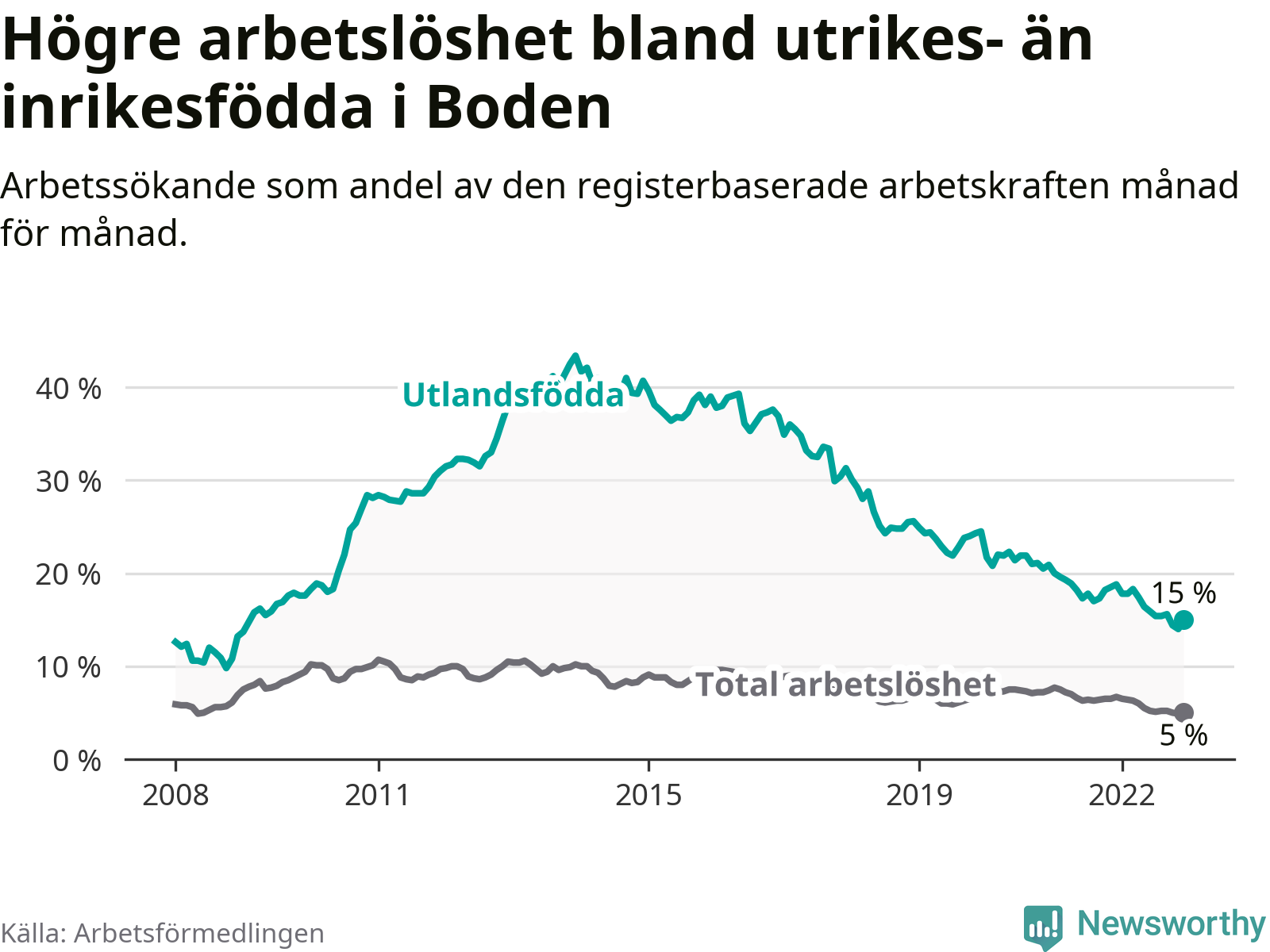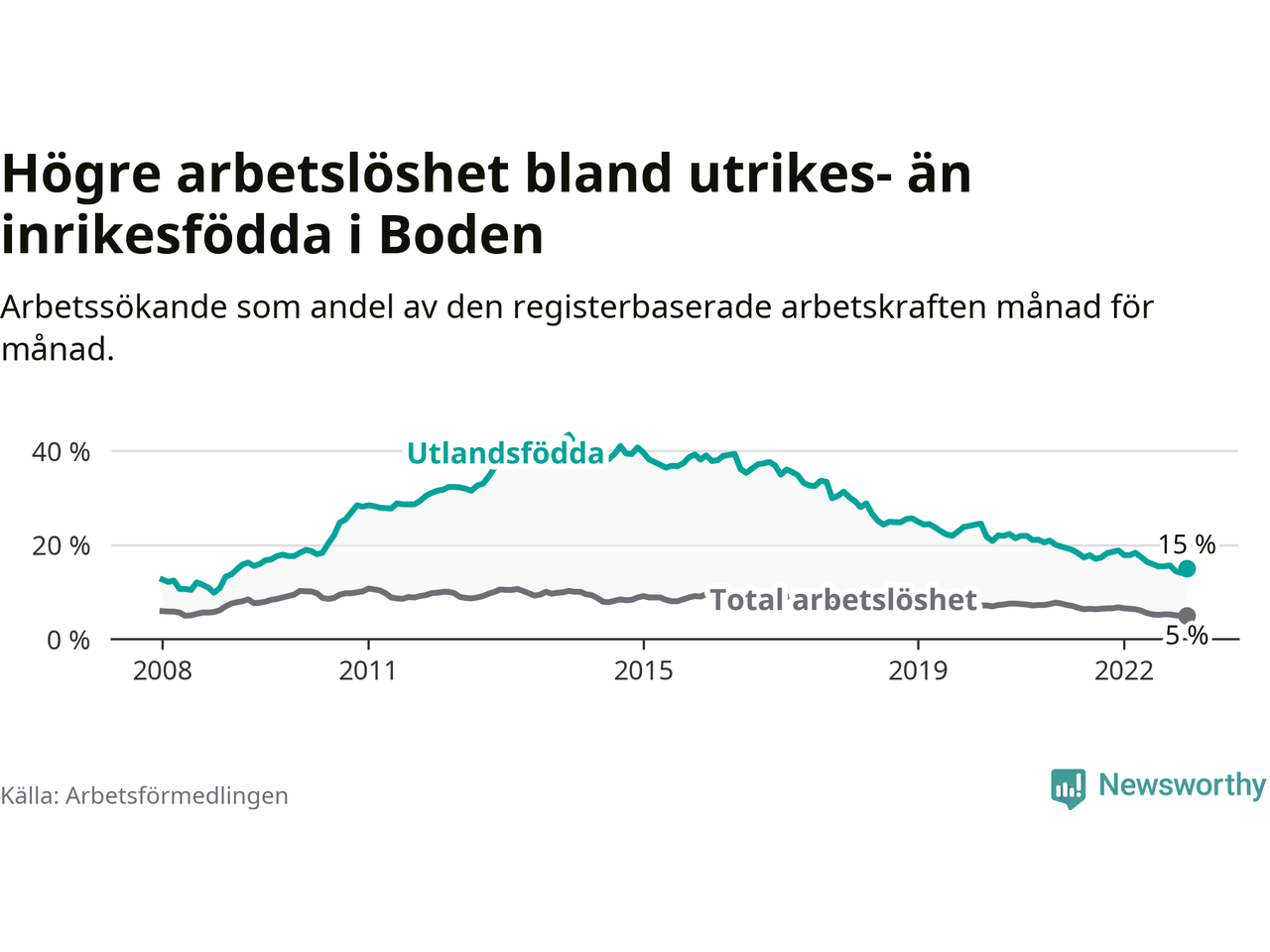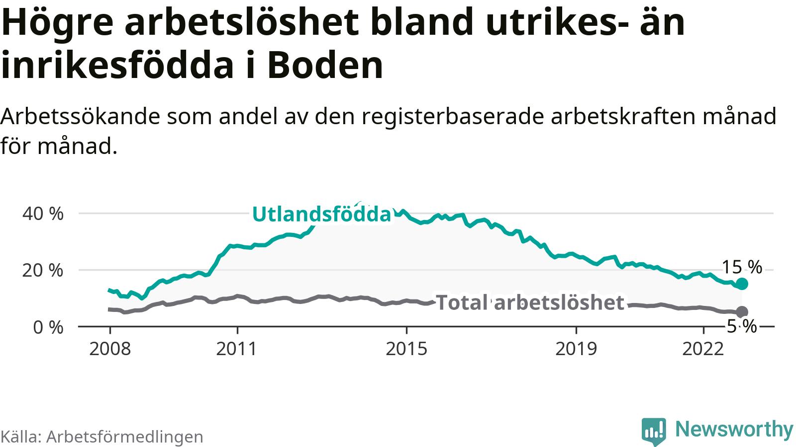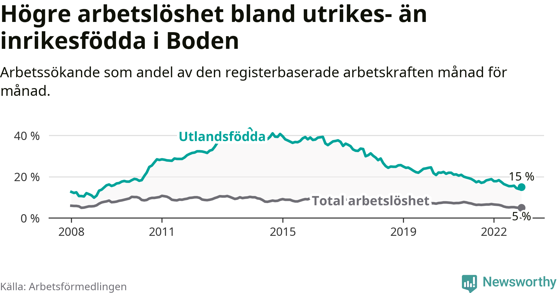 Arbetslösheten bland utlandsfödda var 15,0 procent i Boden under december månad, motsvarande 262 av 1 747 personer. Det är 3,8 procentenheter färre än vid samma tidpunkt i fjol (−66 om man räknar personer). Därmed har de utlandsföddas arbetslöshet varit lägre än vid samma tidpunkt i fjol i över två år i sträck. Sedan juli 2020 har arbetslösheten bland utlandsfödda minskat från 21,9 till 15,0 procent.