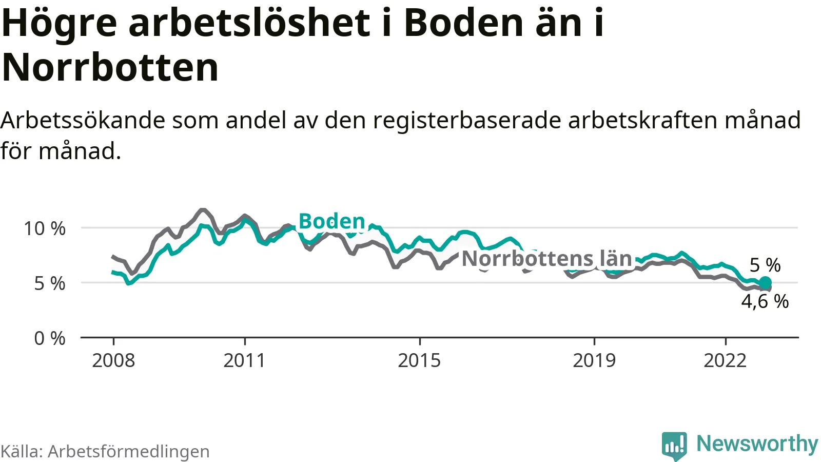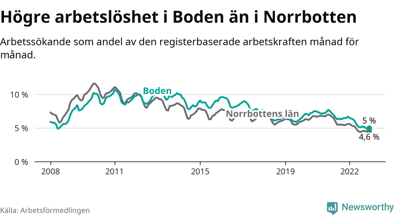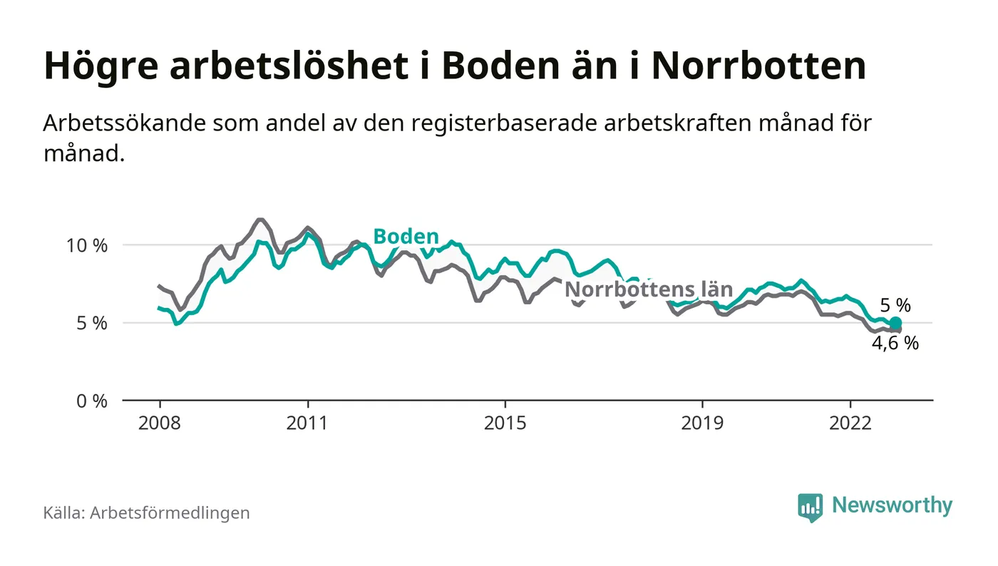 Även om arbetslösheten i Boden alltså minskar, så ligger den fortfarande över snittet i hela Norrbottens län (5,0 procent i kommunen, jämfört med 4,6 procent i hela länet). Kiruna har den lägsta arbetslösheten i länet (2,6 procent), medan Haparanda har den högsta (8,4 procent). För att Boden skulle komma ner i samma arbetslöshetsnivå som Kiruna skulle 327 personer behöva sysselsättas.