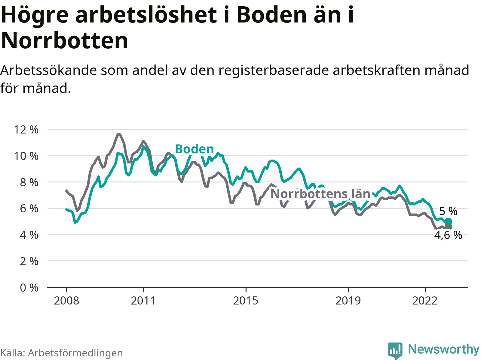 Under december månad rapporterade Bodens kommun en total arbetslöshet på 5,0 procent. Det är en minskning jämfört med samma tidpunkt i fjol (−1,7 procentenheter). Även i Norrbottens län sjunker arbetslösheten .