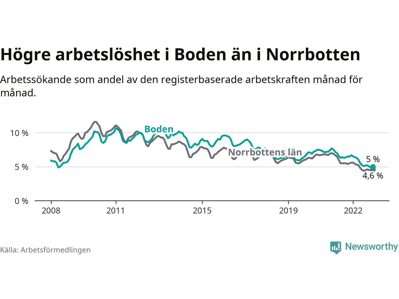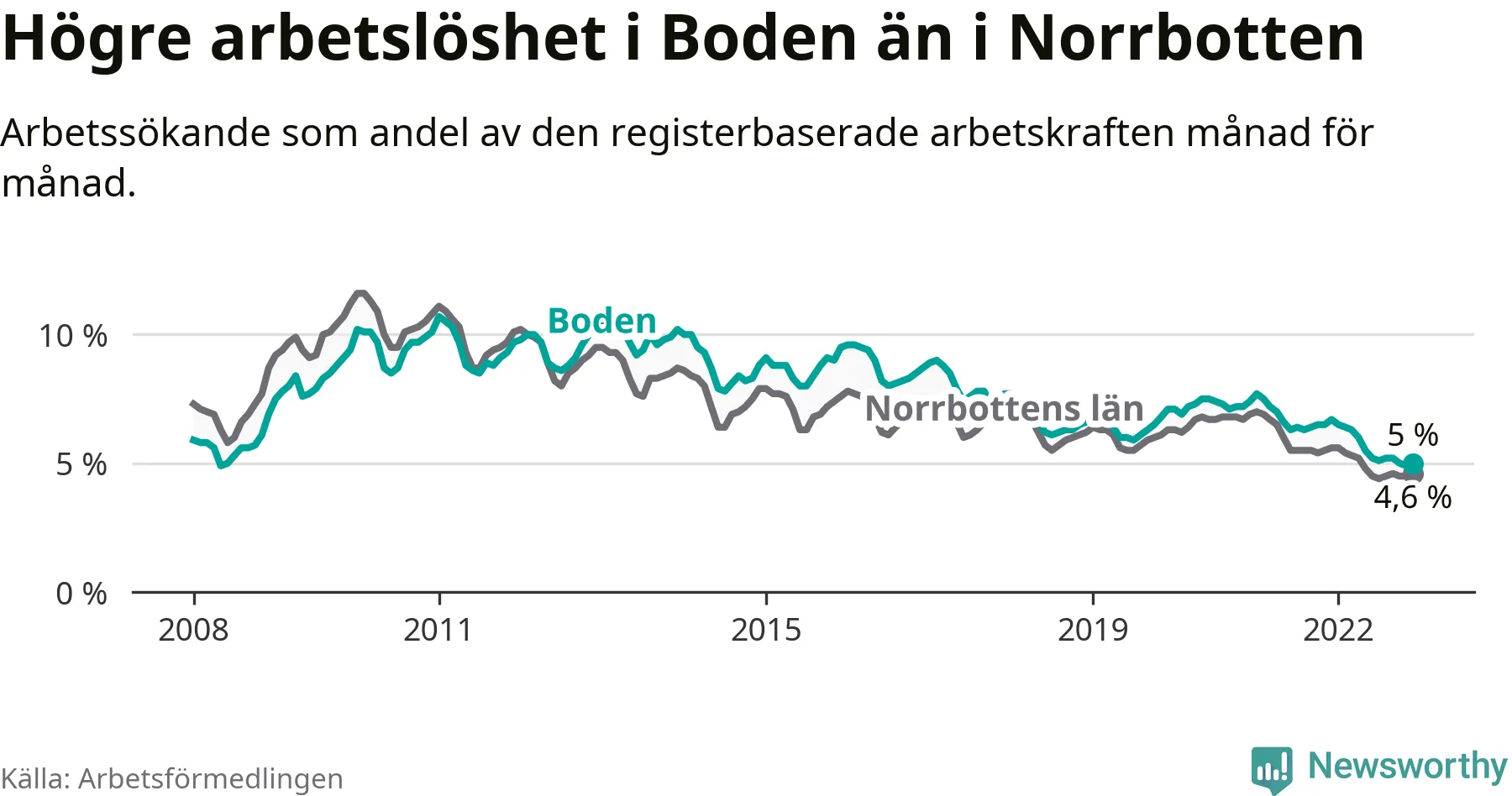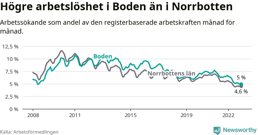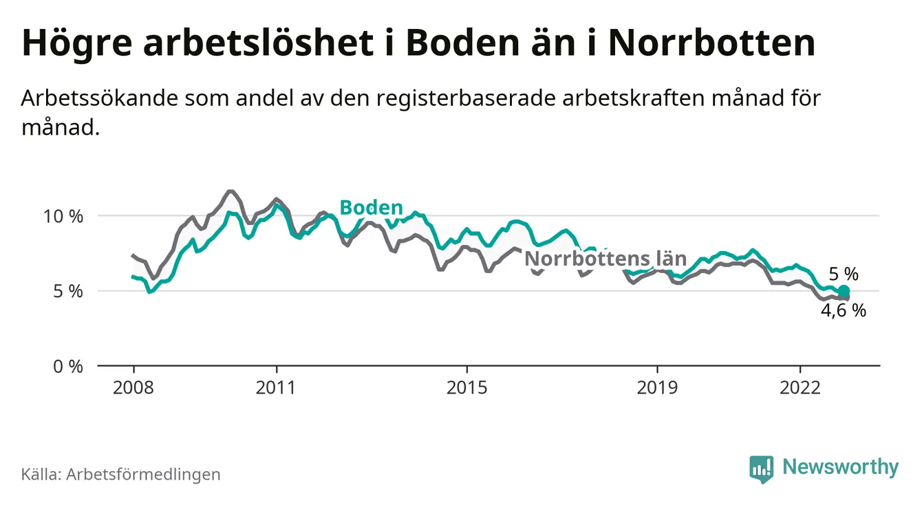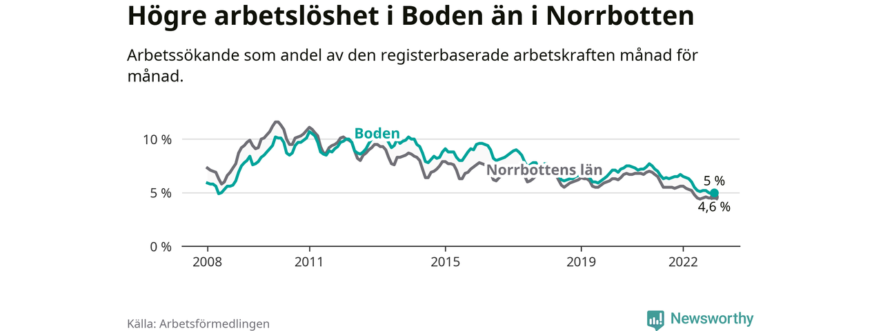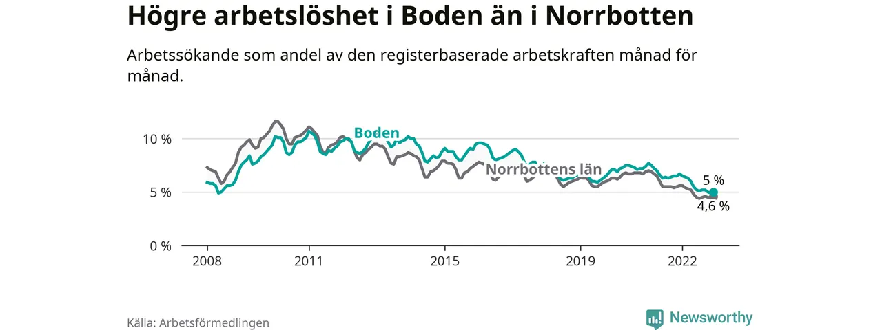 Det är 21:a månaden i följd som arbetslösheten i Boden är lägre än den var under samma tidpunkt året innan. Sedan mars 2021 har arbetslösheten gått ner från 7,2 till 5,0 procent.
