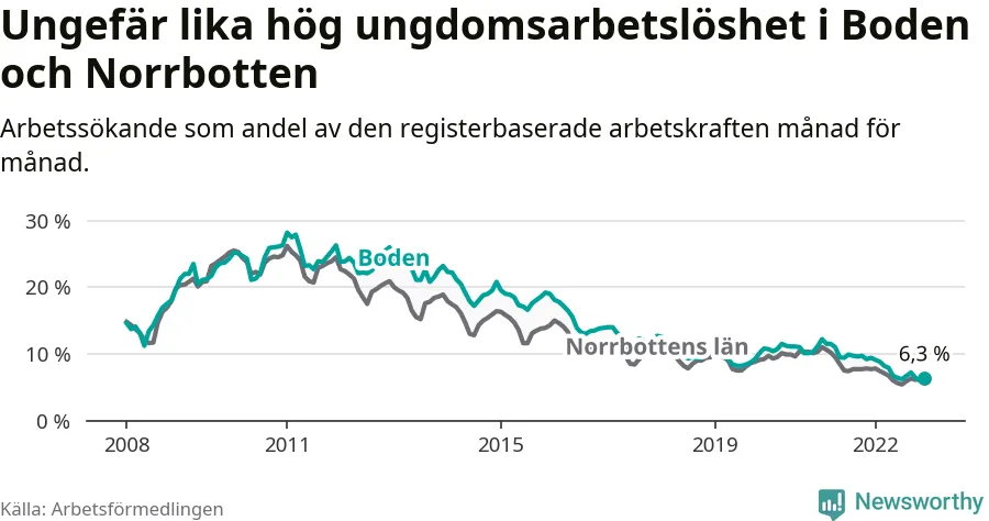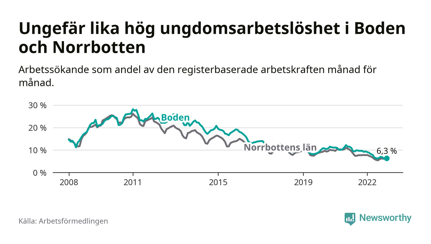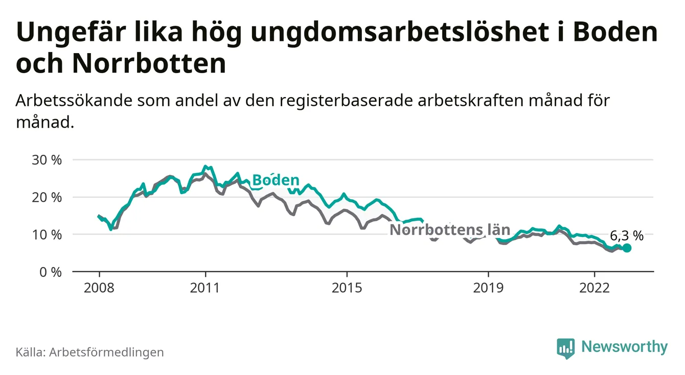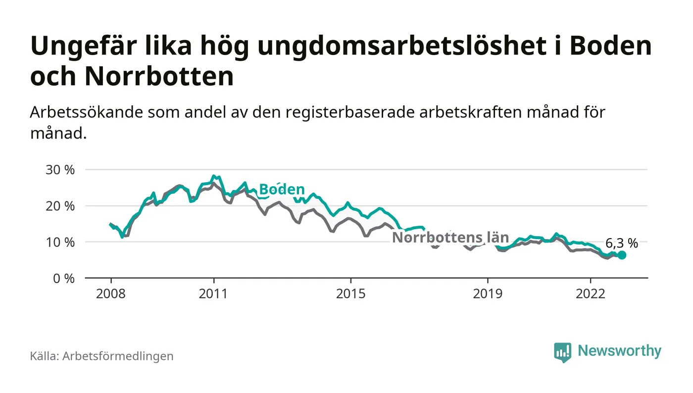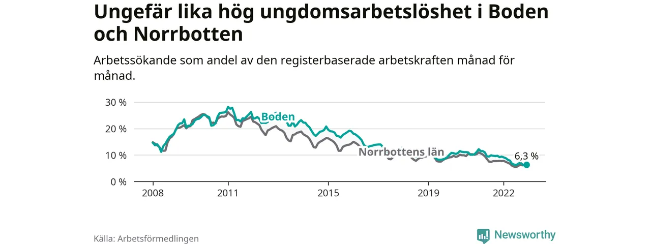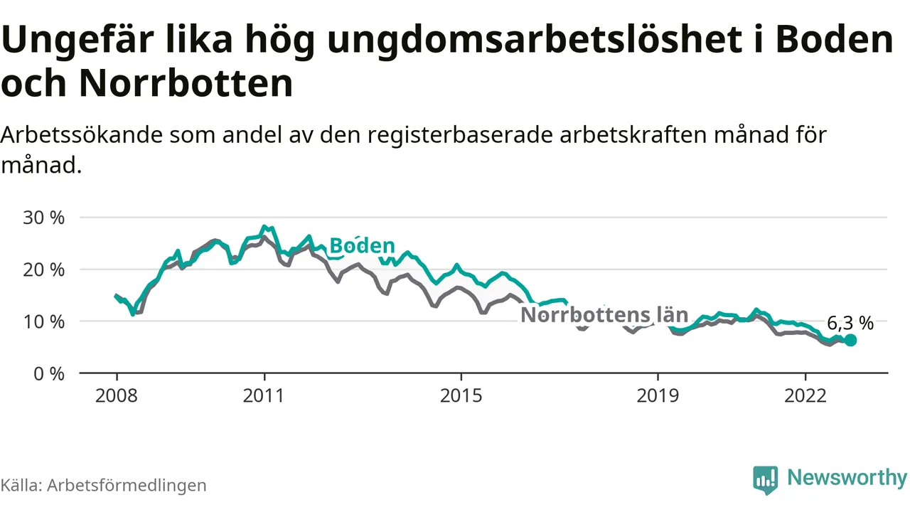 Medan Boden har högre total arbetslöshet än Norrbotten, ligger ungdomsarbetslösheten på i stort sett samma nivå.