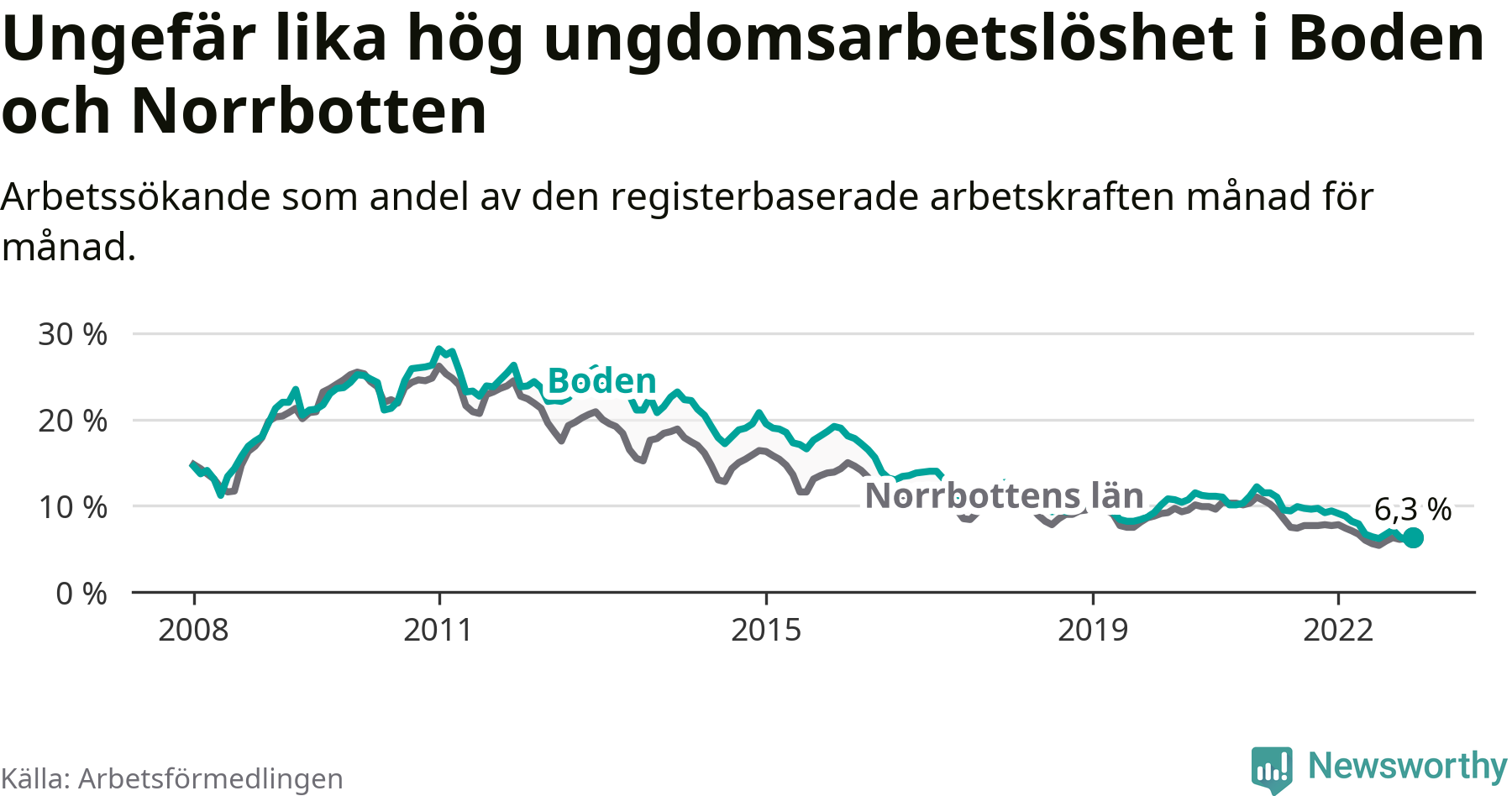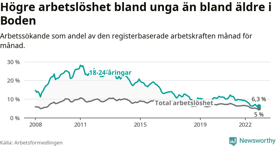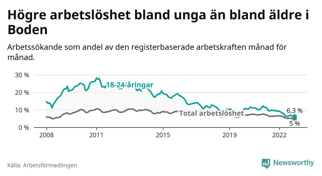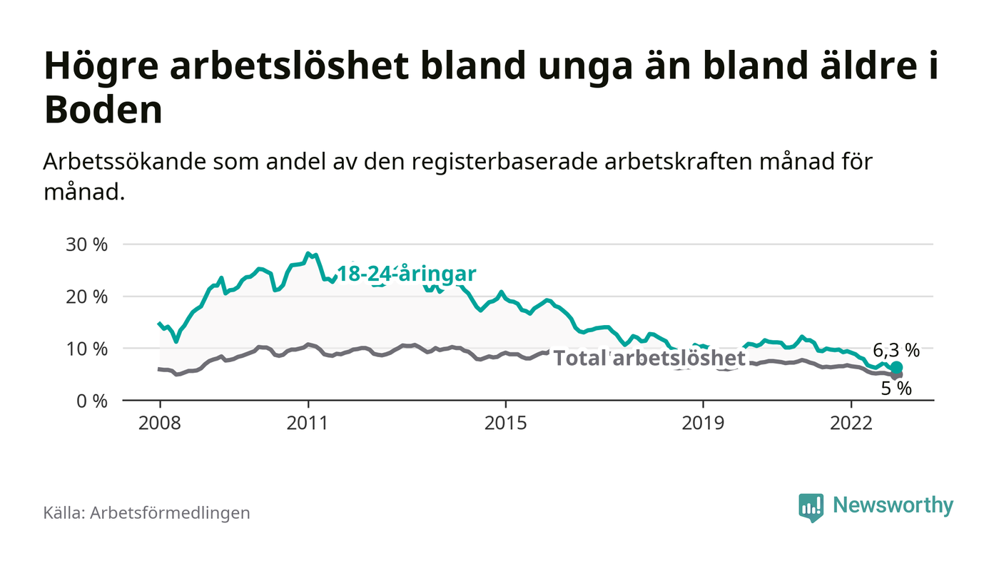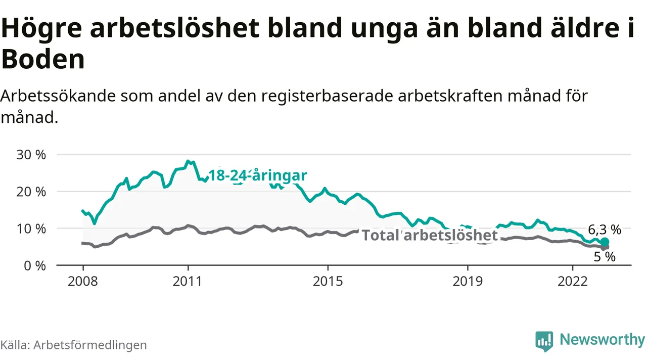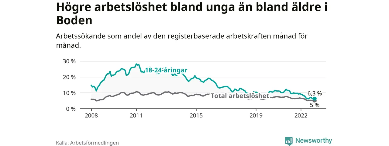 Medan Boden har högre total arbetslöshet än Norrbotten, ligger ungdomsarbetslösheten på i stort sett samma nivå.