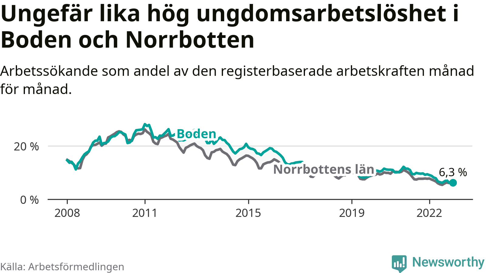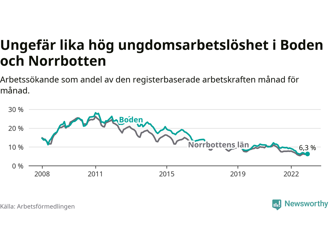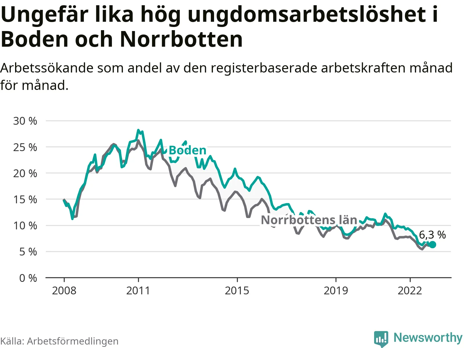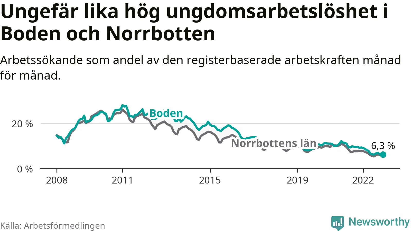 Medan Boden har högre total arbetslöshet än Norrbotten, ligger ungdomsarbetslösheten på i stort sett samma nivå.