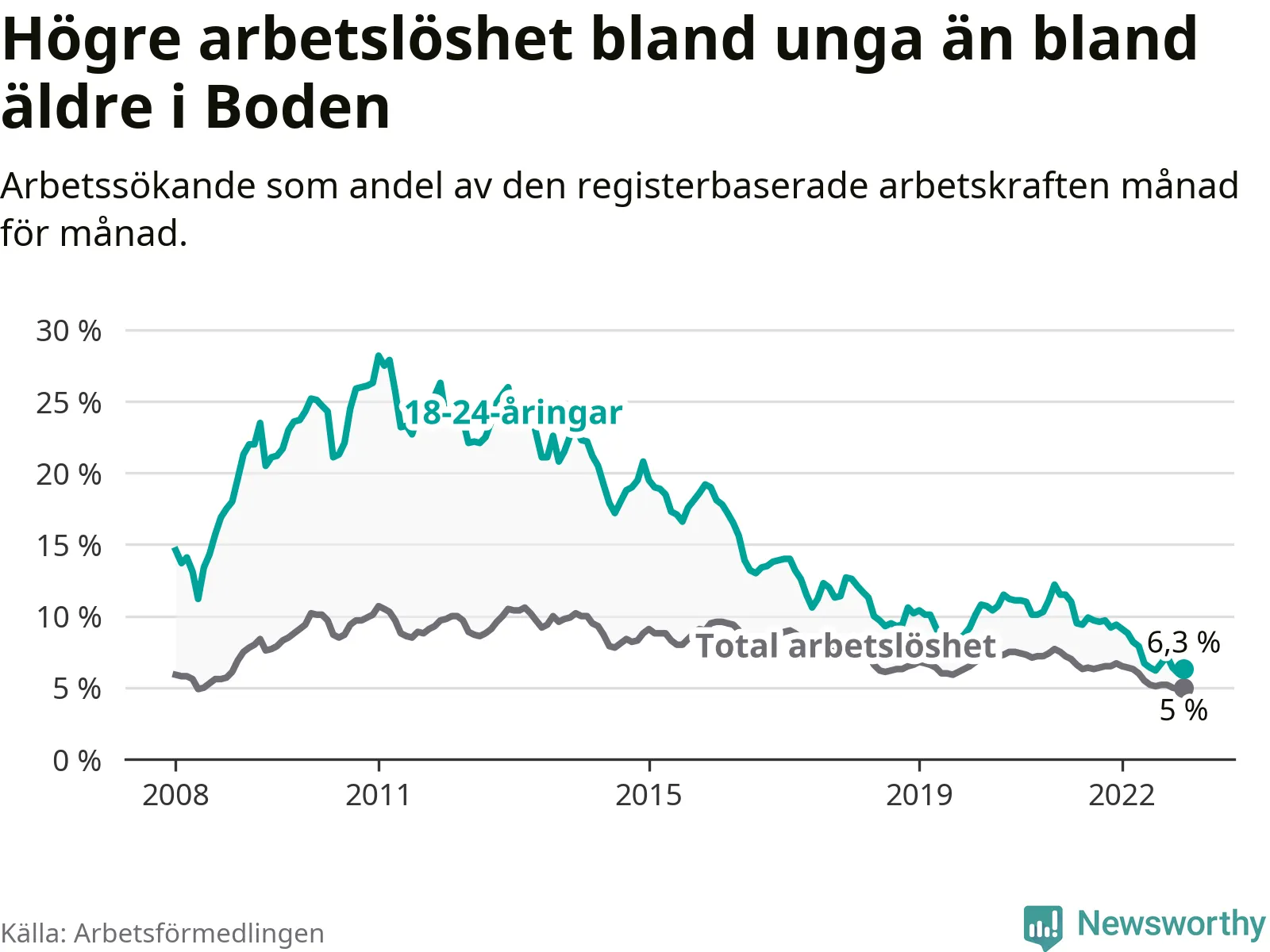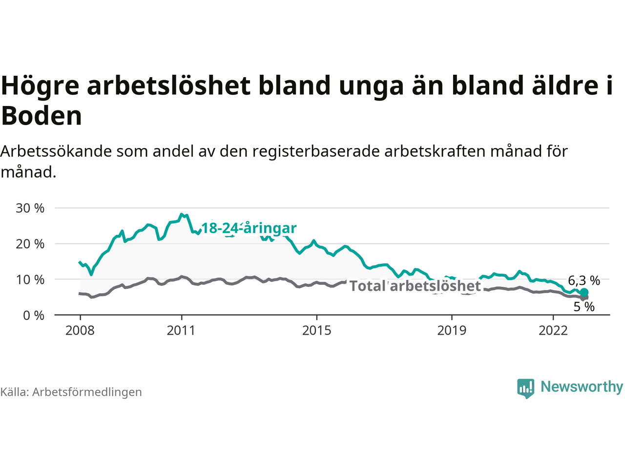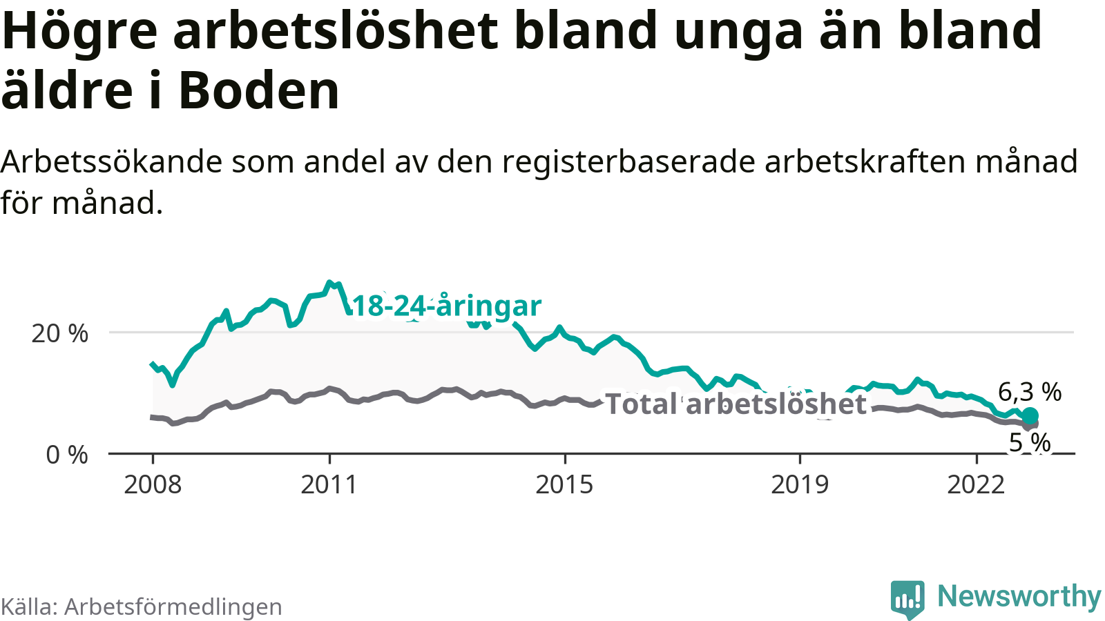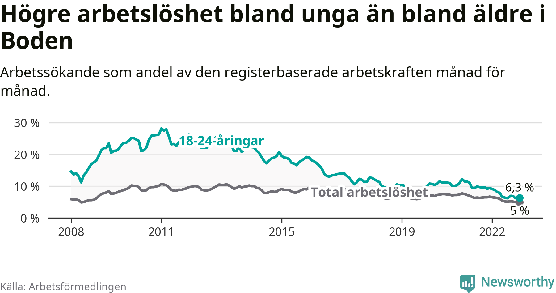 Medan Boden har högre total arbetslöshet än Norrbotten, ligger ungdomsarbetslösheten på i stort sett samma nivå.