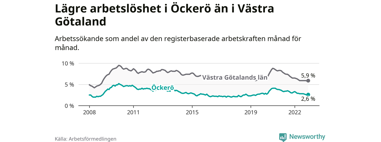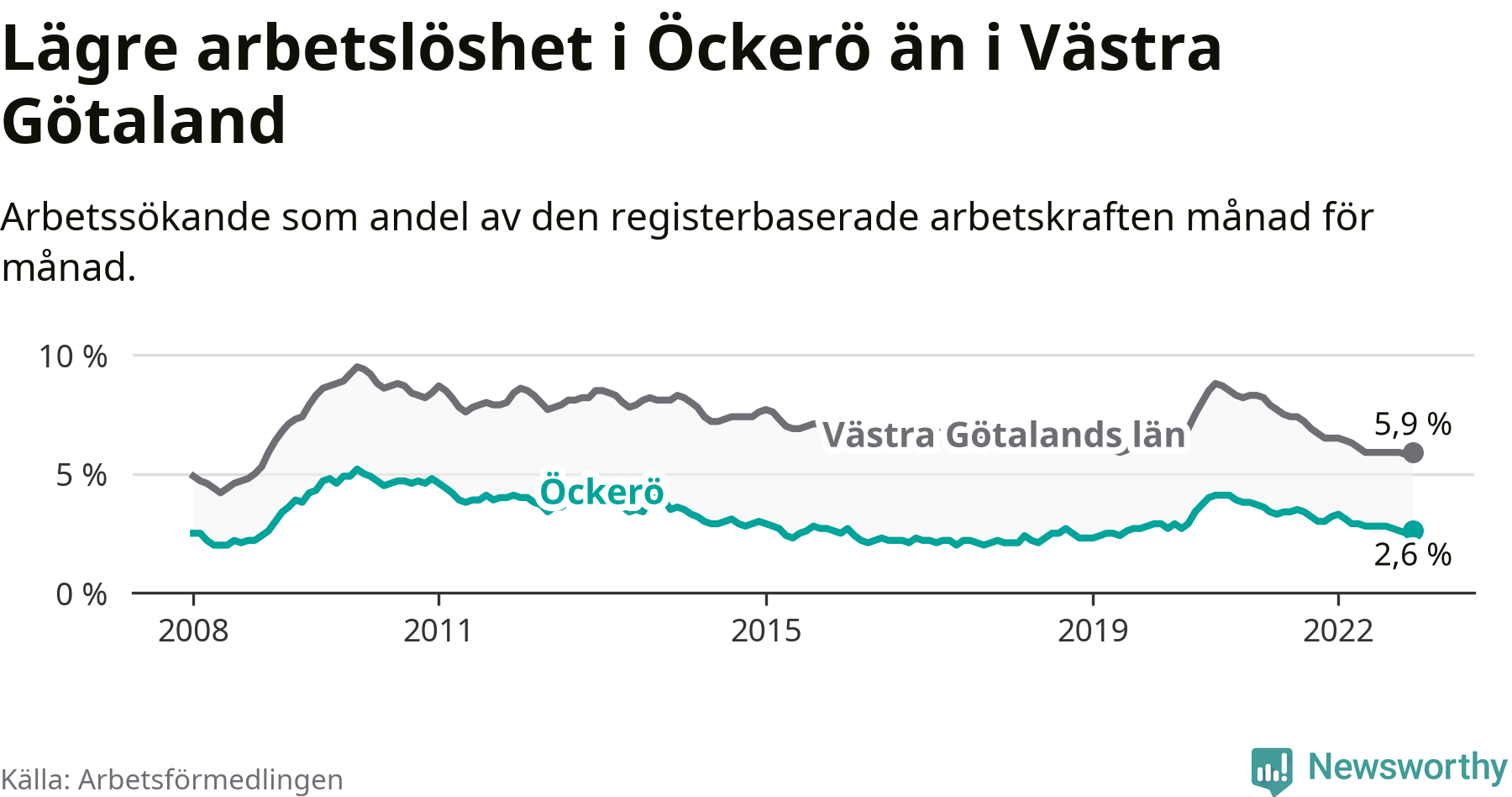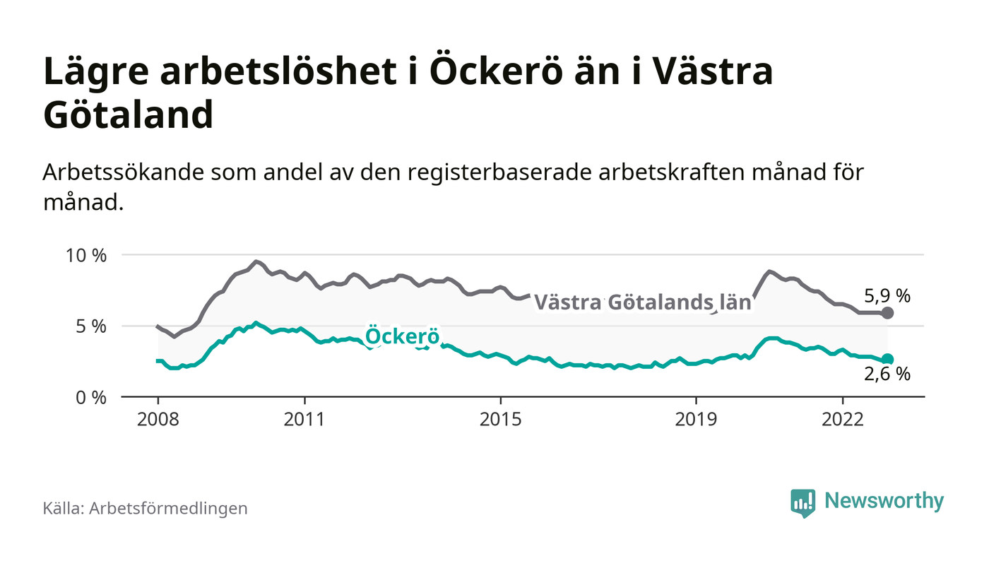 Öckerö hade redan tidigare lägre arbetslöshet än snittet i hela Västra Götalands län och nu växer klyftan (2,6 procent i kommunen, jämfört med 5,9 procent i hela länet). Öckerö har därmed även den lägsta arbetslöshetsnivån i inte bara länet, utan även hela Sverige. Trollhättan har den högsta (9,1 procent).