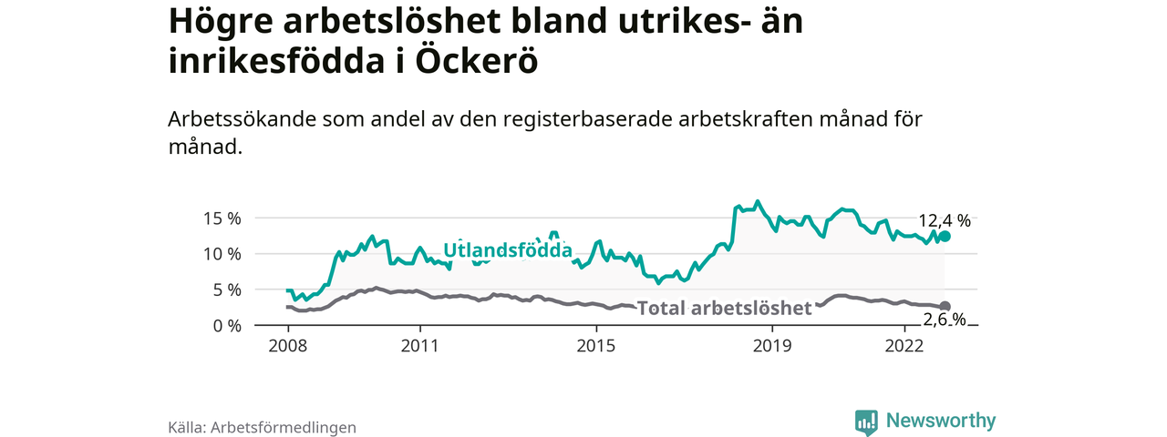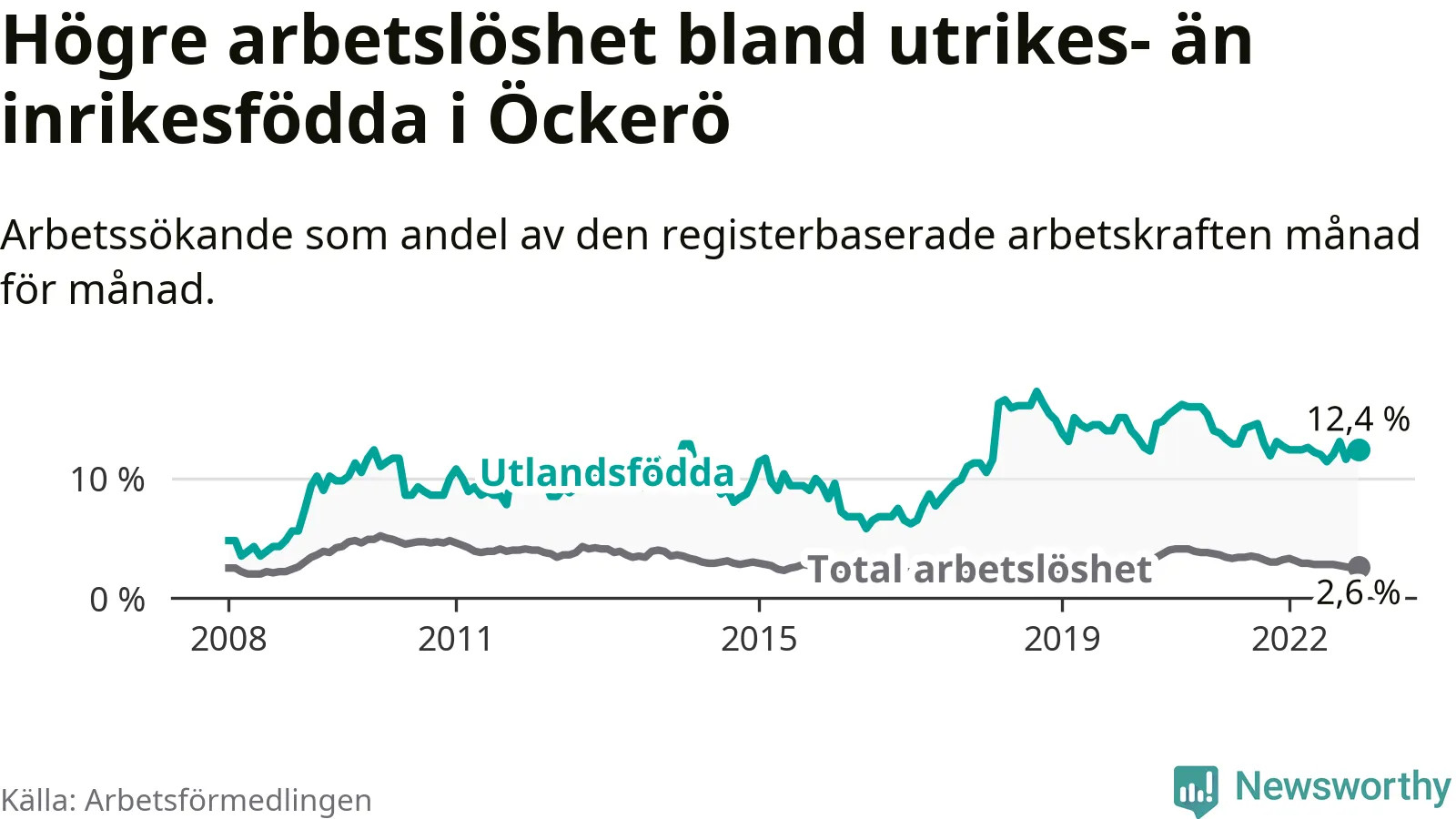 Arbetslösheten bland utlandsfödda var 12,4 procent på Öckerö under december månad, motsvarande 59 av 476 personer. Det är 0,3 procentenheter färre än vid samma tidpunkt i fjol (+2 om man räknar personer).
