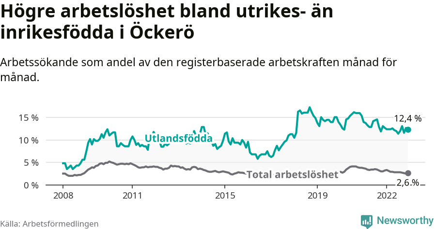 | Bland utlandsfödda | 12,4 % | −0,3 % ▼ | 15,0 % | −1,4 % ▼ | 16,6 % | −1,2 % ▼ |