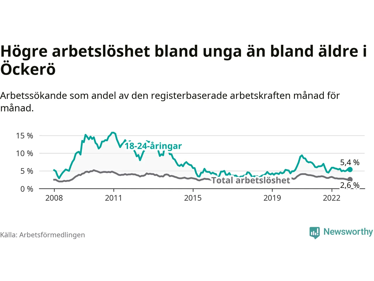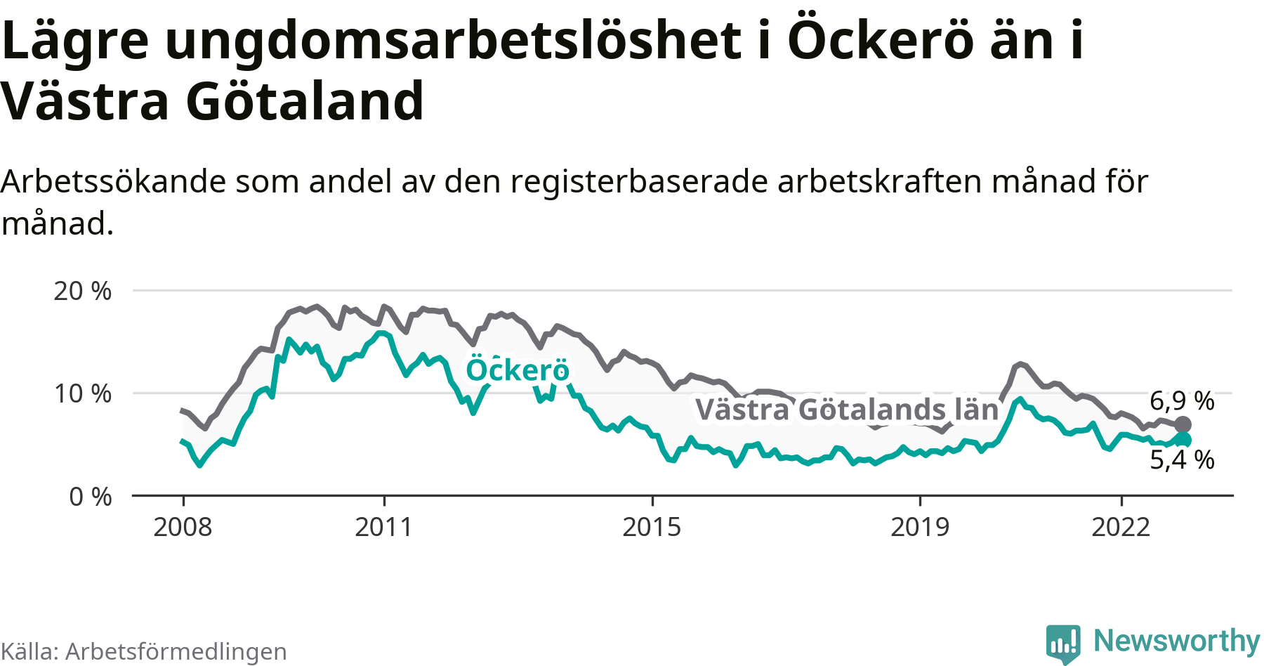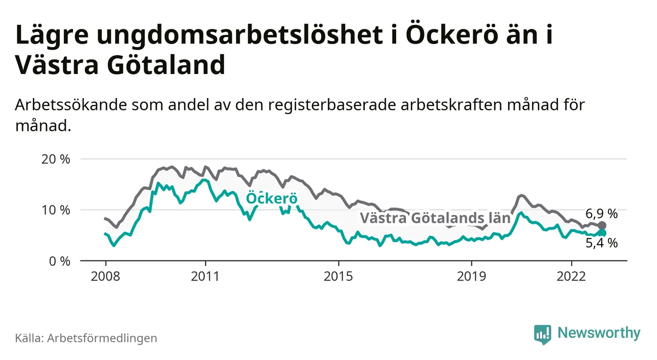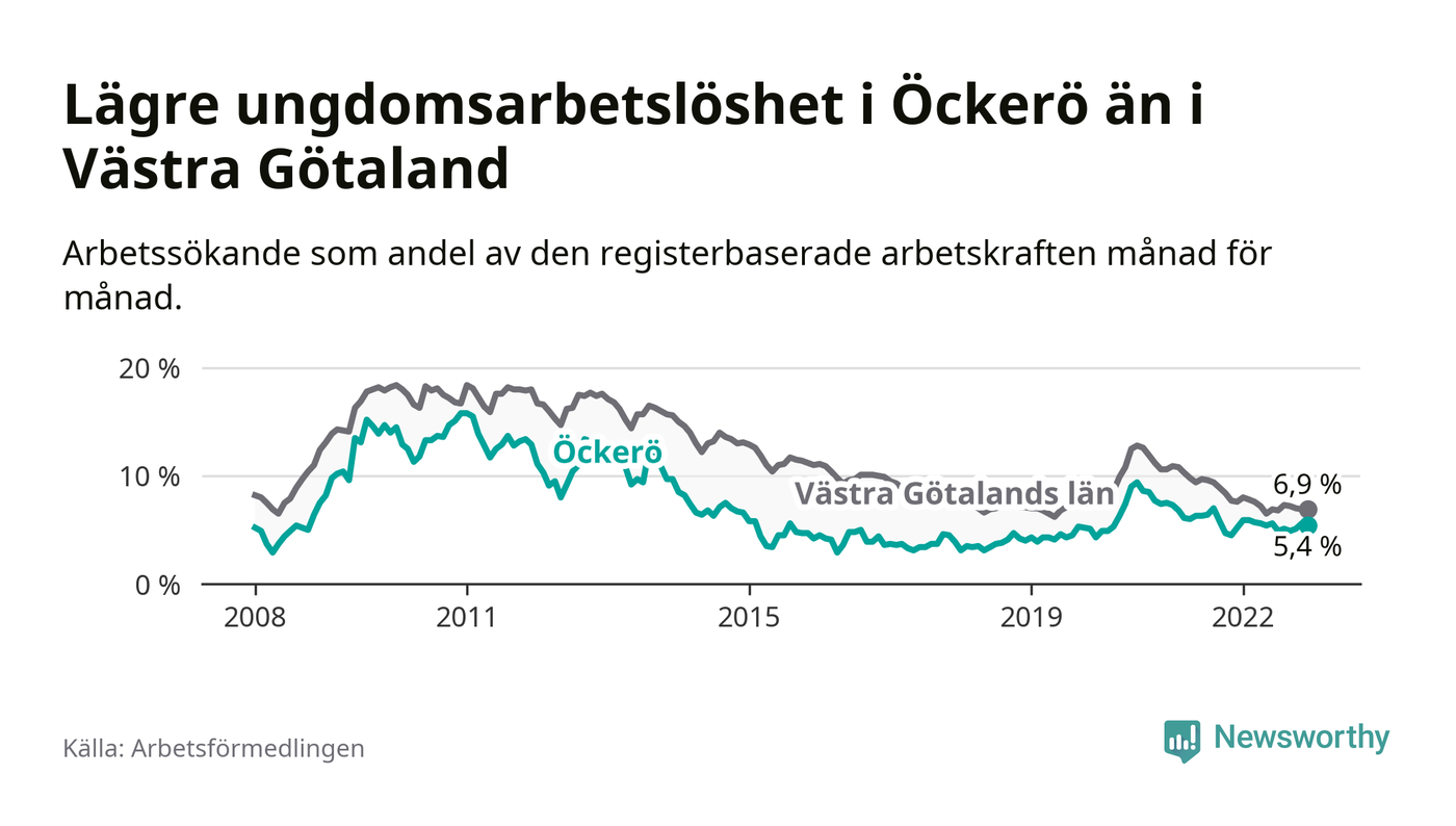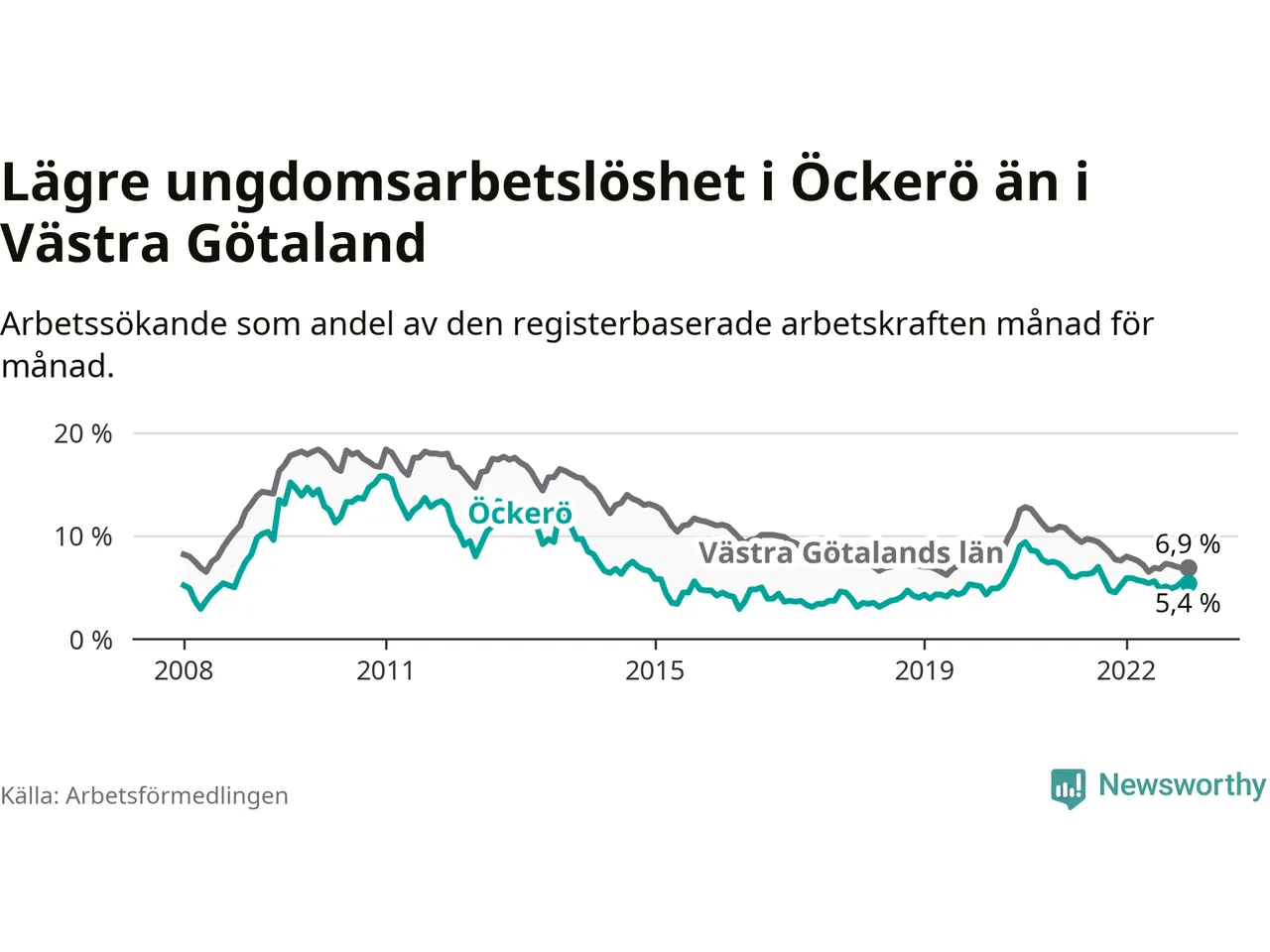 Precis som den totala arbetslösheten ligger ungdomsarbetslösheten på Öckerö lägre än i Västra Götaland som helhet. Skillnaden mellan kommunen och länet är 1,5 procentenheter.