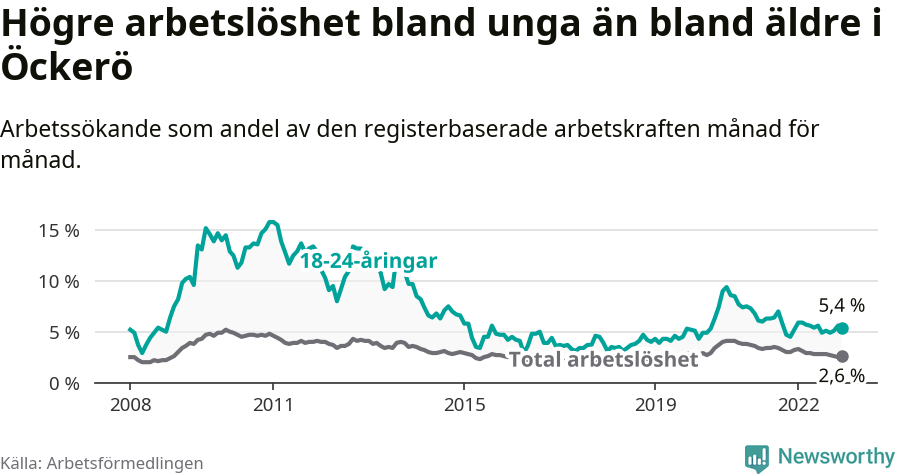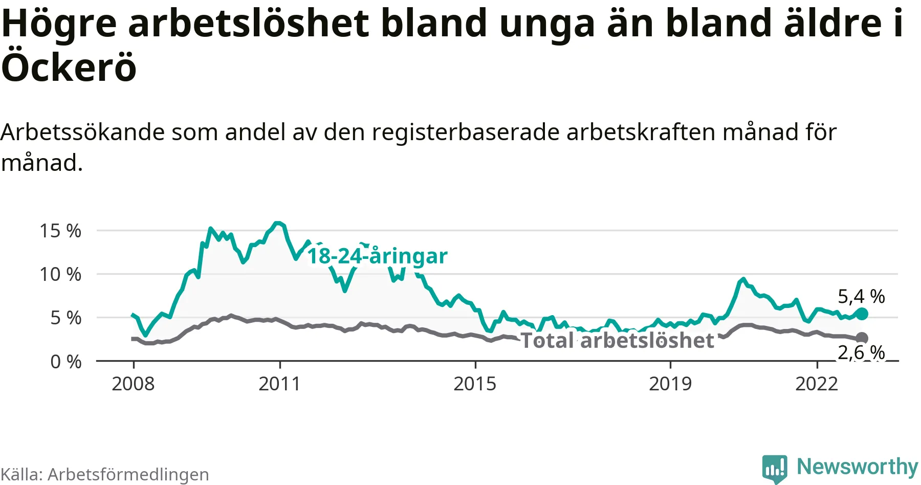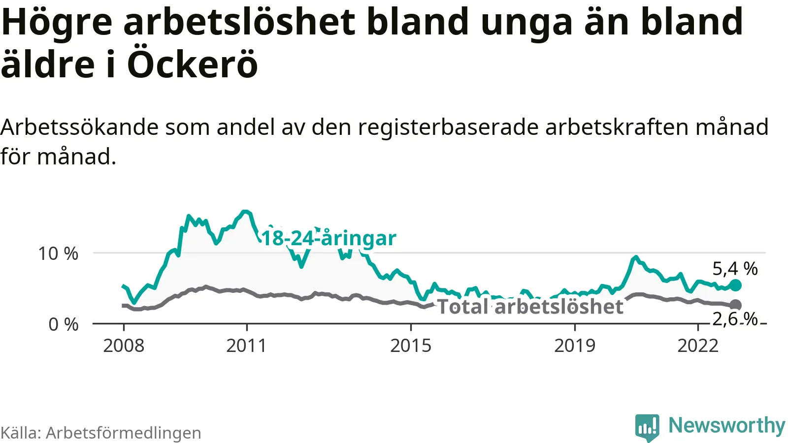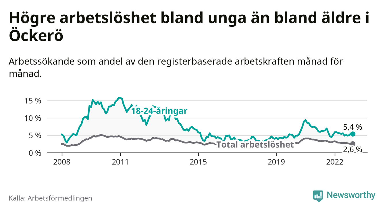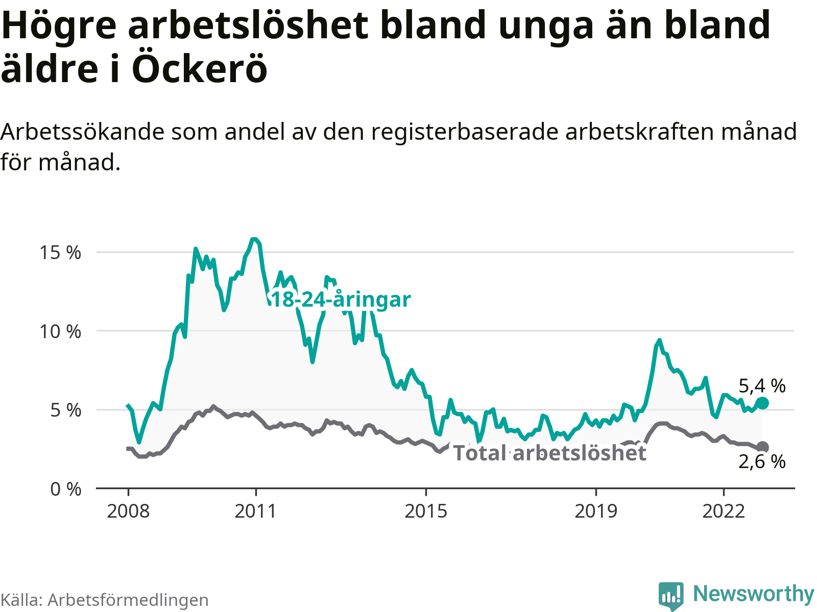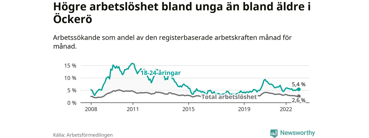 Precis som den totala arbetslösheten ligger ungdomsarbetslösheten på Öckerö lägre än i Västra Götaland som helhet. Skillnaden mellan kommunen och länet är 1,5 procentenheter.