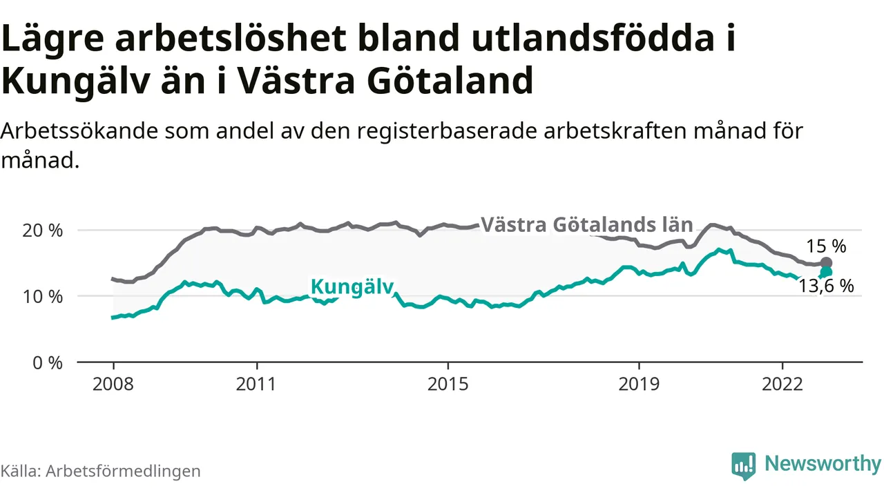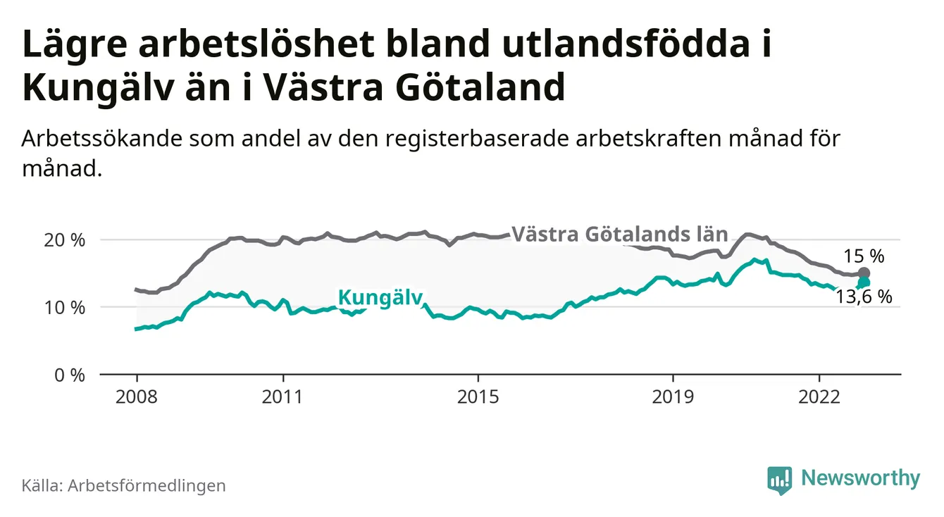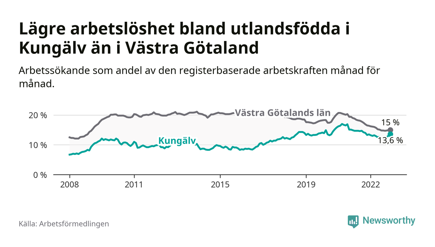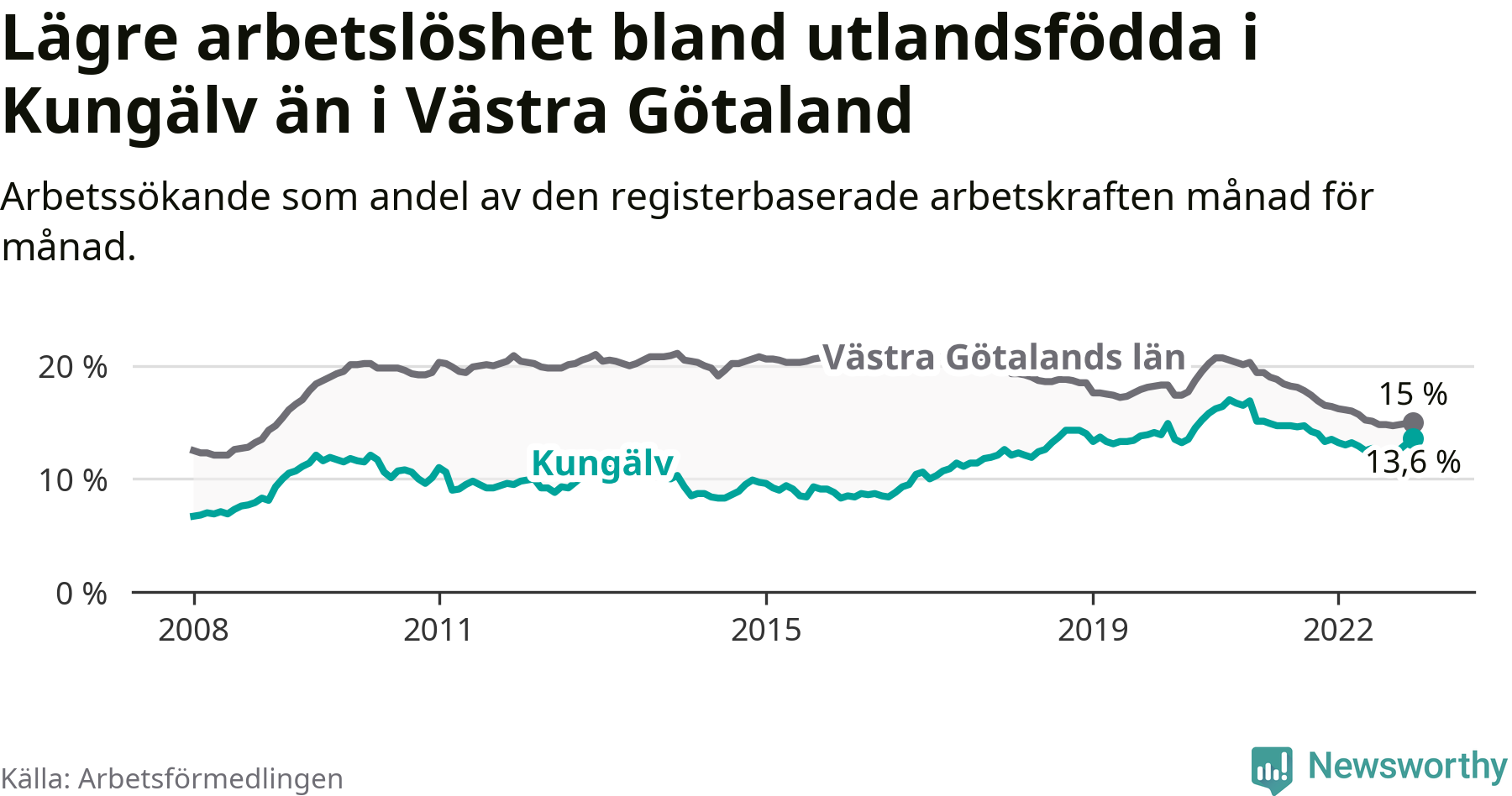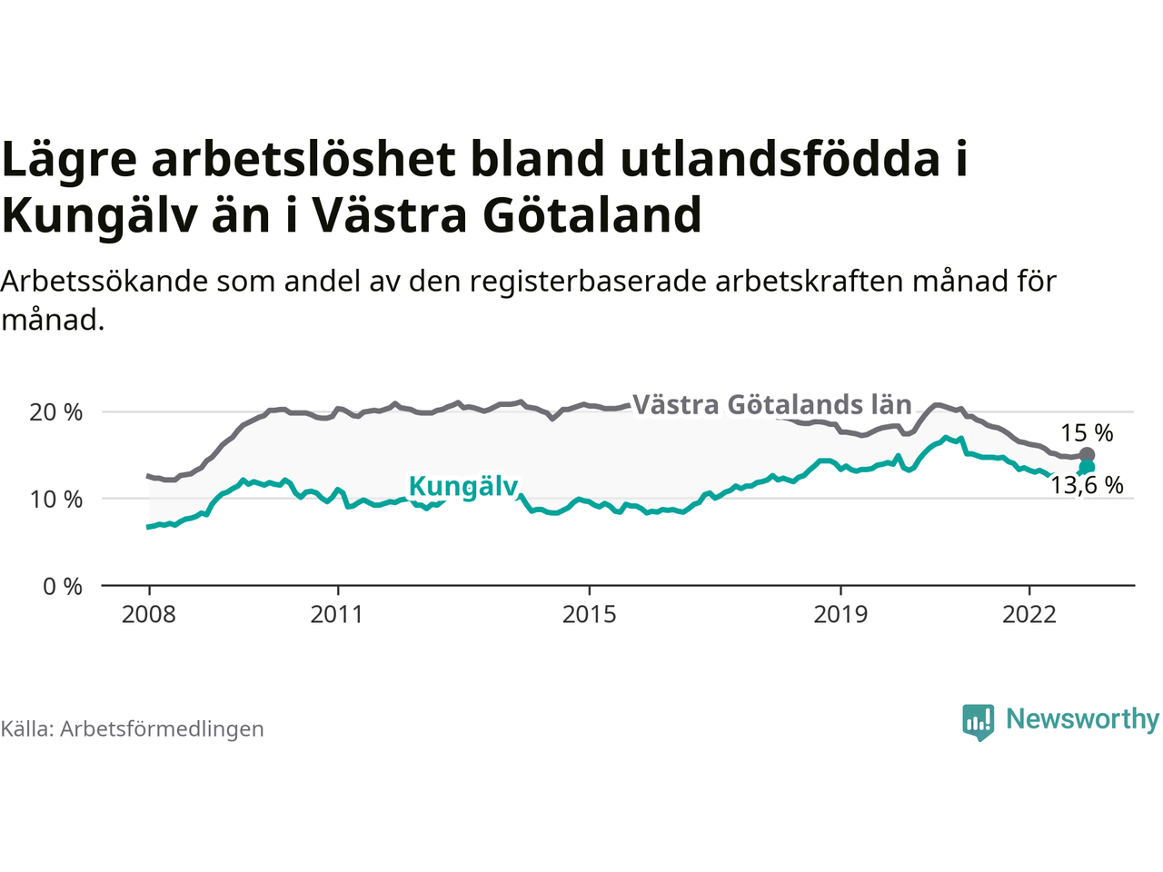 Medan arbetslösheten bland utlandsfödda alltså ökar i Kungälv så minskar den i Västra Götaland. Jämfört med december förra året har andelen arbetslösa utlandsfödda i länet minskat med 1,4 procentenheter (till 15,0 procent). Trots den senaste uppgången har Kungälv med andra ord fortfarande lägre arbetslöshet bland utlandsfödda än Västra Götaland.