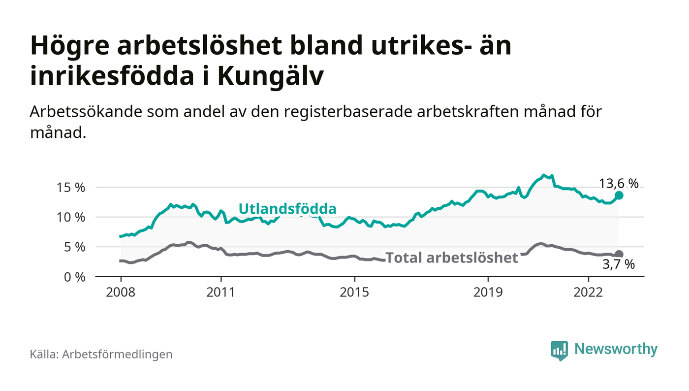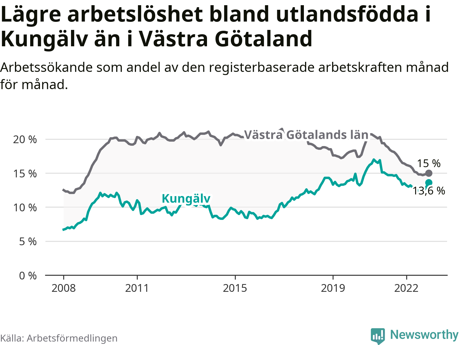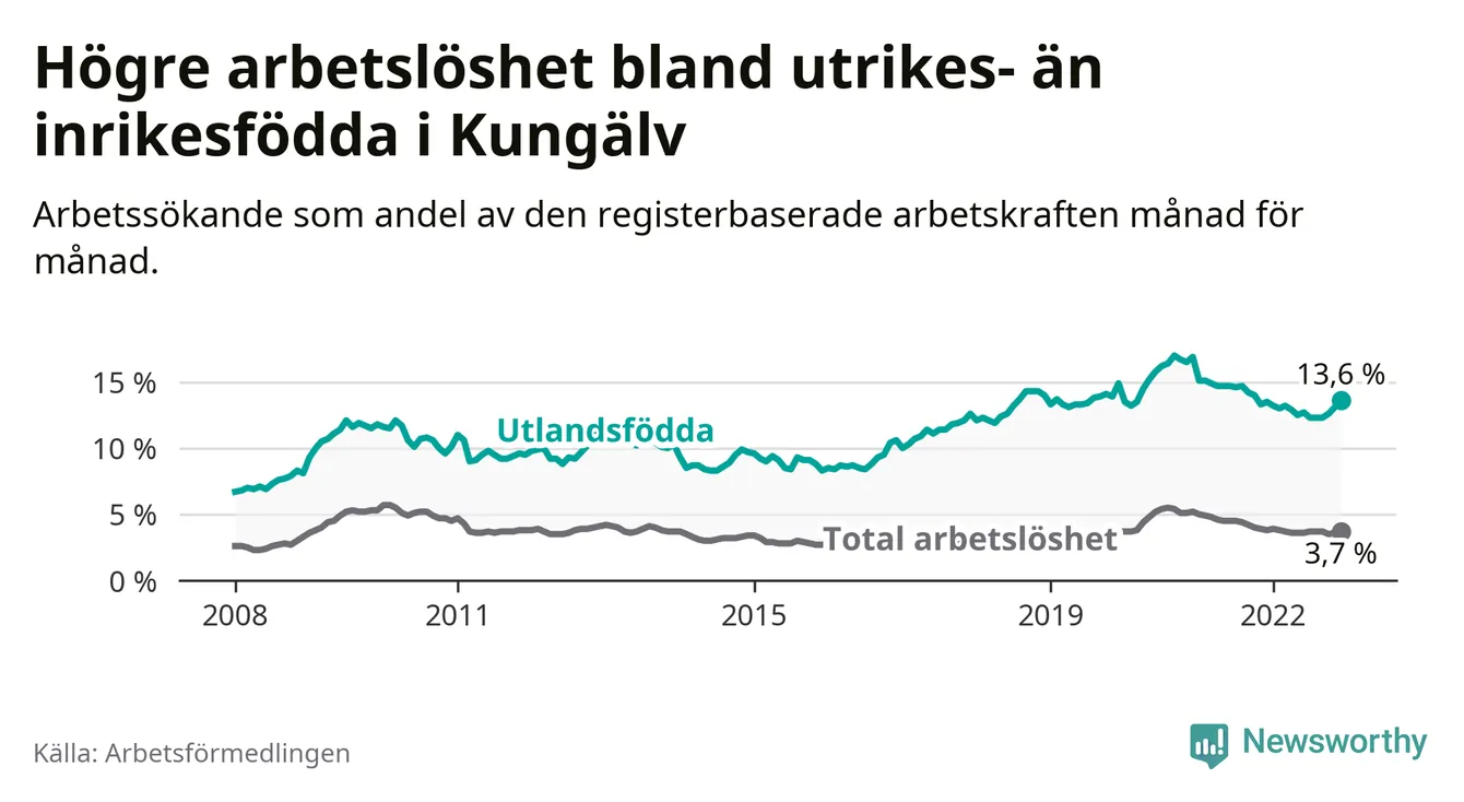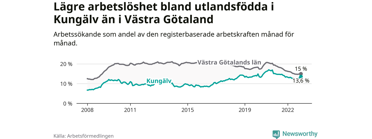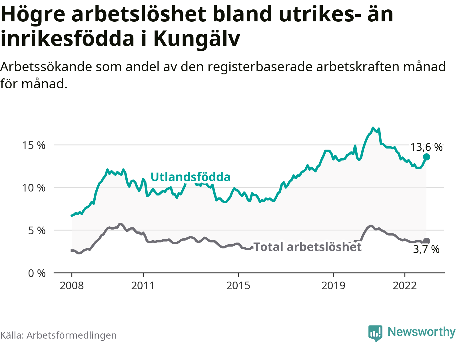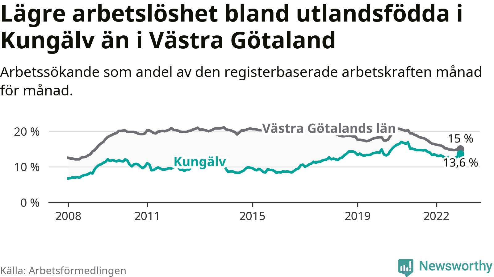 Medan arbetslösheten bland utlandsfödda alltså ökar i Kungälv så minskar den i Västra Götaland. Jämfört med december förra året har andelen arbetslösa utlandsfödda i länet minskat med 1,4 procentenheter (till 15,0 procent). Trots den senaste uppgången har Kungälv med andra ord fortfarande lägre arbetslöshet bland utlandsfödda än Västra Götaland.