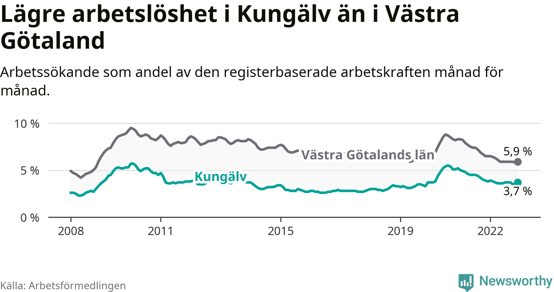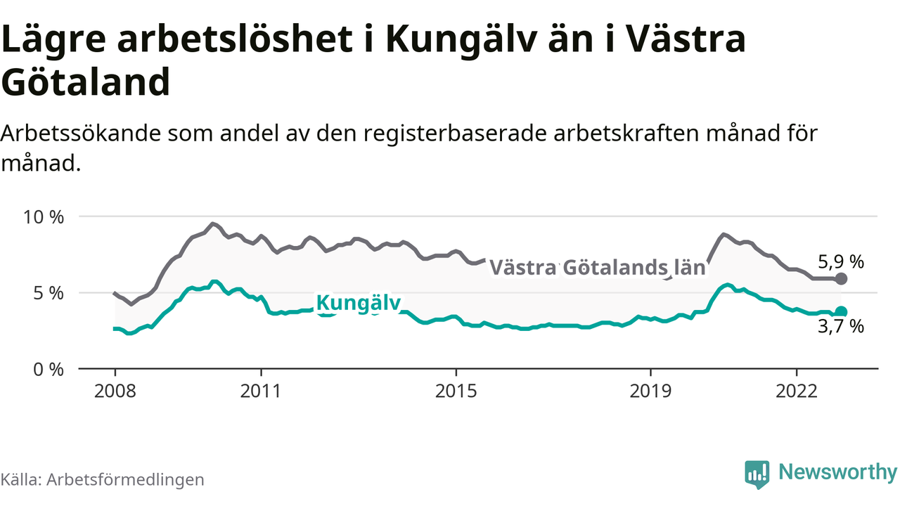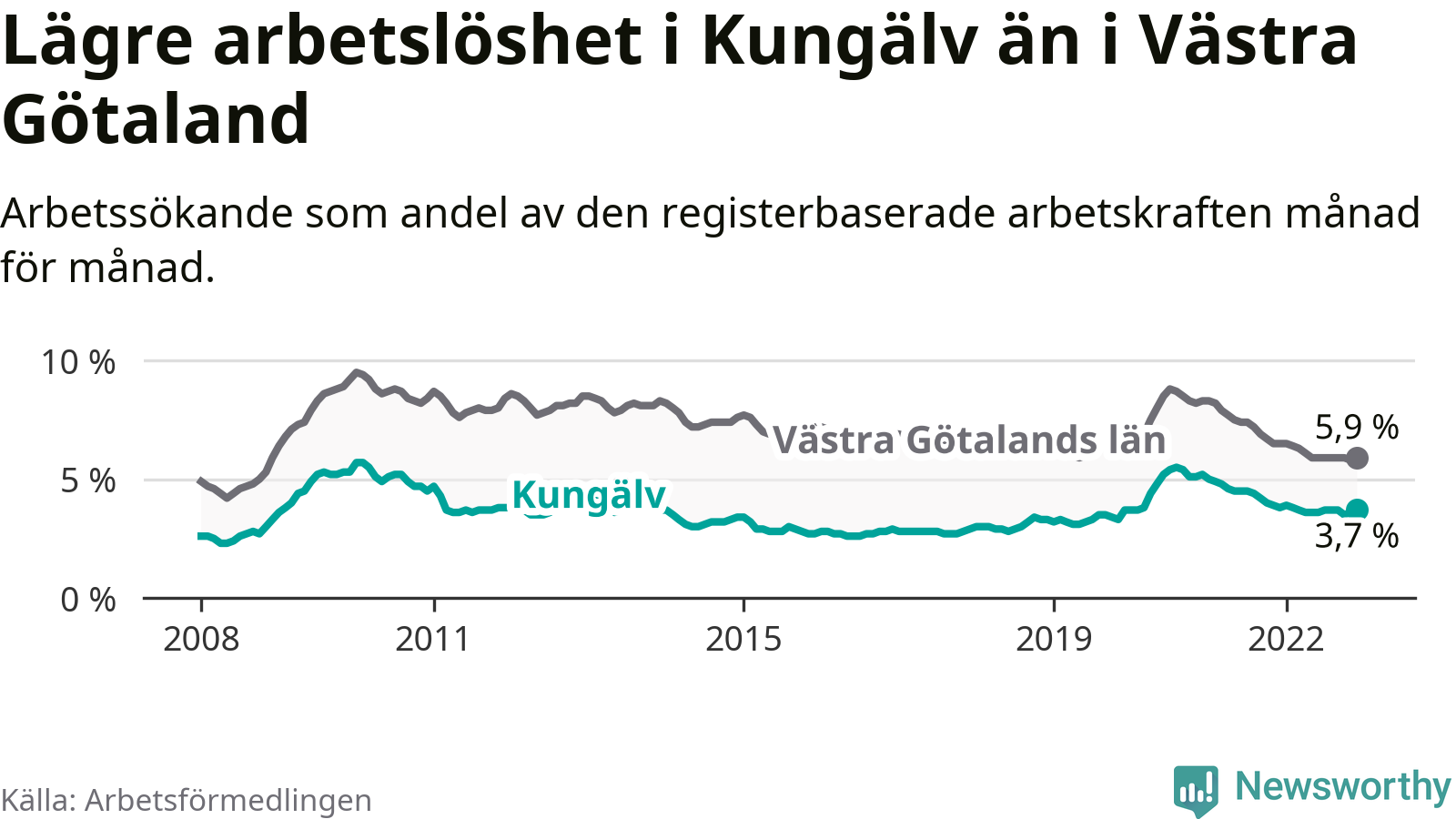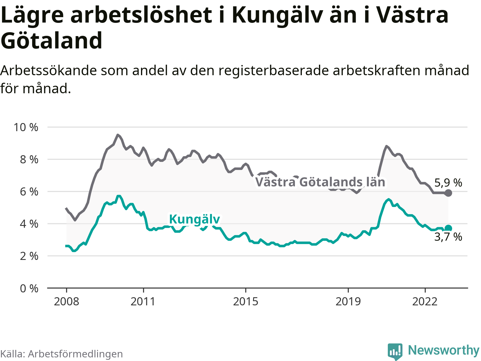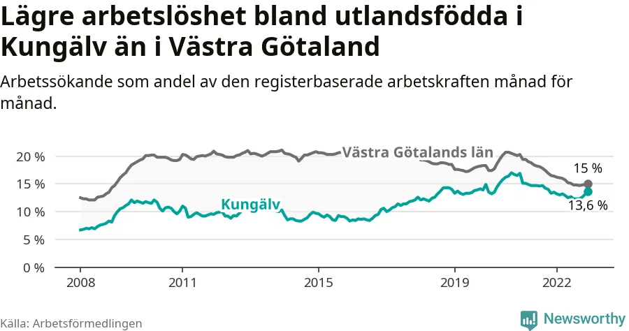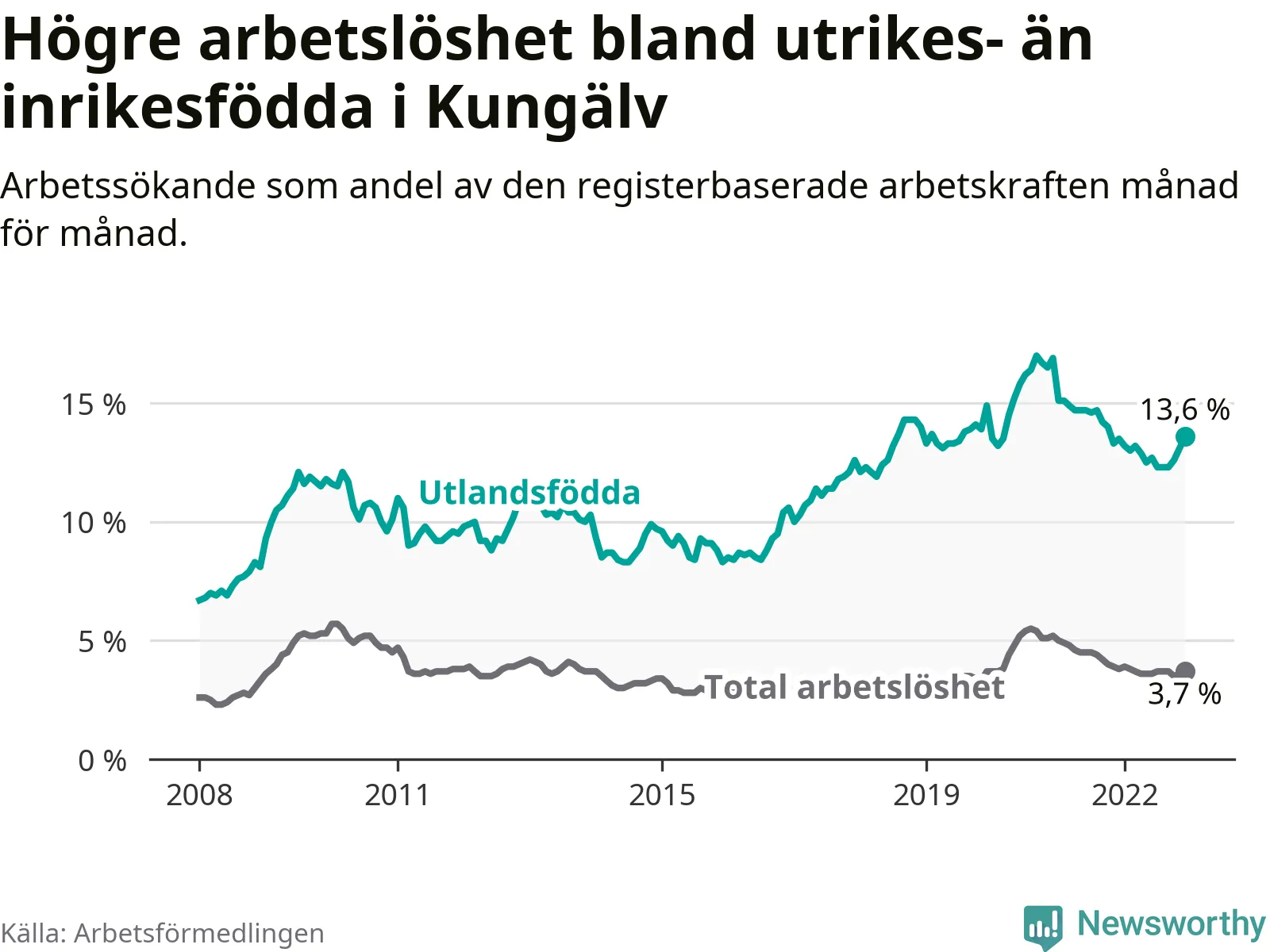 Medan arbetslösheten bland utlandsfödda alltså ökar i Kungälv så minskar den i Västra Götaland. Jämfört med december förra året har andelen arbetslösa utlandsfödda i länet minskat med 1,4 procentenheter (till 15,0 procent). Trots den senaste uppgången har Kungälv med andra ord fortfarande lägre arbetslöshet bland utlandsfödda än Västra Götaland.