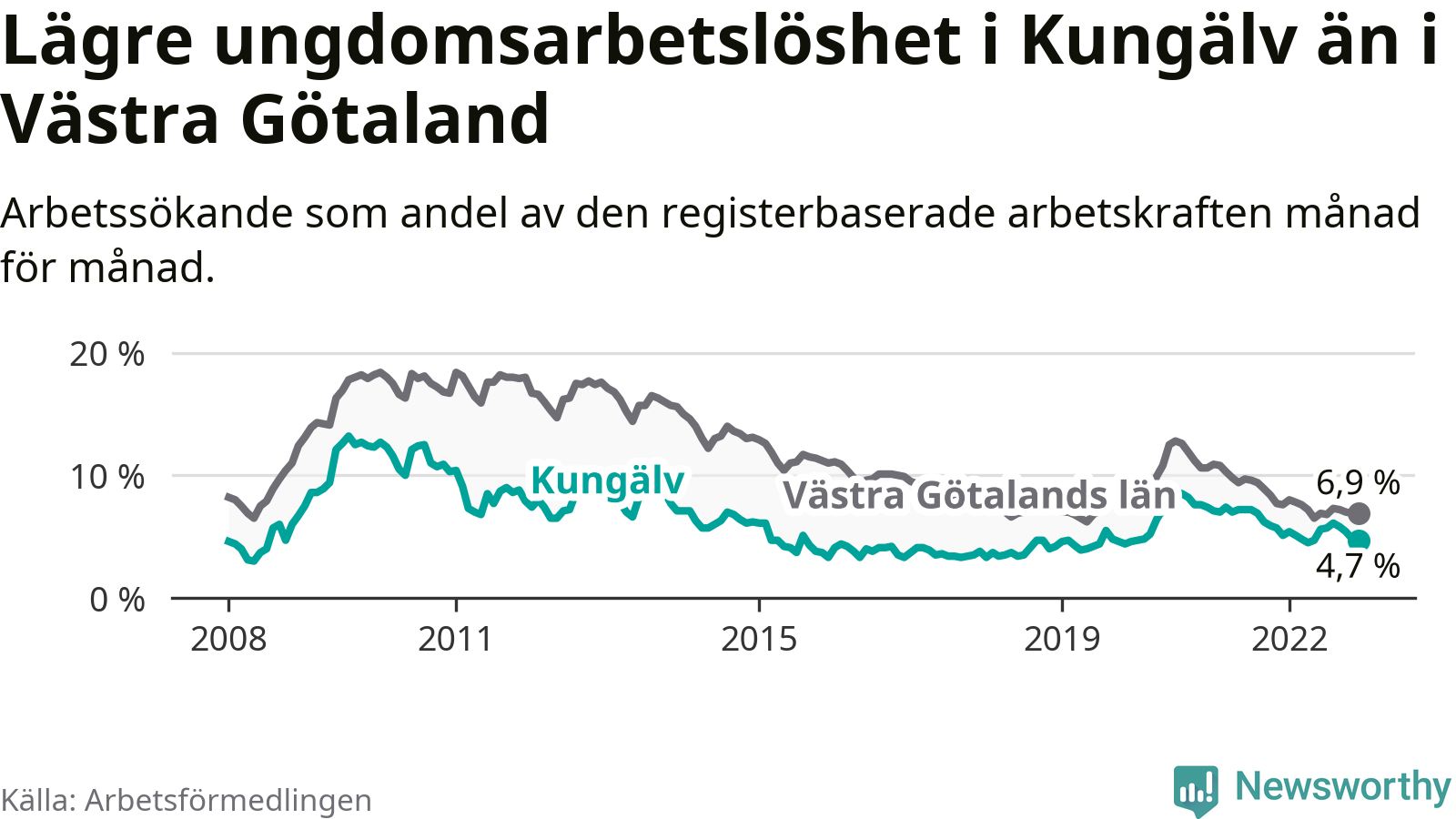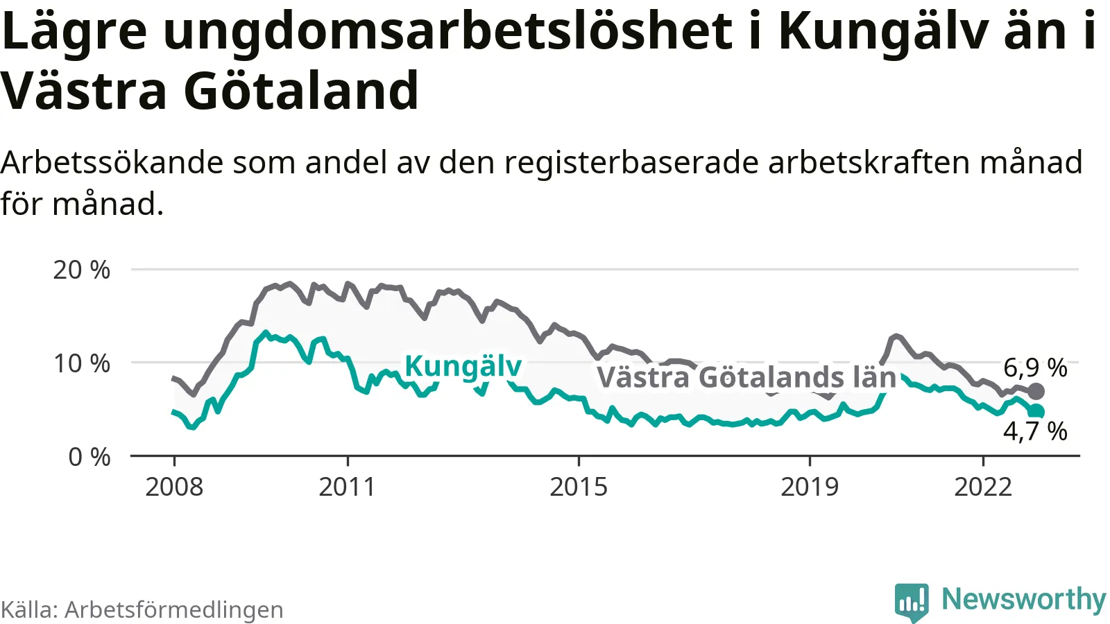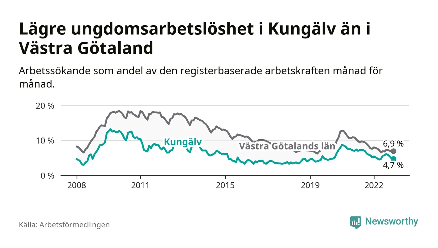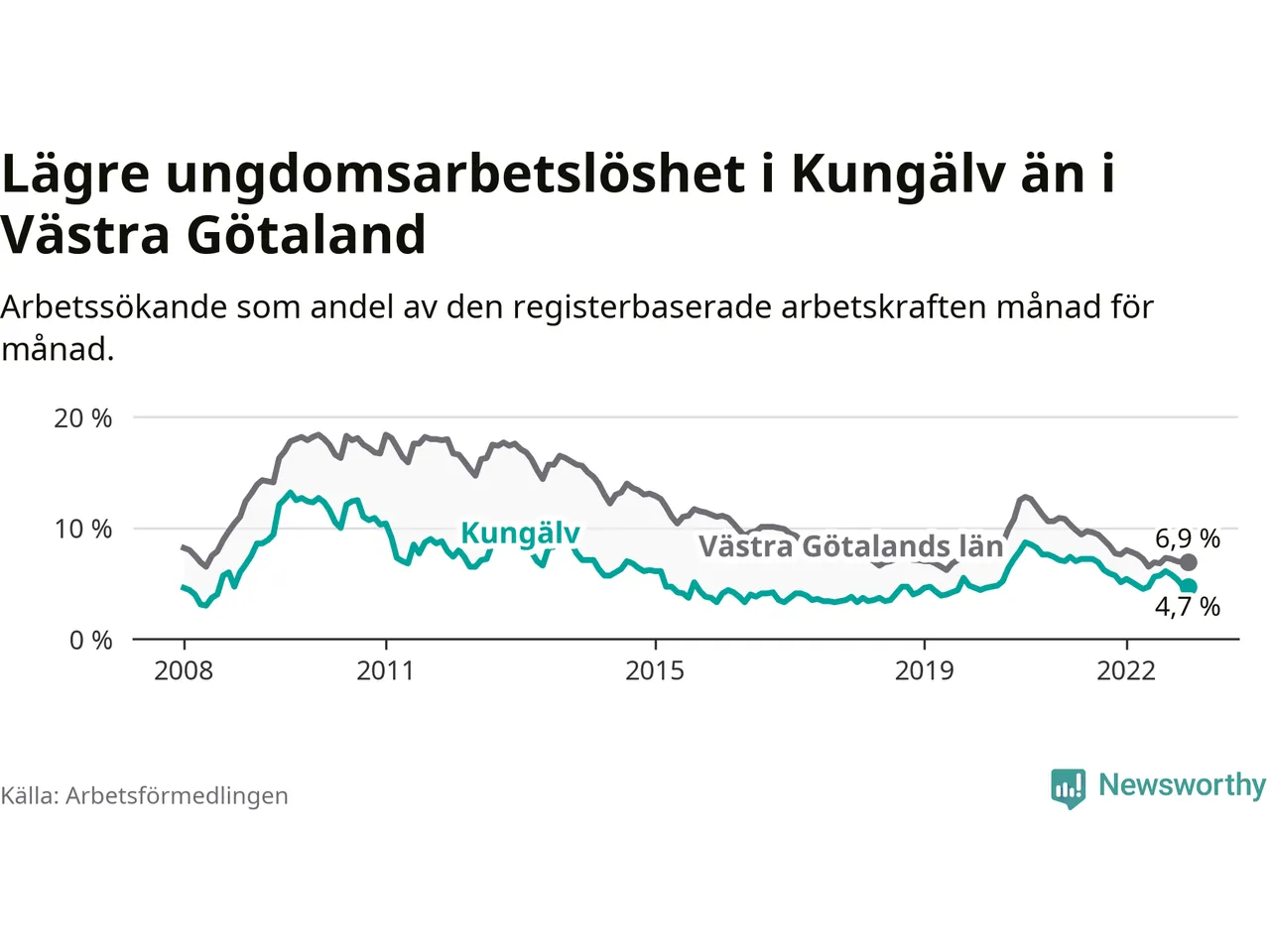 Precis som den totala arbetslösheten ligger ungdomsarbetslösheten i Kungälv lägre än i Västra Götaland som helhet. Skillnaden mellan kommunen och länet är 2,2 procentenheter.