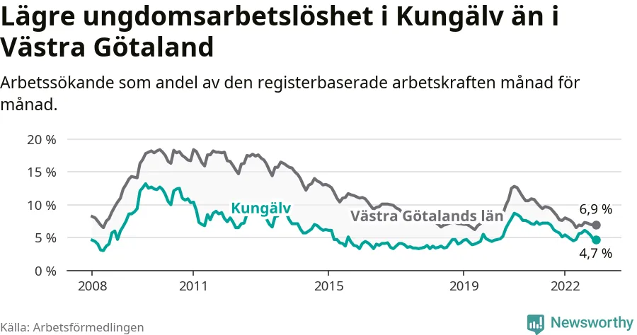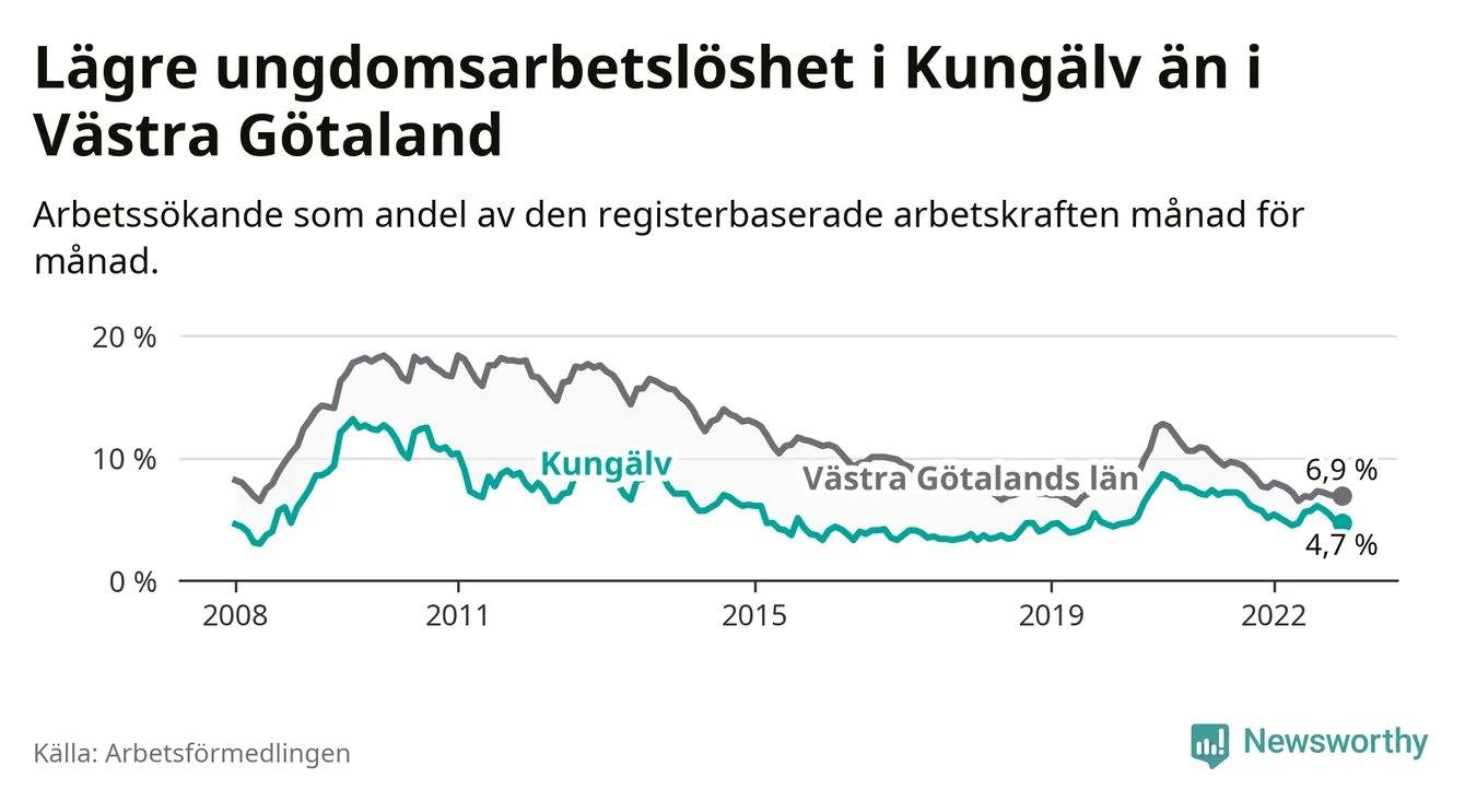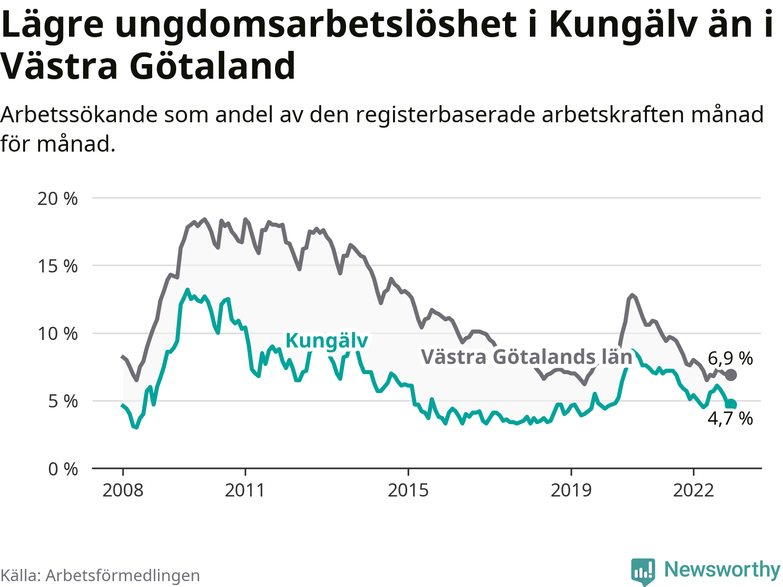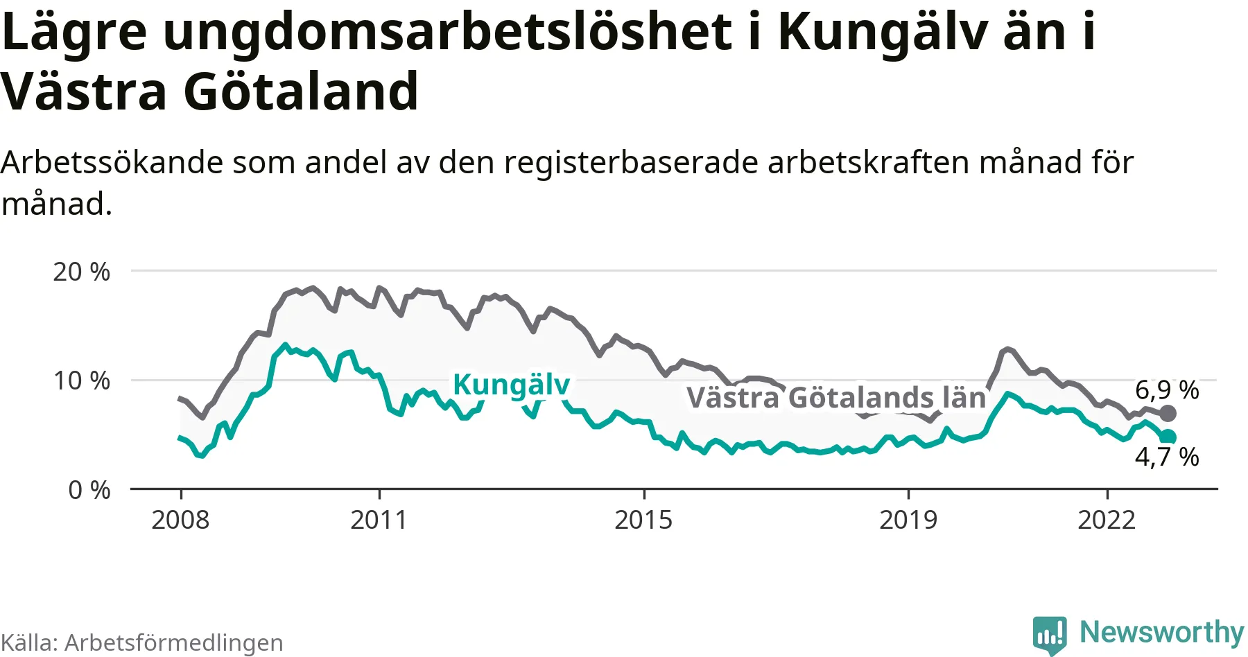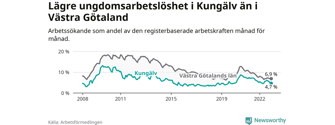 Precis som den totala arbetslösheten ligger ungdomsarbetslösheten i Kungälv lägre än i Västra Götaland som helhet. Skillnaden mellan kommunen och länet är 2,2 procentenheter.