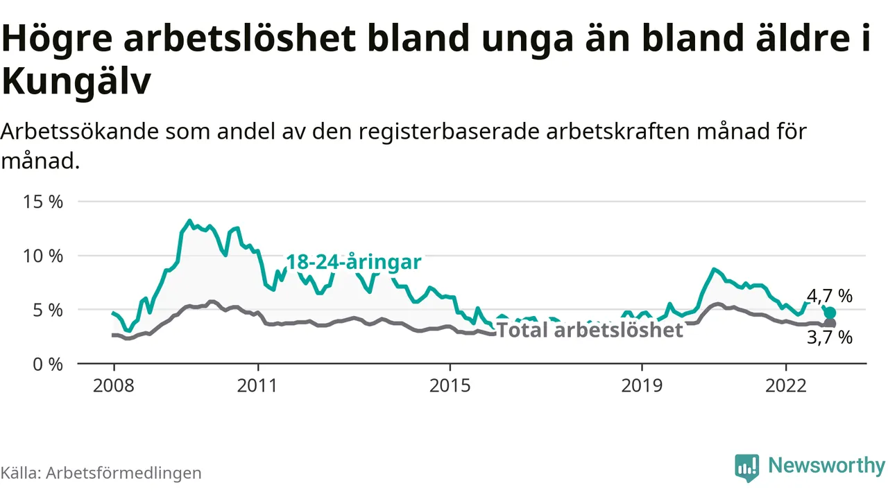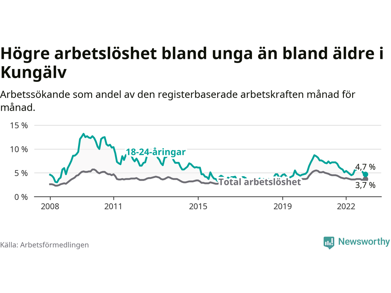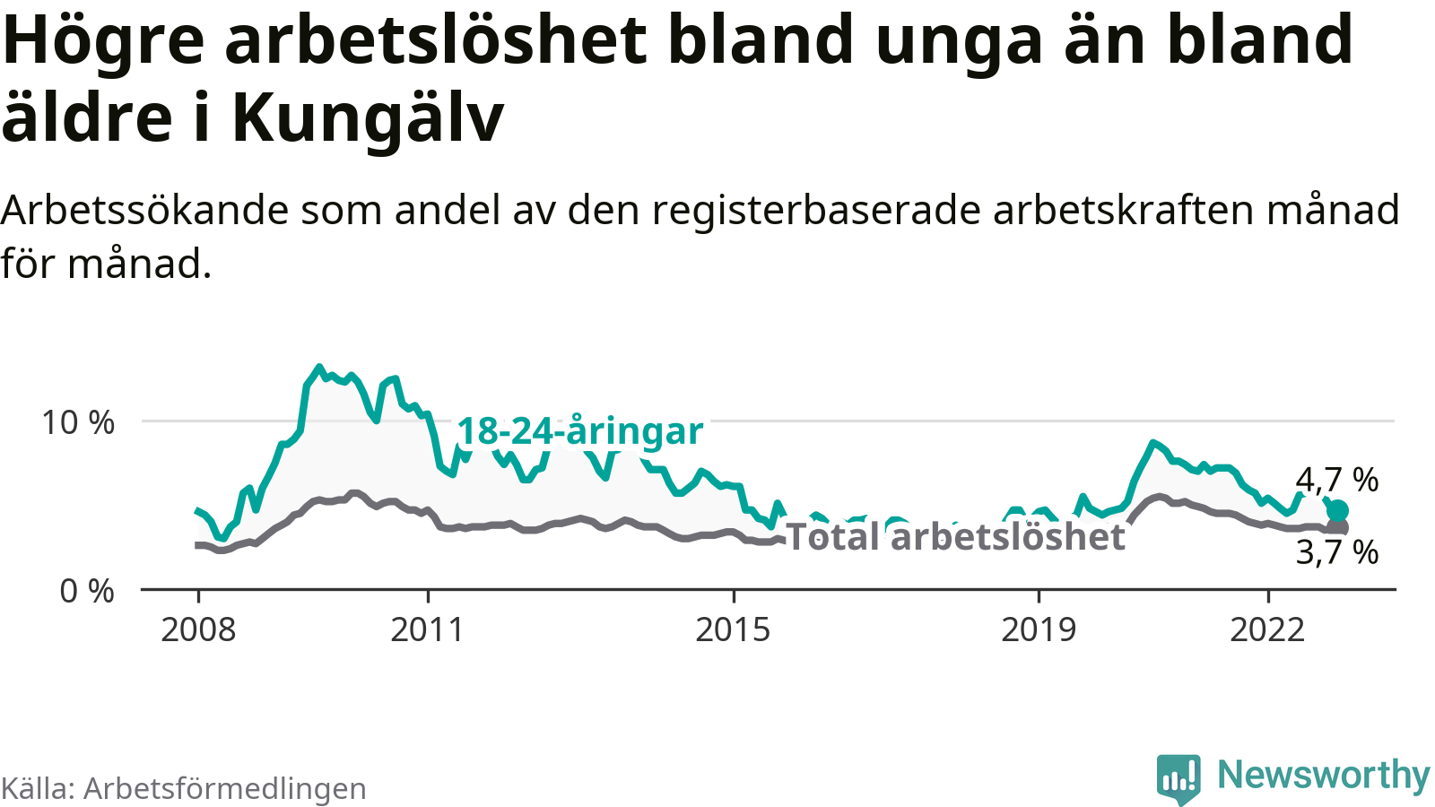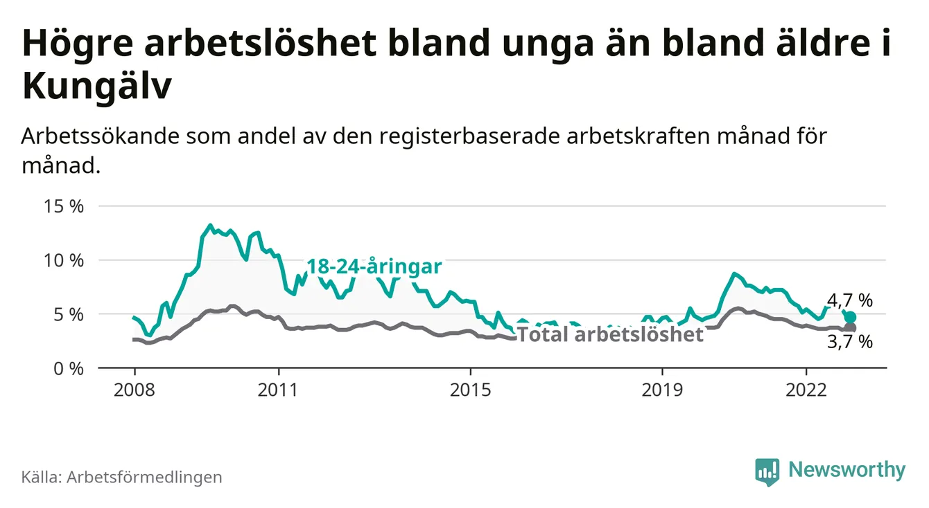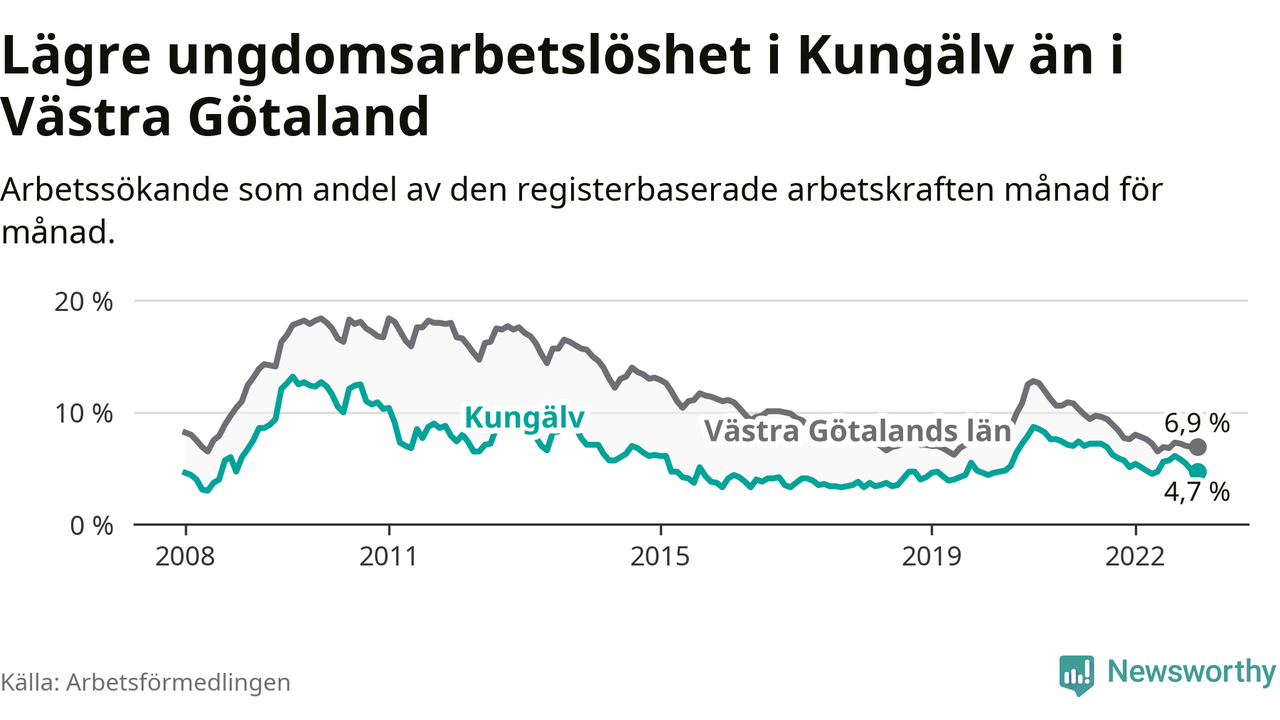 Precis som den totala arbetslösheten ligger ungdomsarbetslösheten i Kungälv lägre än i Västra Götaland som helhet. Skillnaden mellan kommunen och länet är 2,2 procentenheter.
