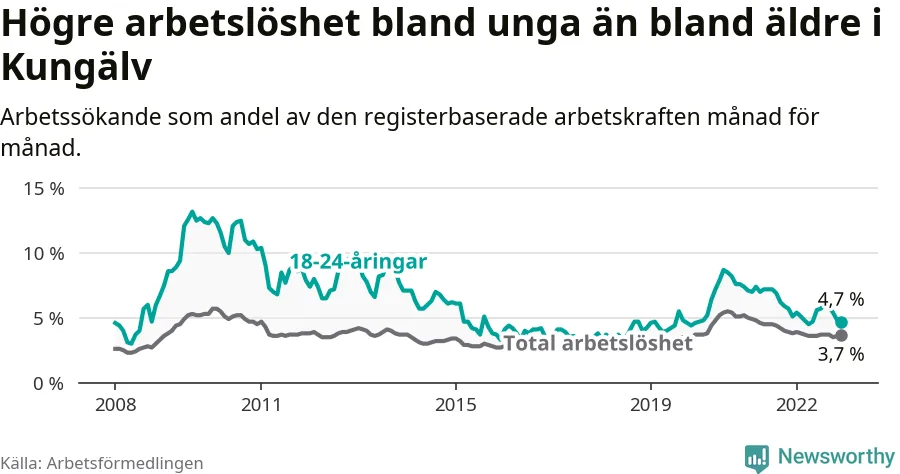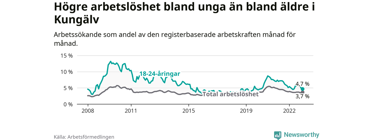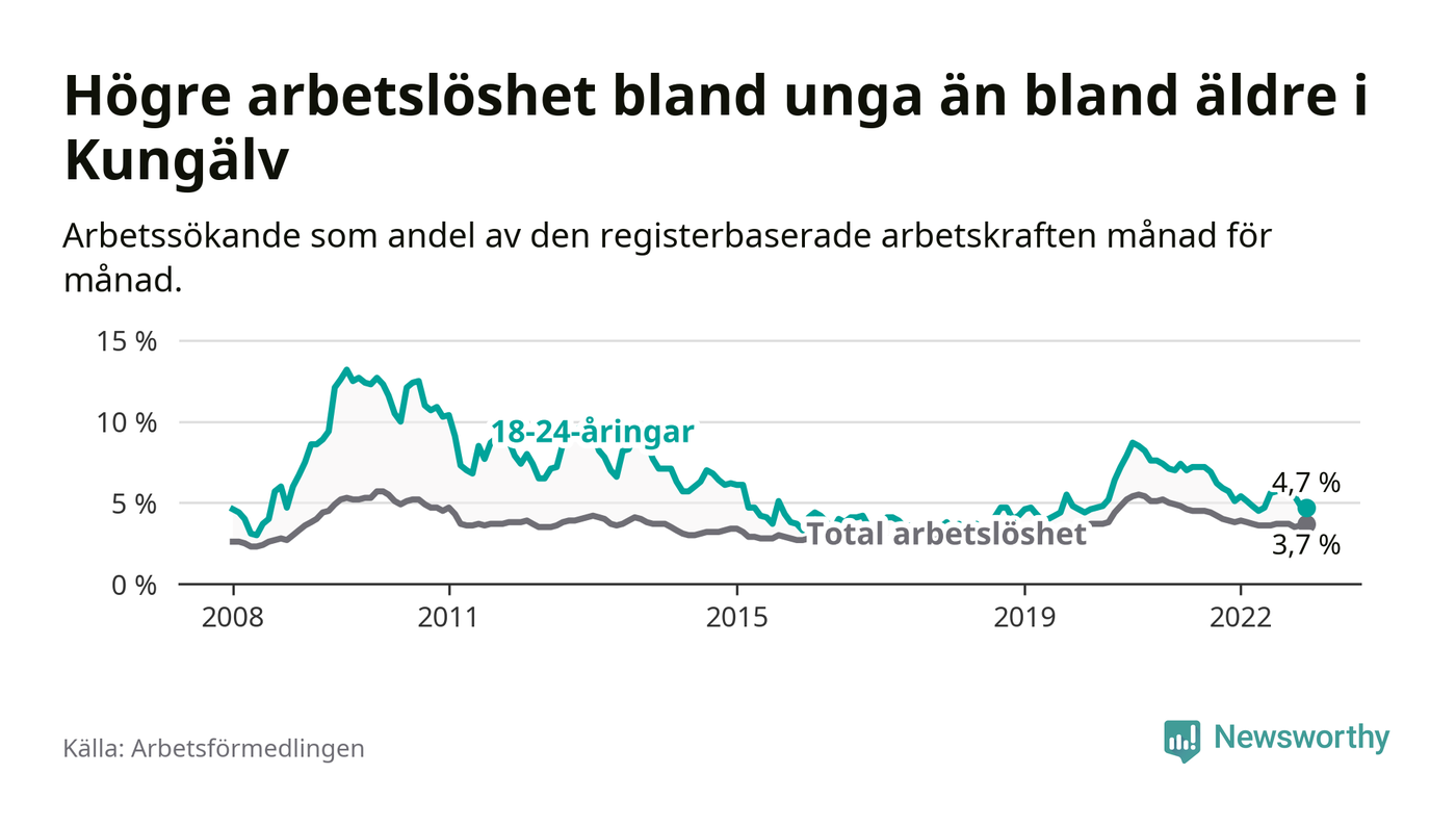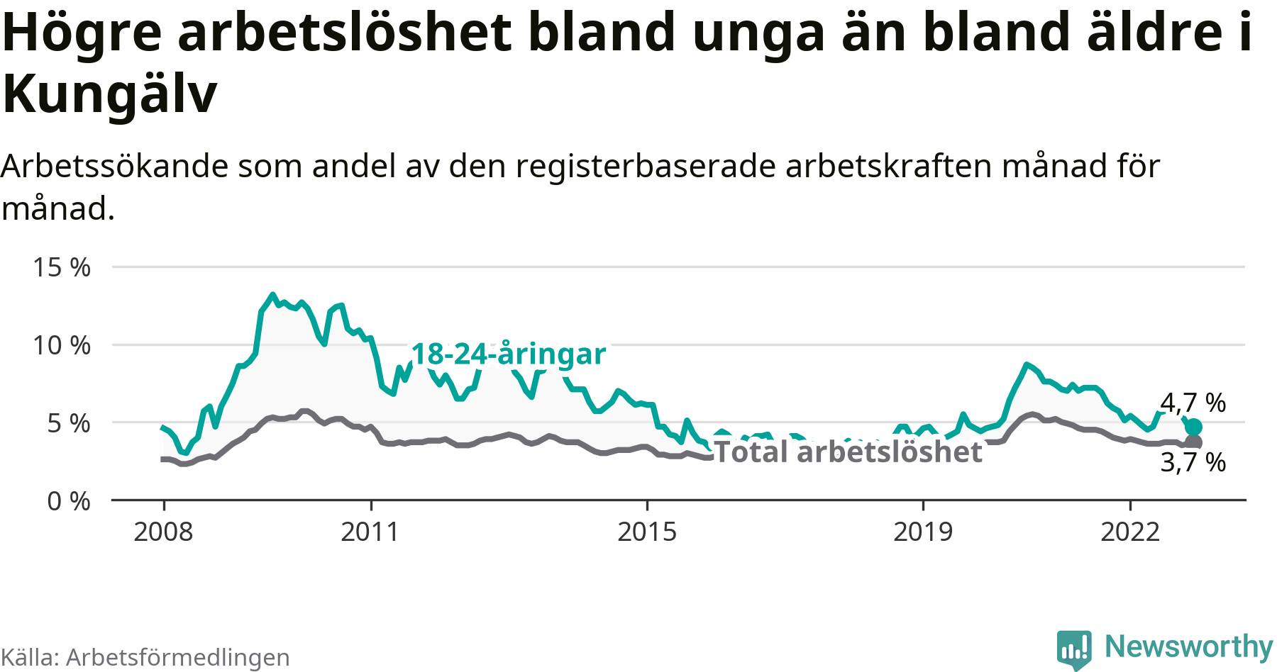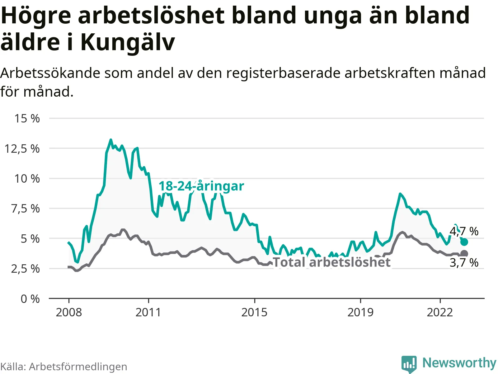 Precis som den totala arbetslösheten ligger ungdomsarbetslösheten i Kungälv lägre än i Västra Götaland som helhet. Skillnaden mellan kommunen och länet är 2,2 procentenheter.