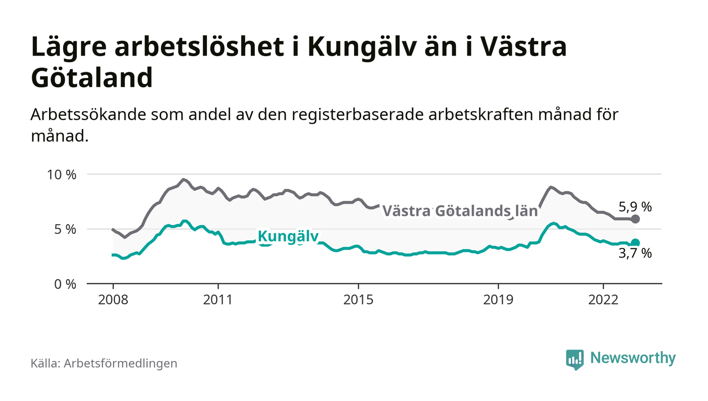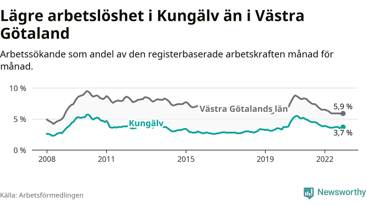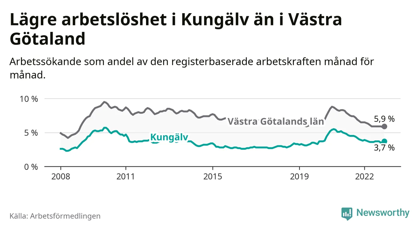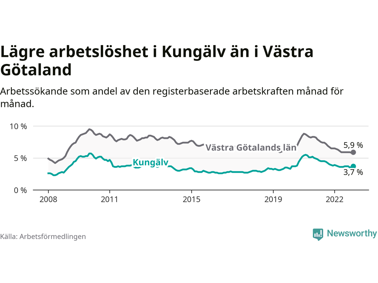 Kungälv hade redan tidigare lägre arbetslöshet än snittet i hela Västra Götalands län och nu växer klyftan (3,7 procent i kommunen, jämfört med 5,9 procent i hela länet). Tjörn och Öckerö har den lägsta arbetslösheten i länet (2,6 procent), medan Trollhättan har den högsta (9,1 procent). För att Kungälv skulle komma ner i samma arbetslöshetsnivå som Tjörn och Öckerö skulle 258 personer behöva sysselsättas.