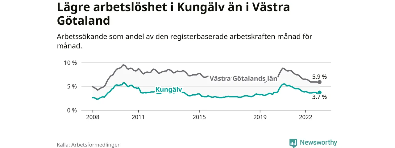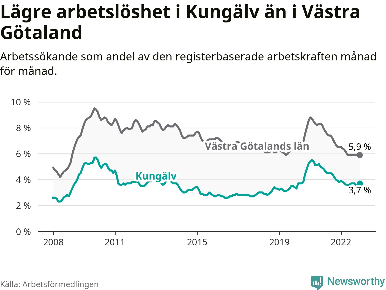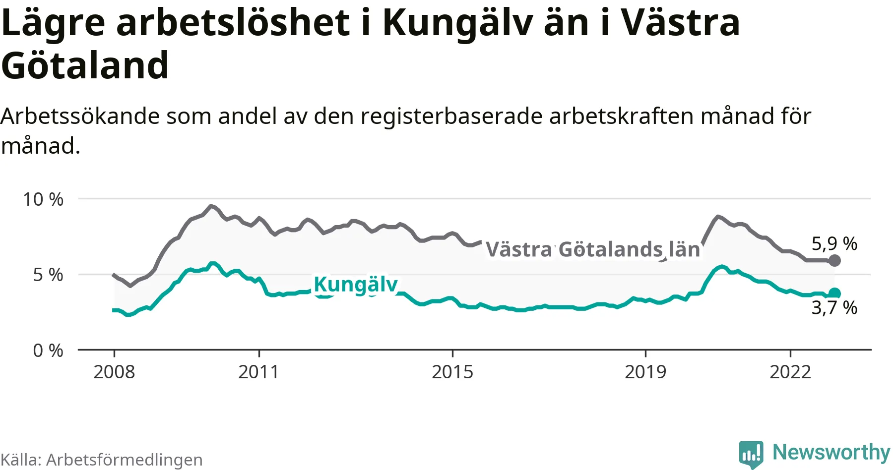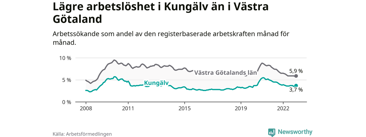 Kungälv hade redan tidigare lägre arbetslöshet än snittet i hela Västra Götalands län och nu växer klyftan (3,7 procent i kommunen, jämfört med 5,9 procent i hela länet). Tjörn och Öckerö har den lägsta arbetslösheten i länet (2,6 procent), medan Trollhättan har den högsta (9,1 procent). För att Kungälv skulle komma ner i samma arbetslöshetsnivå som Tjörn och Öckerö skulle 258 personer behöva sysselsättas.