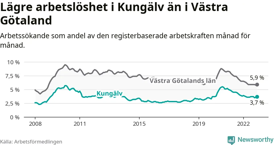 Under december månad rapporterade Kungälvs kommun en total arbetslöshet på 3,7 procent. Det är en minskning jämfört med samma tidpunkt i fjol (−0,1 procentenheter). Även i Västra Götalands län sjunker arbetslösheten .
