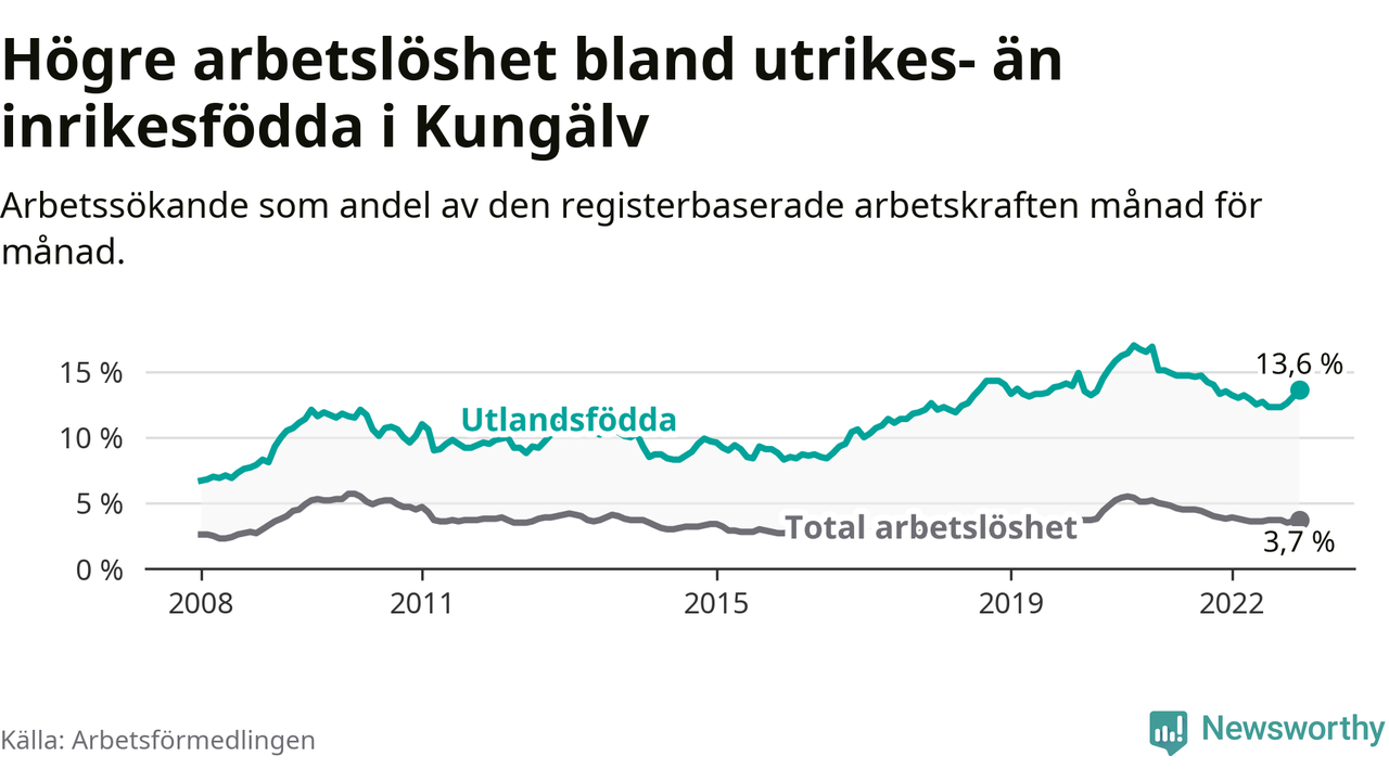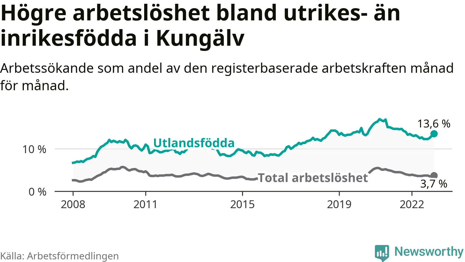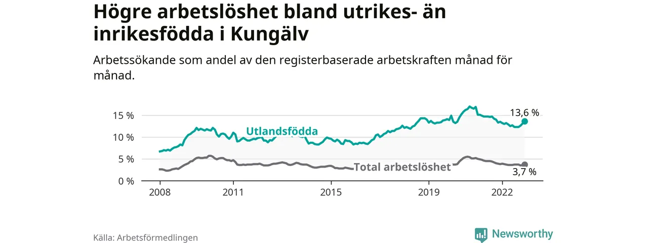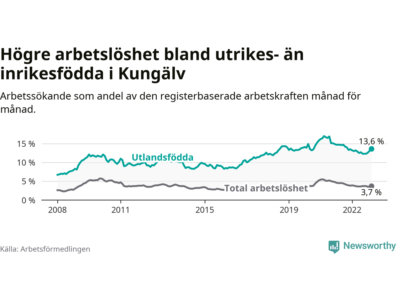 Arbetslösheten bland utlandsfödda var 13,6 procent i Kungälv under december månad, motsvarande 417 av 3 066 personer. Det är 0,1 procentenheter fler än vid samma tidpunkt i fjol (+20 om man räknar personer). Den senaste månadens uppgång innebär ett trendbrott. Under de 19 föregående månaderna hade arbetslösheten bland utlandsfödda varit lägre än motsvarande tidpunkt året innan.